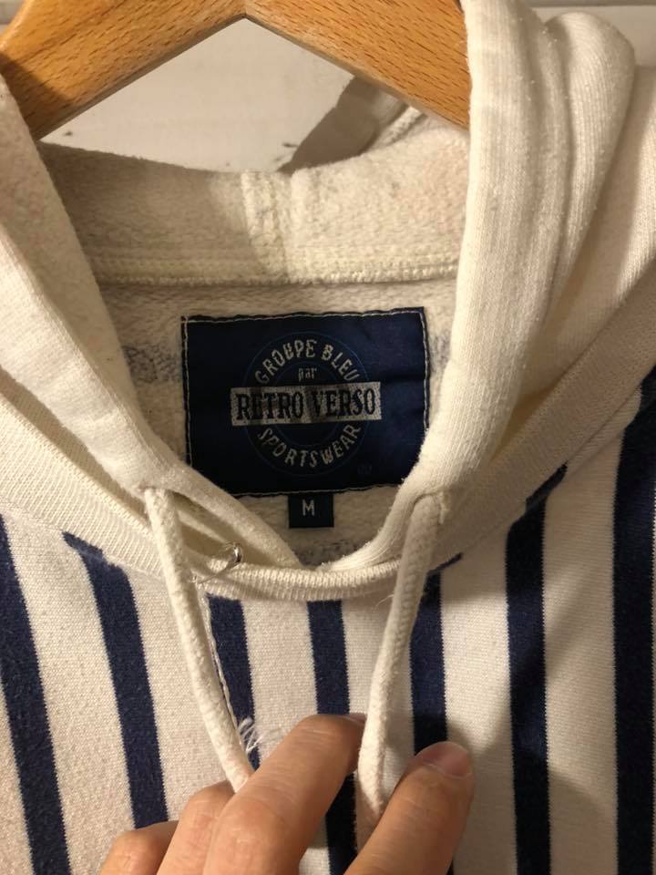 生地は、厚手のスウェット仕様。肩幅は、広めにデザインされている。アームは、幅広のドルマンスリーブ。ボーダーのデザインも縦と横があってユニークなデザイン。