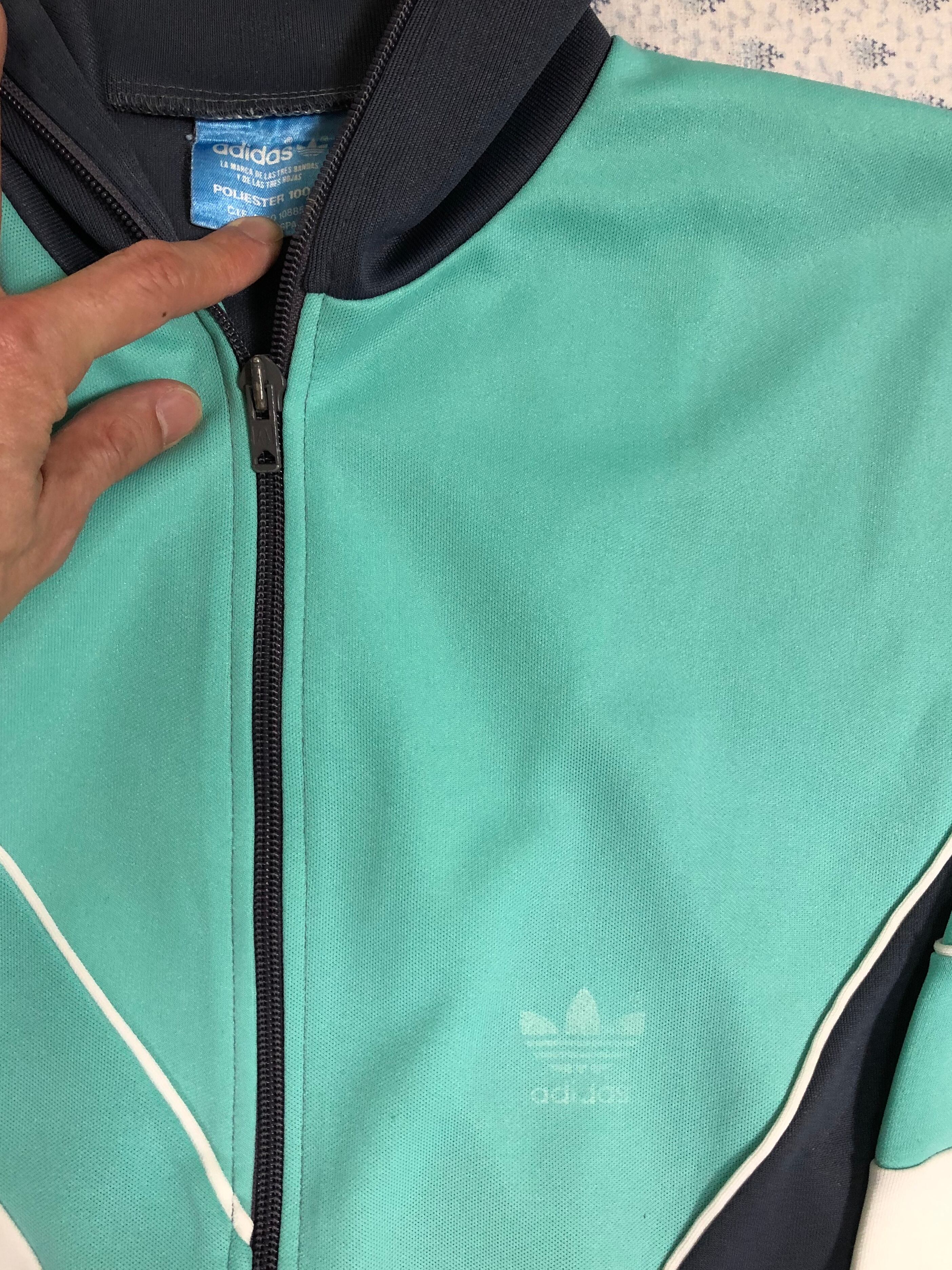 アディダス80'sヴィンテージ ジャージ。スペイン製。肩幅69 身幅62 着丈68 袖丈55 80'sらしいドルマンスリーブ。肩幅が広い分だけ袖丈は、短めにデザインされている。