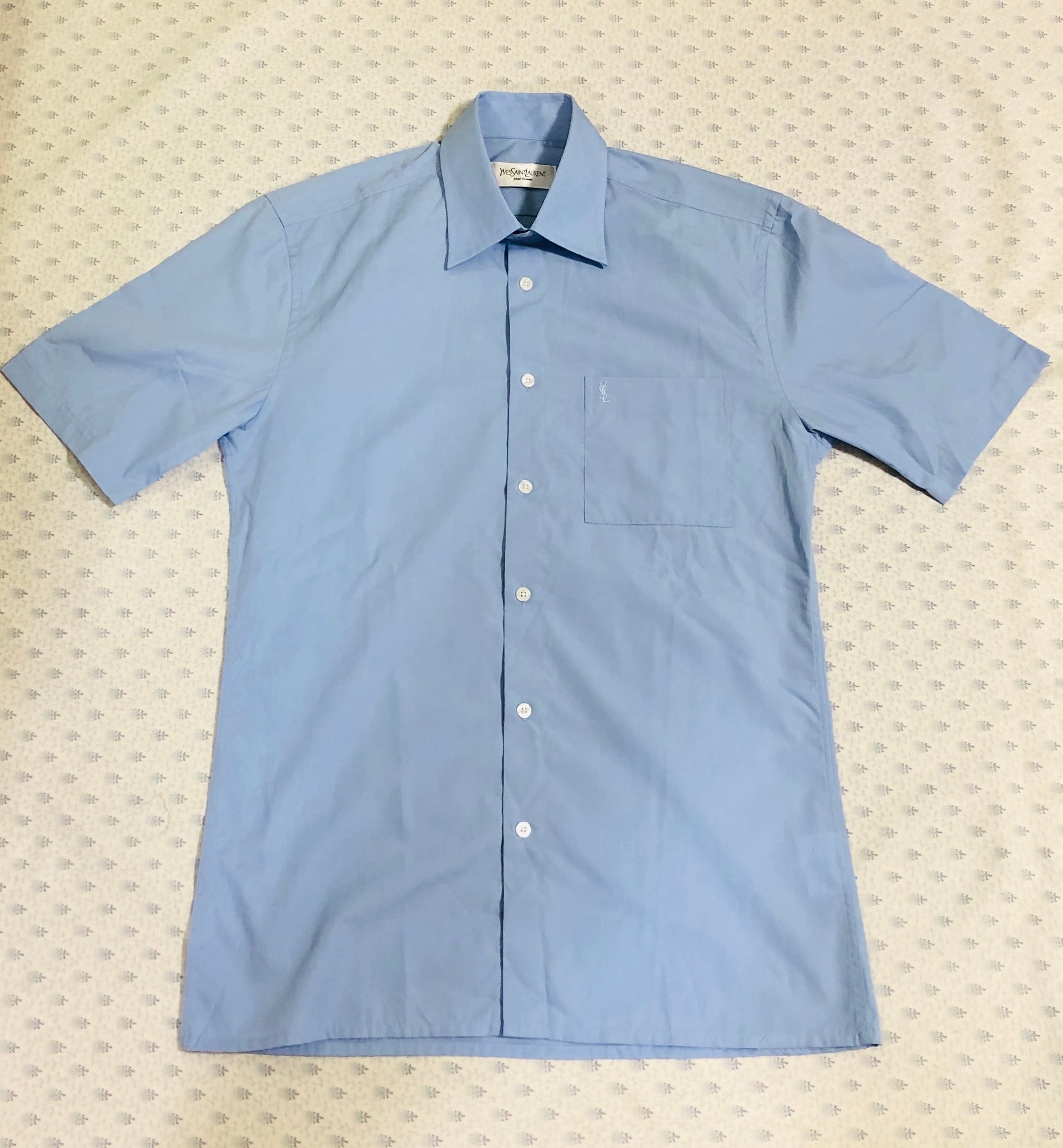 イブサンローラン半袖シャツ。水色。肩幅45 身幅51 着丈75 袖丈26 デッドストック。やや細身のシルエット。フランス製