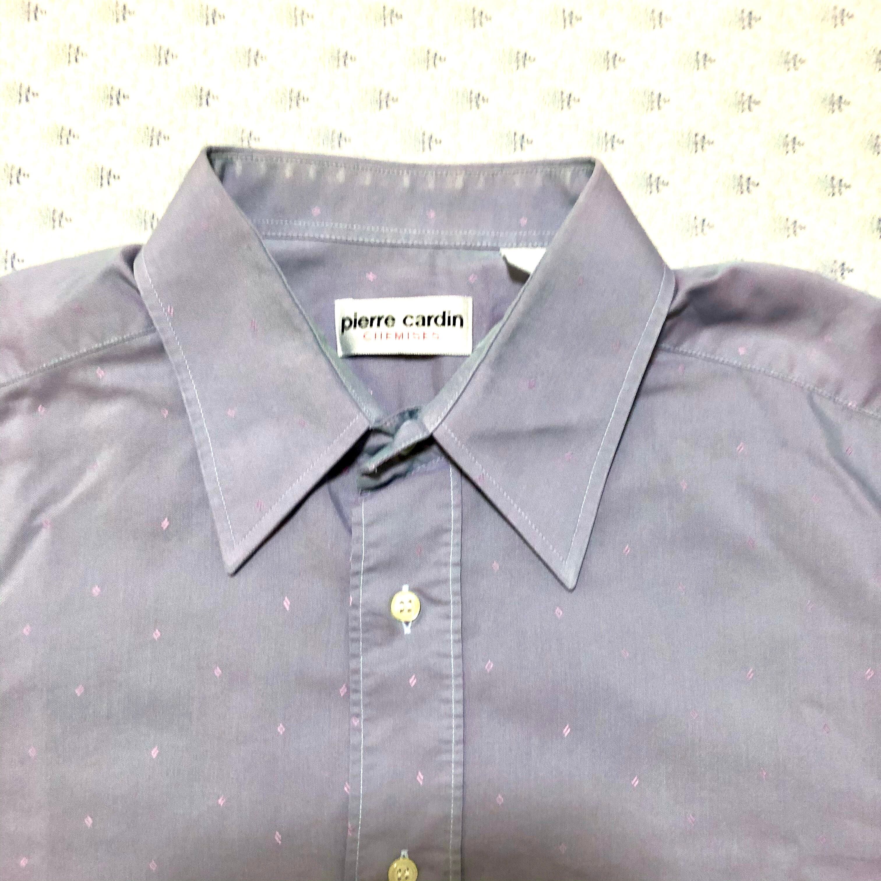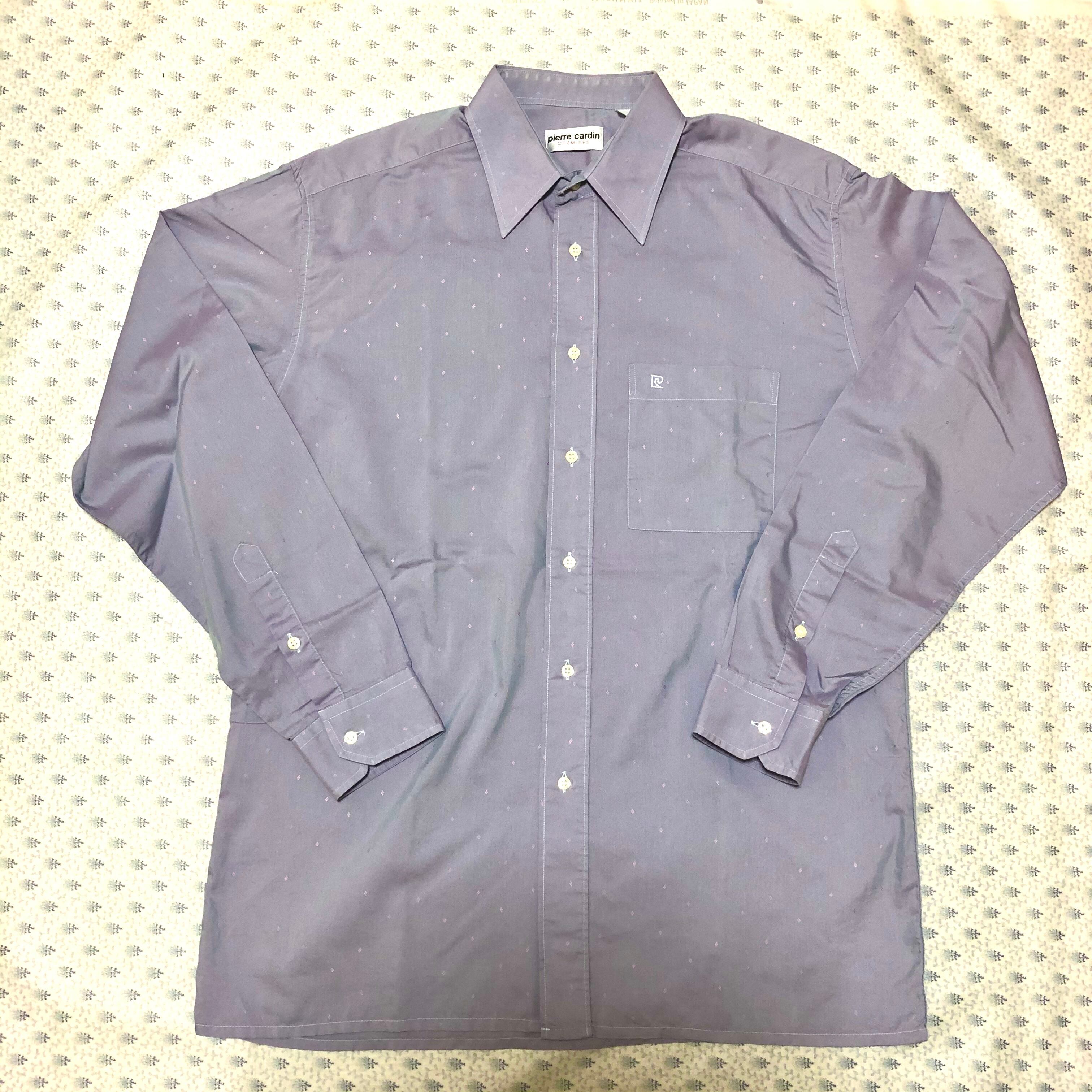ピエールカルダンのピンクのドット柄のドレスシャツ。フランス製。ベースのシャツの色は、うすいムラサキとピンクの糸で編み込まれていて、生地に独特の光沢が出ている。フランス製。肩幅49身幅57 着丈76 袖丈63 素材は、タグ印字が消えて見えないが、おそらくコットン100%