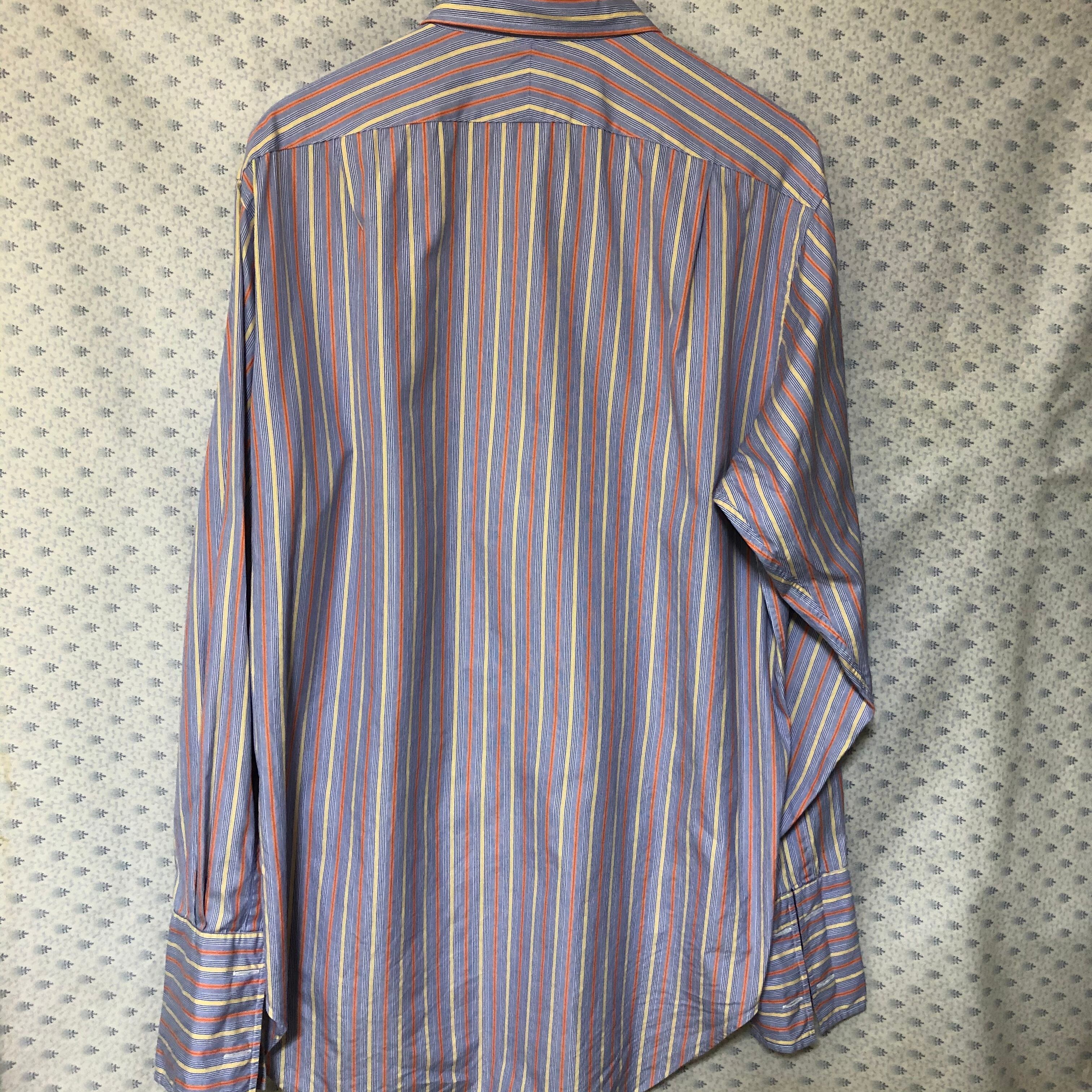 ブルー×オレンジ×イエローのストライプシャツ。