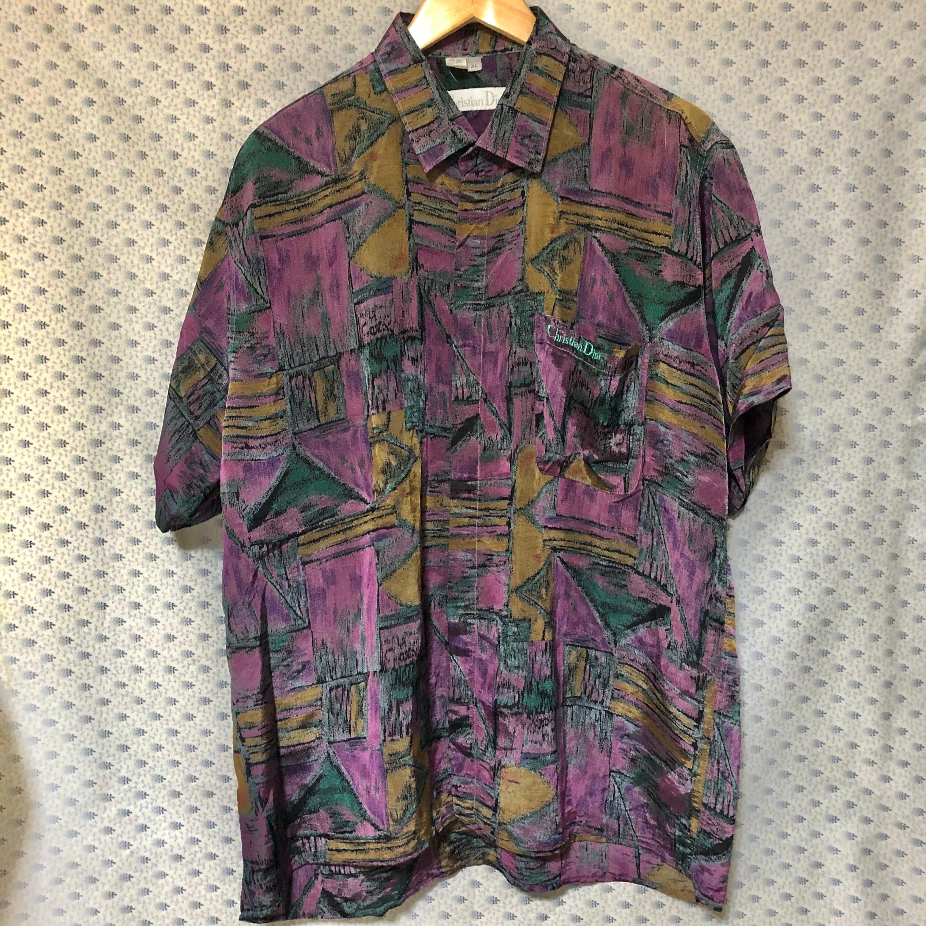 クリスチャンディオール半袖柄シャツ。シルク素材。肩幅50 身幅64 着丈78 袖丈25.5 サイズ表記XL