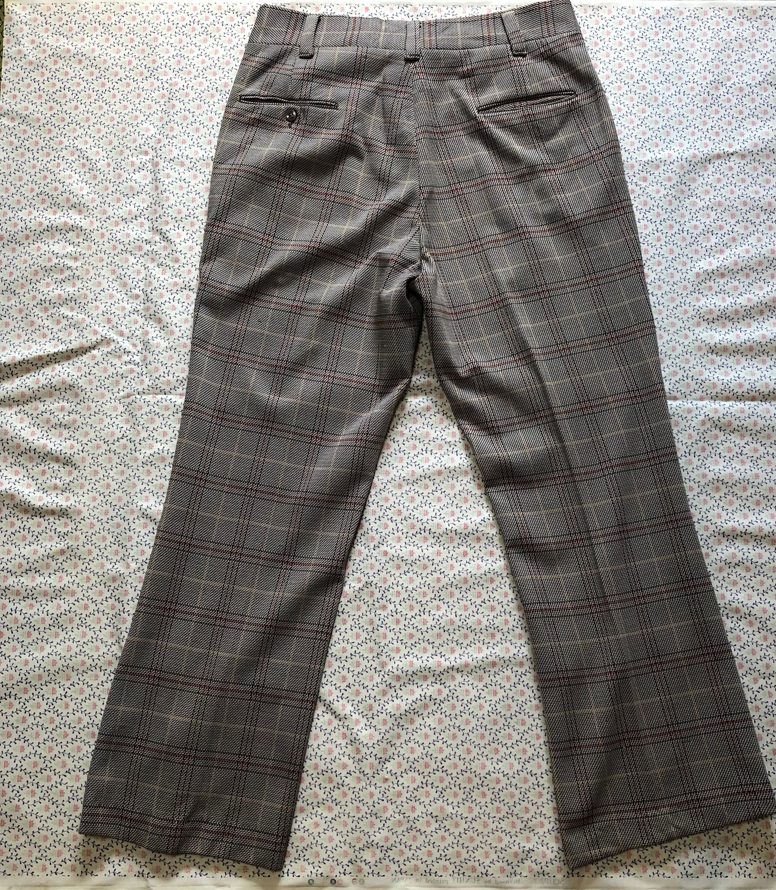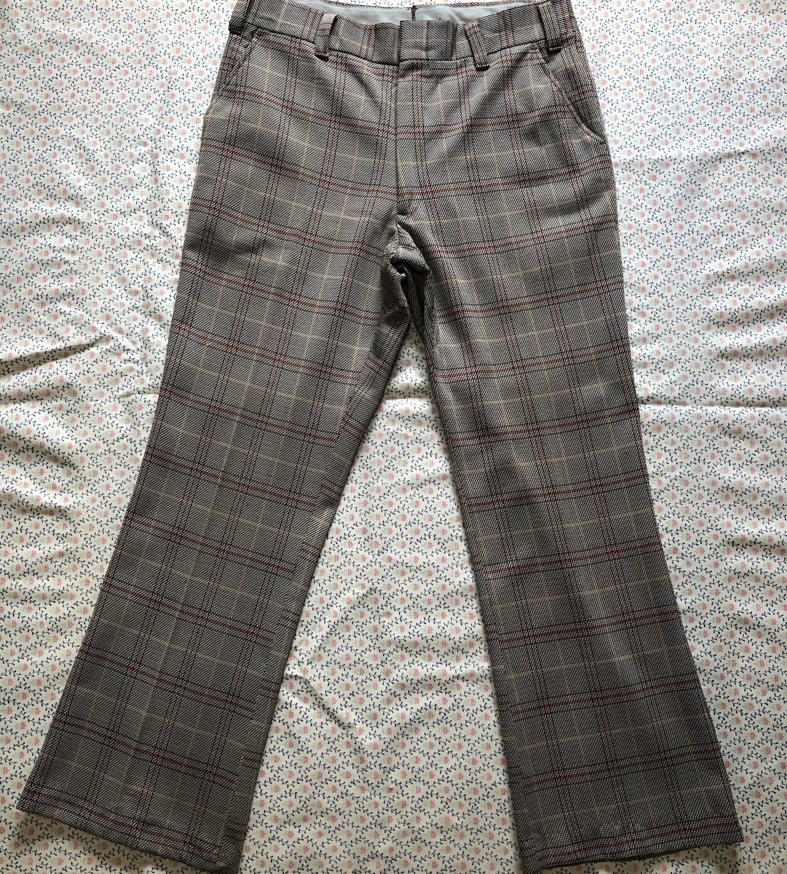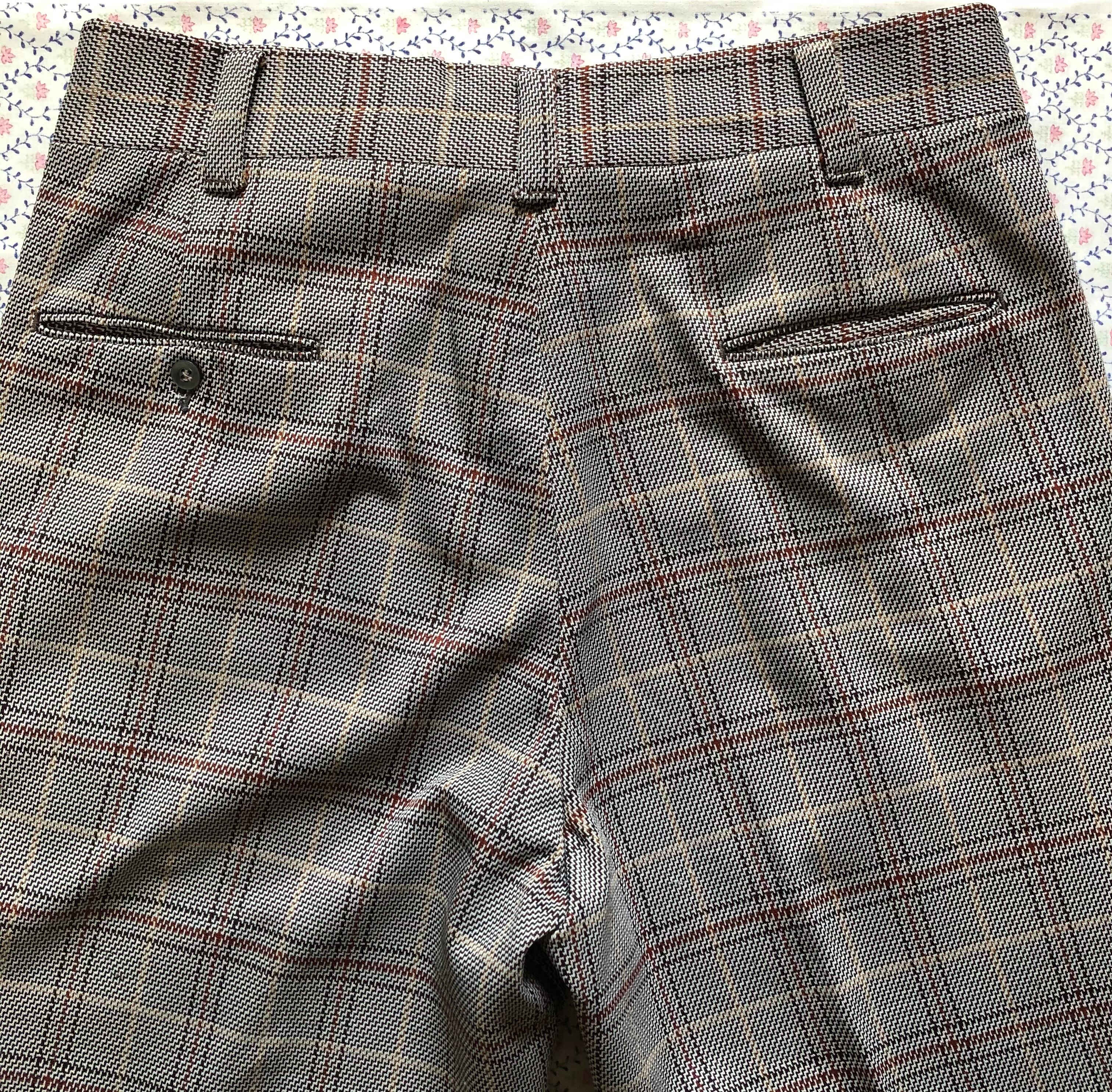 60's〜70'sヴィンテージ ポリエステル100% シルエットは、フレア。ウエスト84 ヒップ108 太腿幅31 膝幅24 裾幅26 股下75