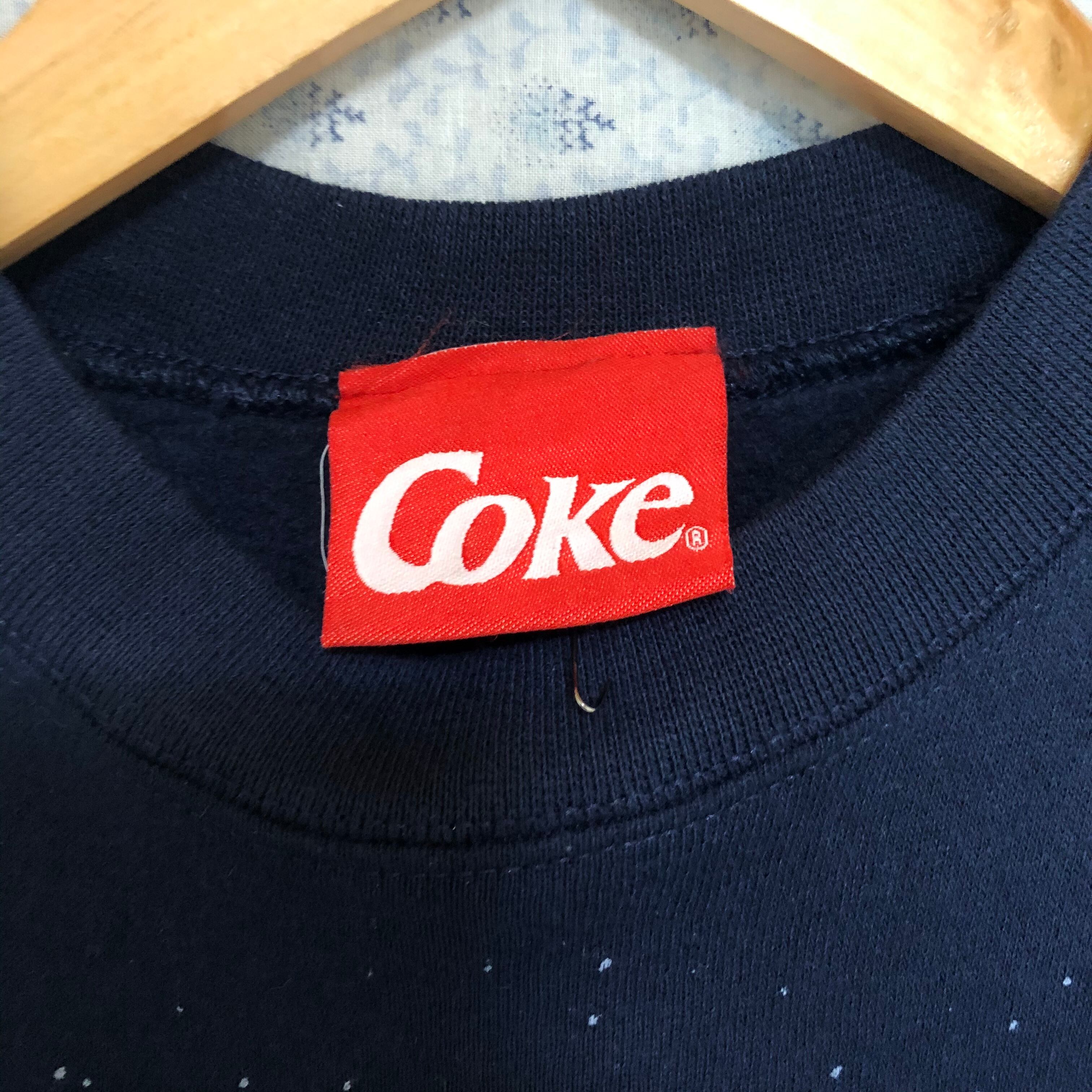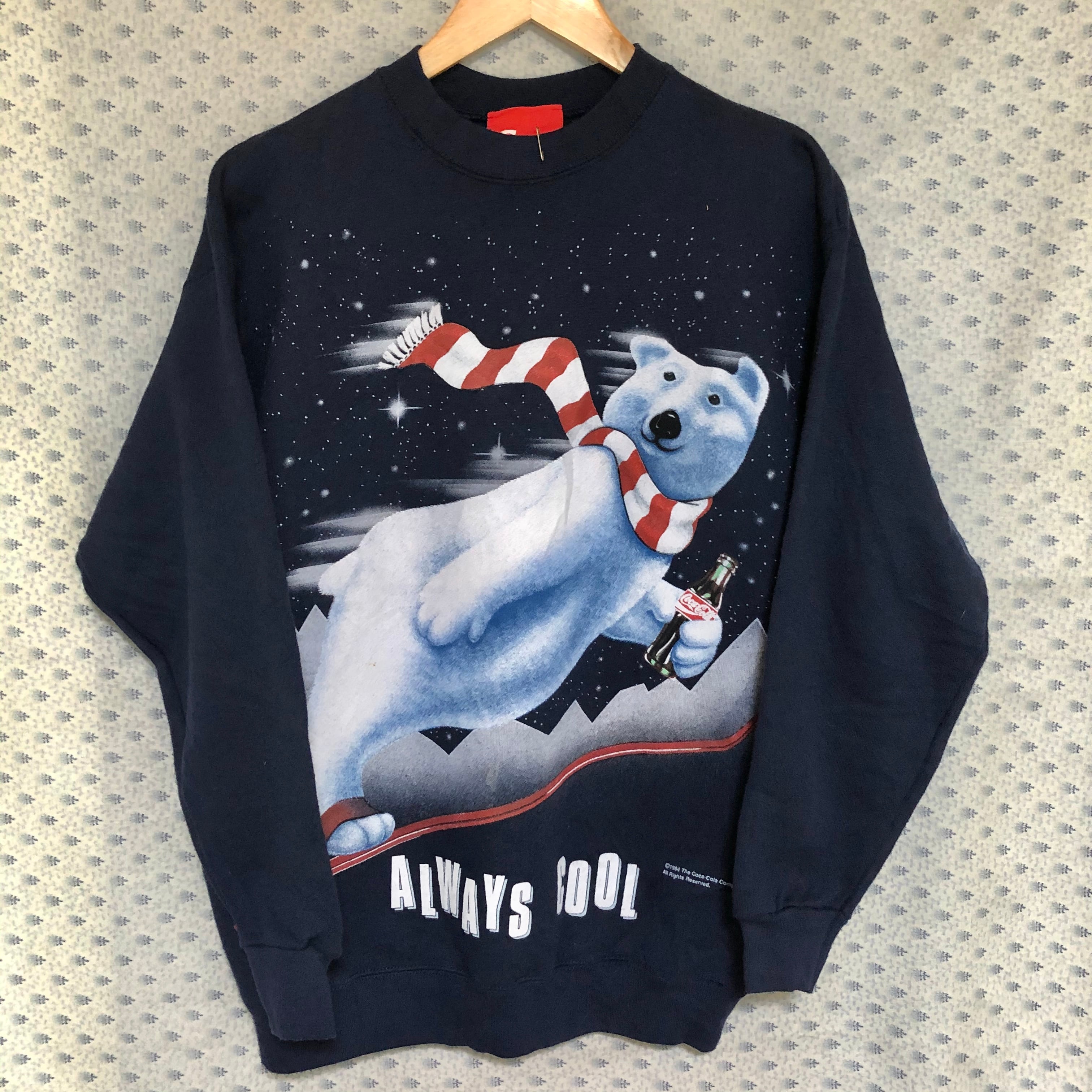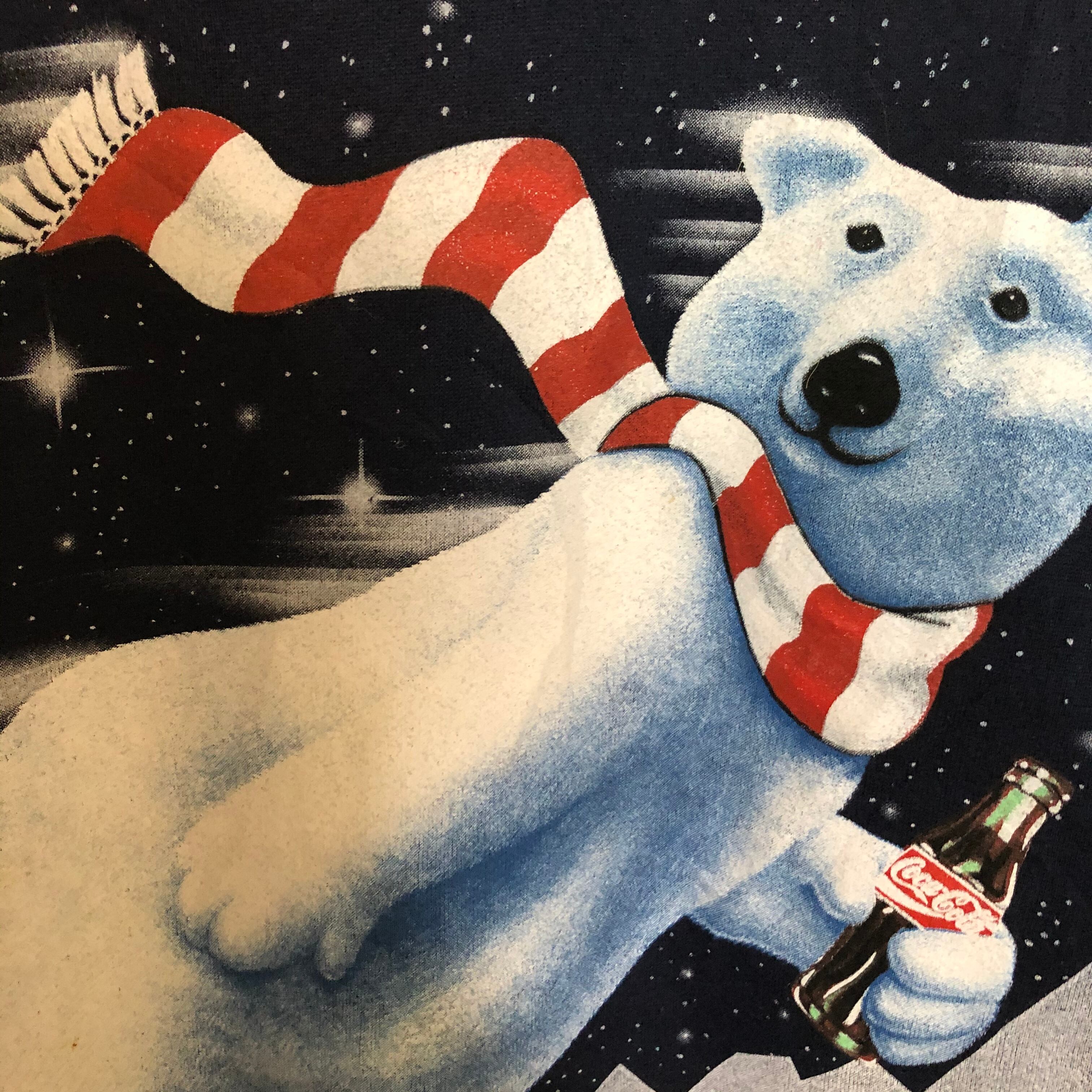 90's コカコーラ白熊柄スウェット。アメリカ製。サイズ表記M。裏起毛。コットン50%ポリエステル50% ネイビー地にマフラーを巻いた白熊柄。肩幅52 身幅50.5 着丈66 袖丈53