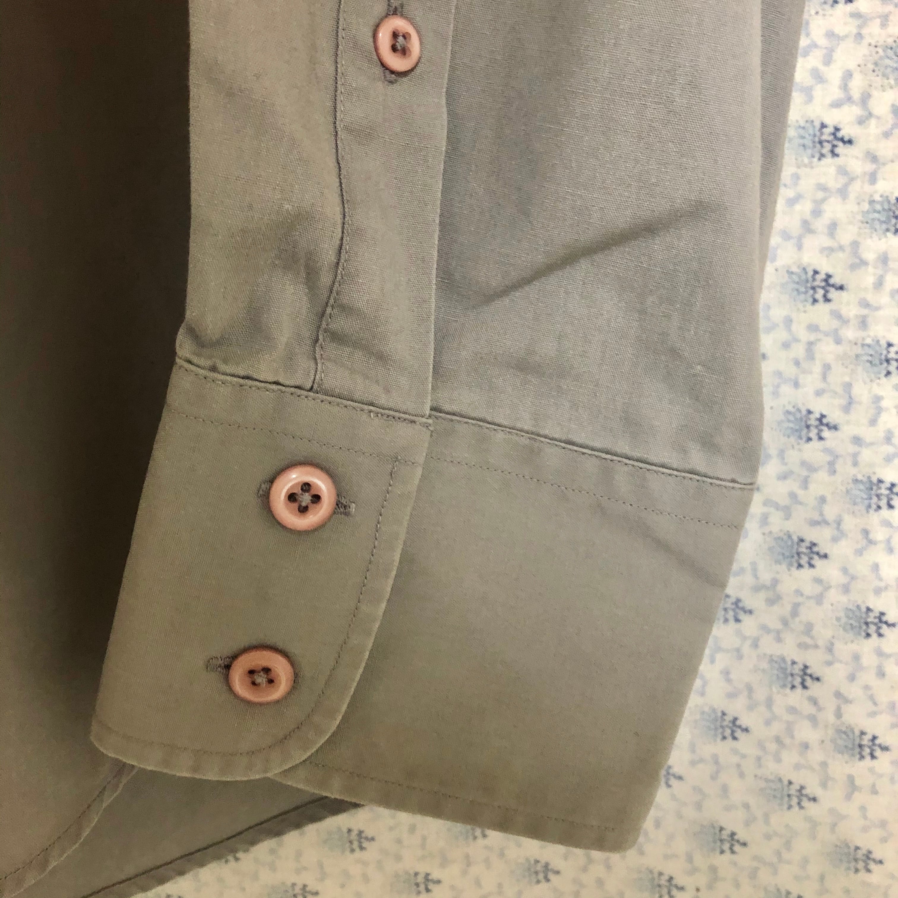 イブサンローランボタンダウンシャツ。色は、グレーに、赤茶とグレーが混ざったような色のボタン。胸ポケットには、イブサンローランのロゴの刺繍がある。サイズ表記41 肩幅49 身幅62 着丈78