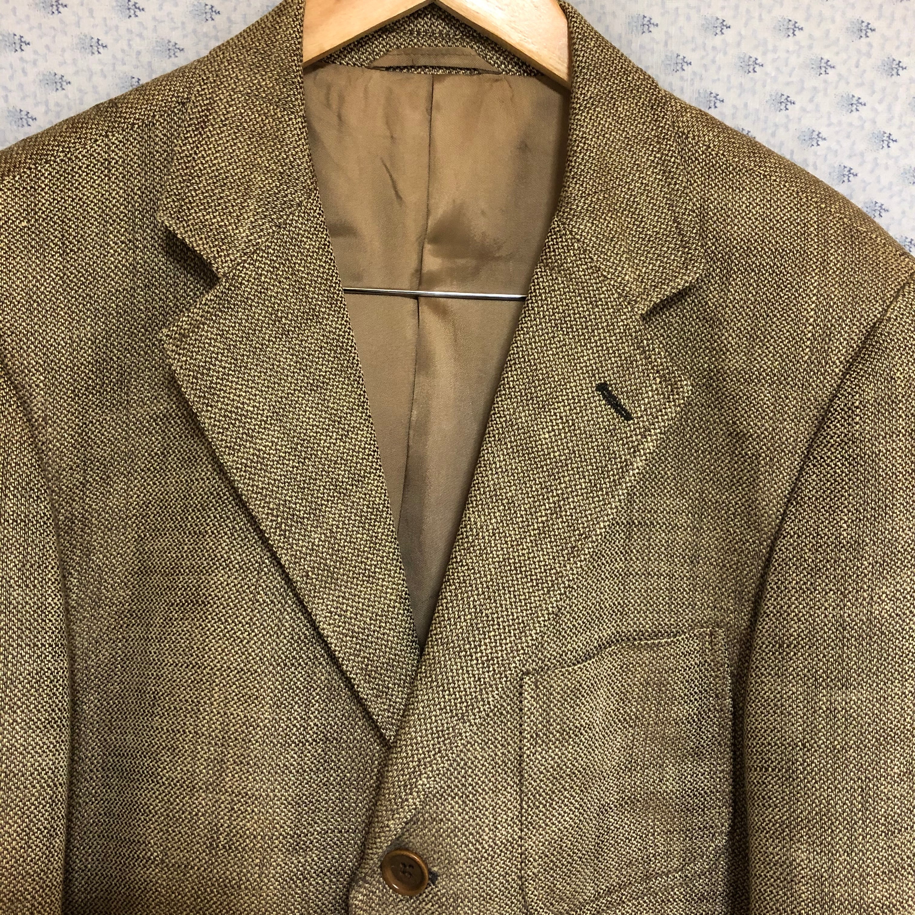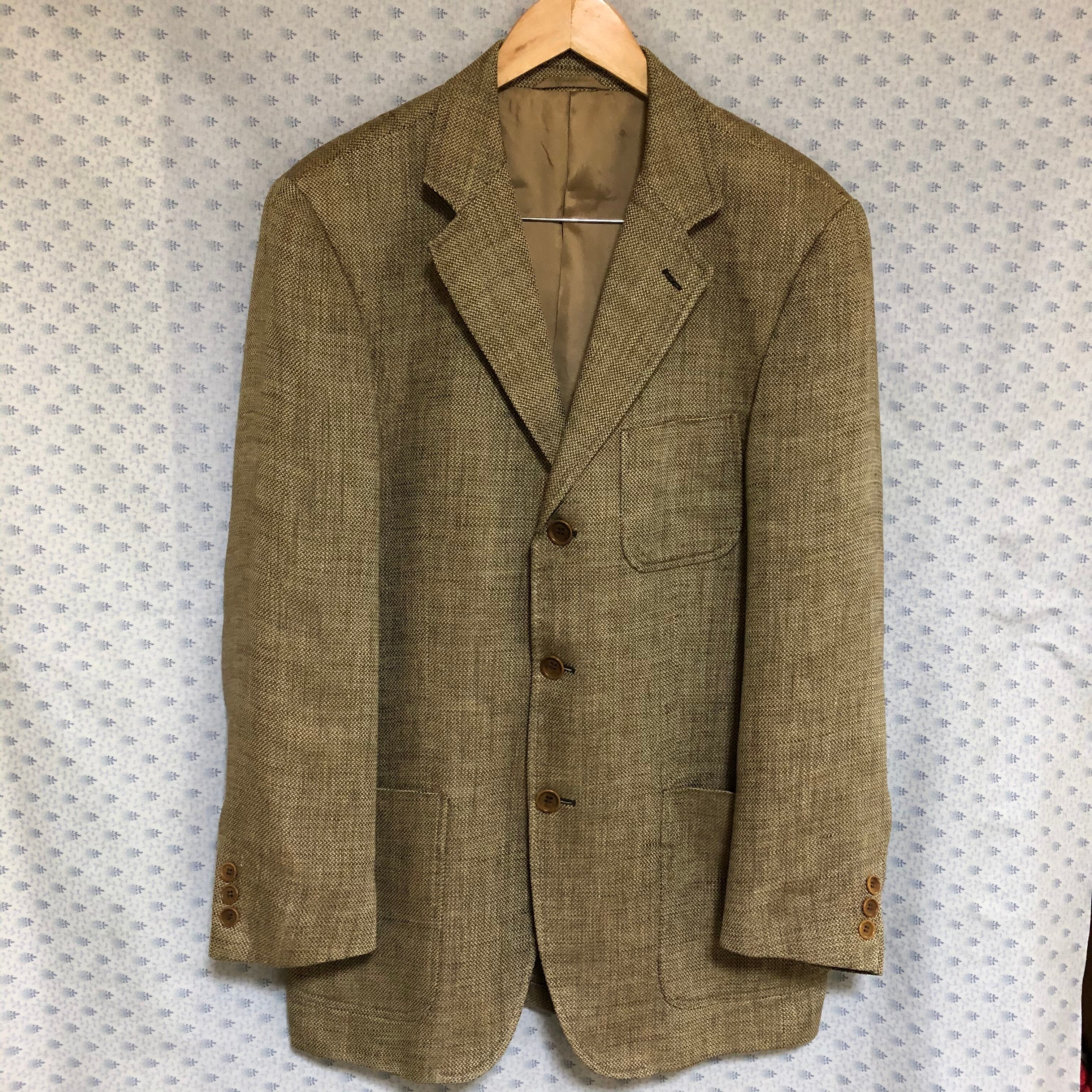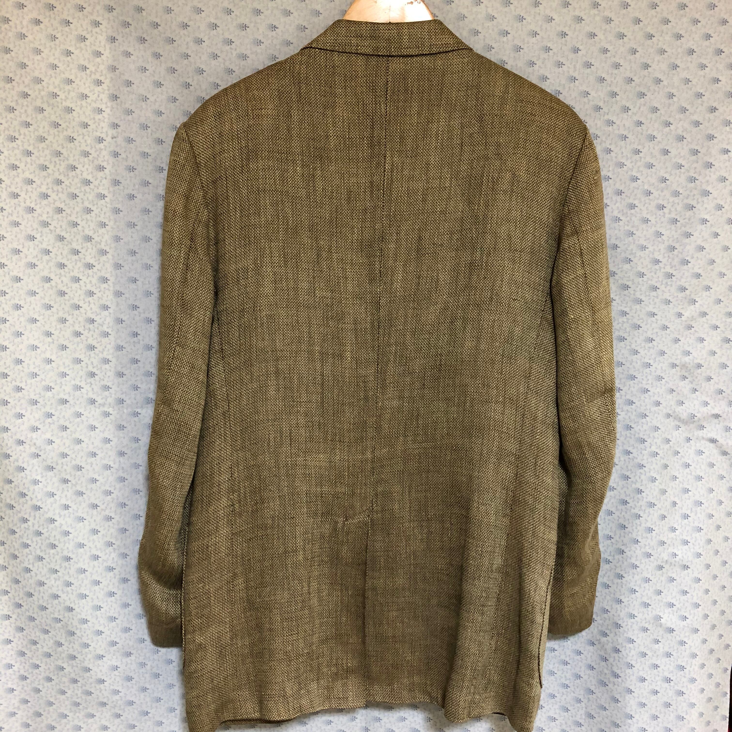 Henry Cotton三つボタンリネンジャケット。背抜きのリネン100% のサマージャケット。イタリア製。肩幅46 身幅52.5 着丈78 袖丈62.5 色は、濃い目のベージュで、目の粗い織り方なので、通気性に優れてます。10000円