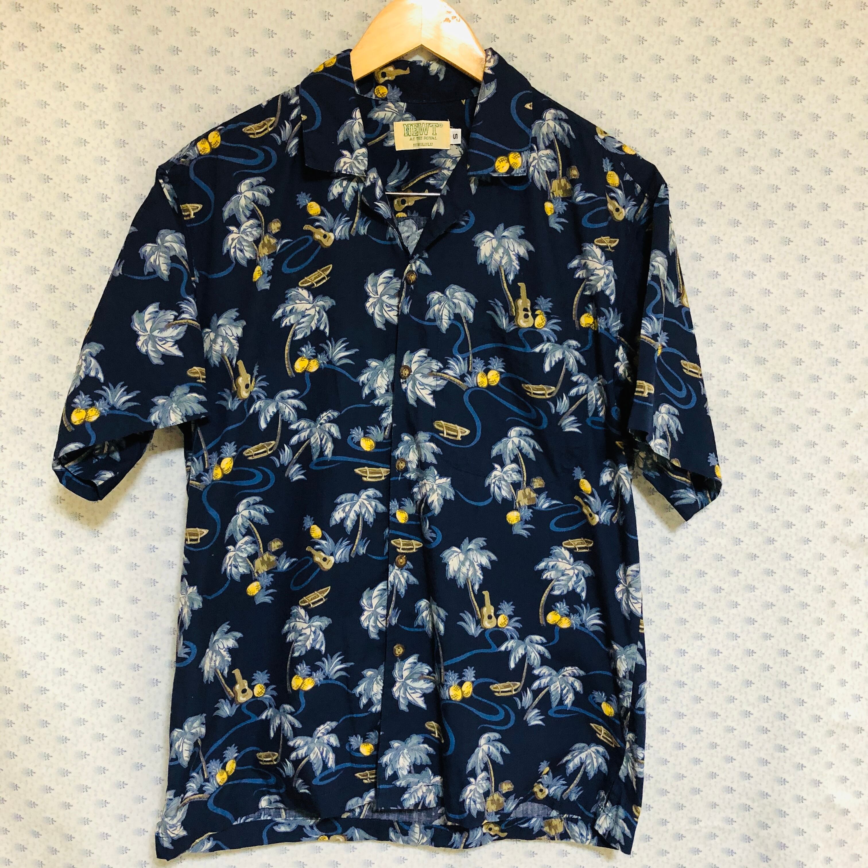 ネイビー地にヤシの木やパイナップルやギター柄のアロハシャツ。デザインが、程よくポップで着やすい。サイズ表記S。肩幅48 身幅53.5 着丈68.5 袖丈23.5 ハワイ製。サイズ感は、Mぐらい。コットン100%
