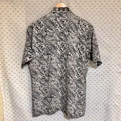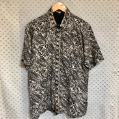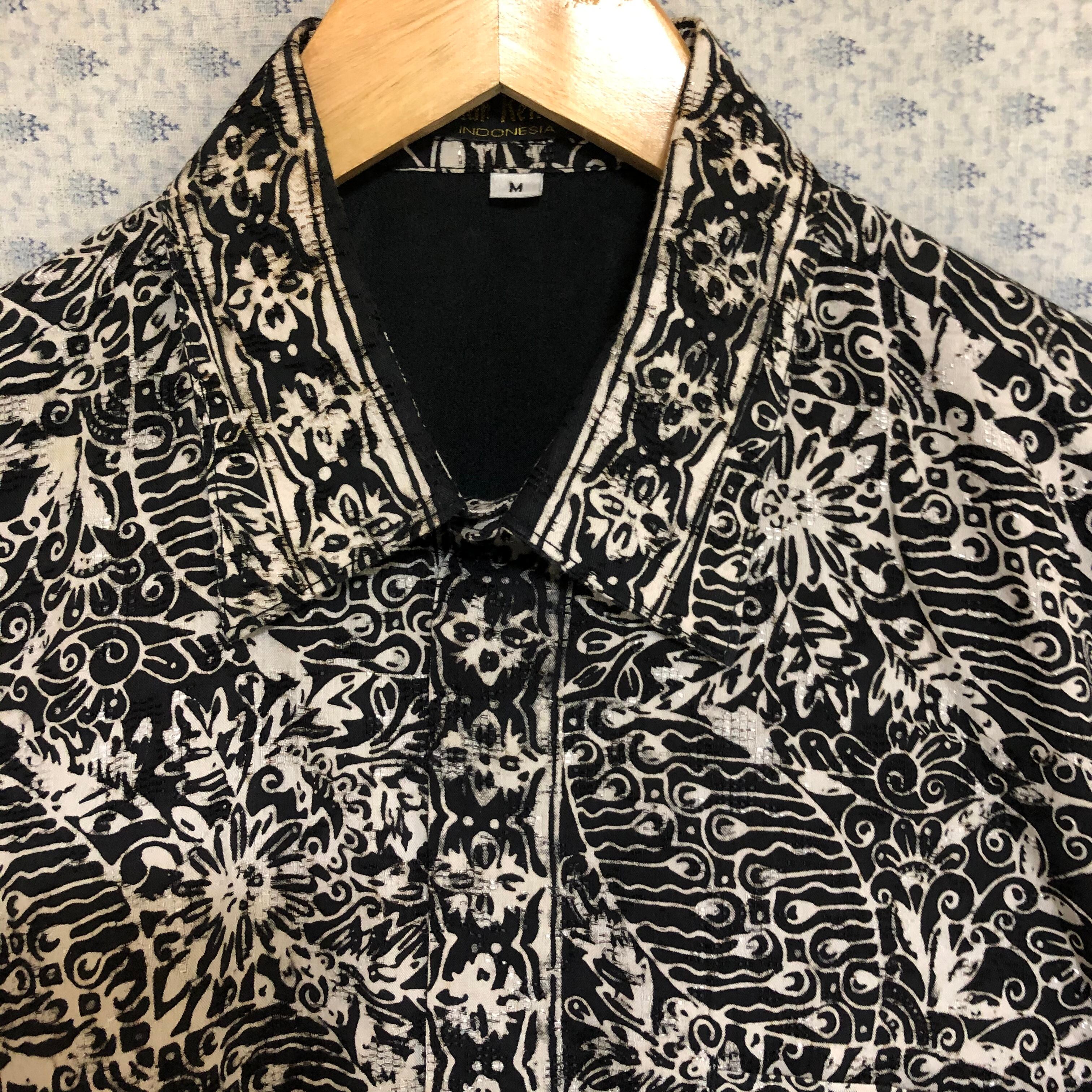 黒をベースにした見事なバティック柄。また、所々にシルクの糸で、縫い込みの刺繍が施されている。生地の裏には、黒い生地が裏地につけられている。夏服でここまで、凝ったつくりの服はなかなかない。実際に着てみても、かっこよかったです。地肌に着ても問題は、無さそう。肩幅48 身幅56 着丈73.5 袖丈25 インドネシア製 5500円