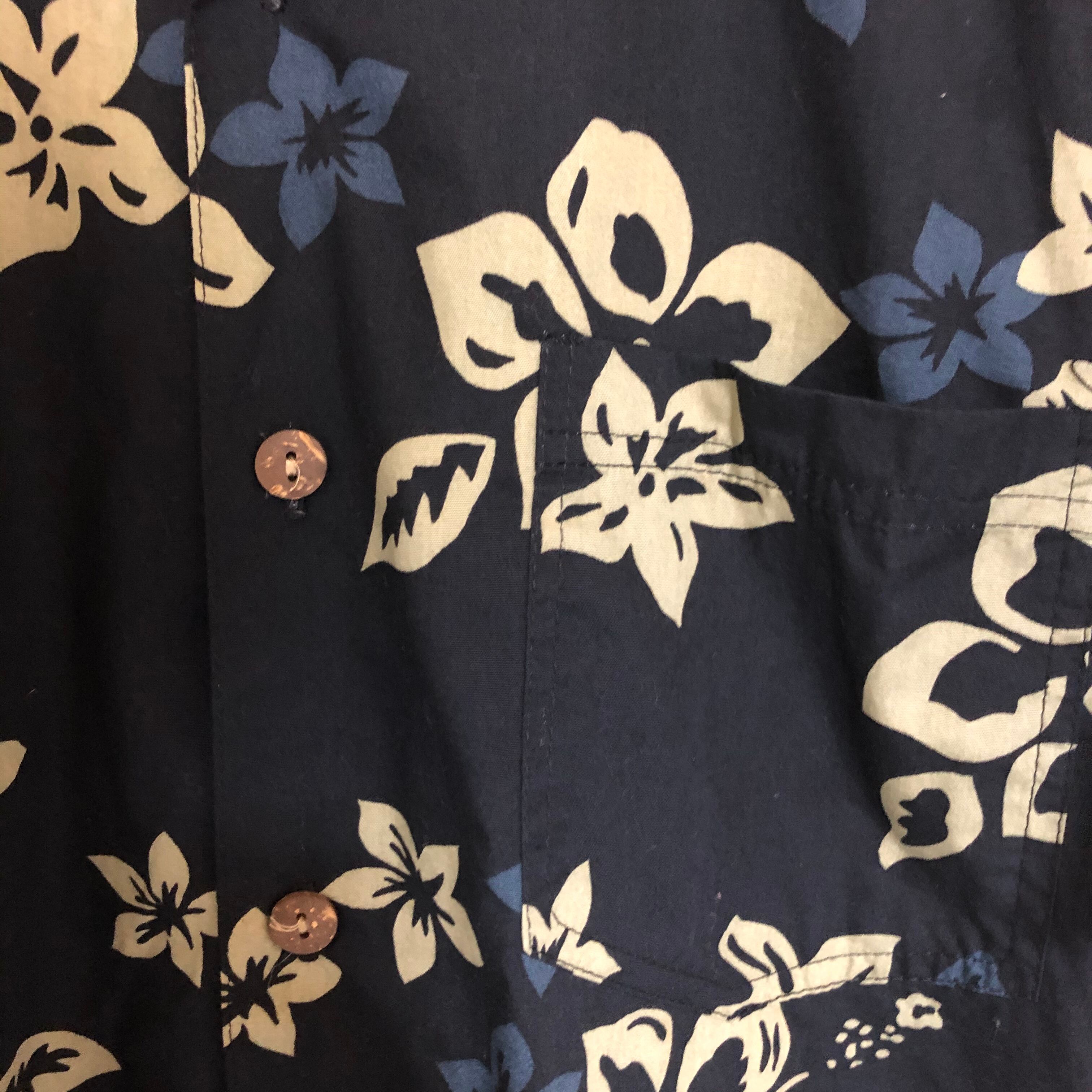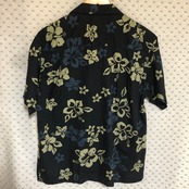 黒地にネイビー×アイボリーのハイビスカス柄のアロハシャツ。アメリカ製のデッドストック。48ドルで売られてたらしく、プライスタグが付いているよ。コットン100% 肩幅52 身幅58.5 着丈72 袖丈25 サイズ表記S サイズ感は、Lぐらい。4200円