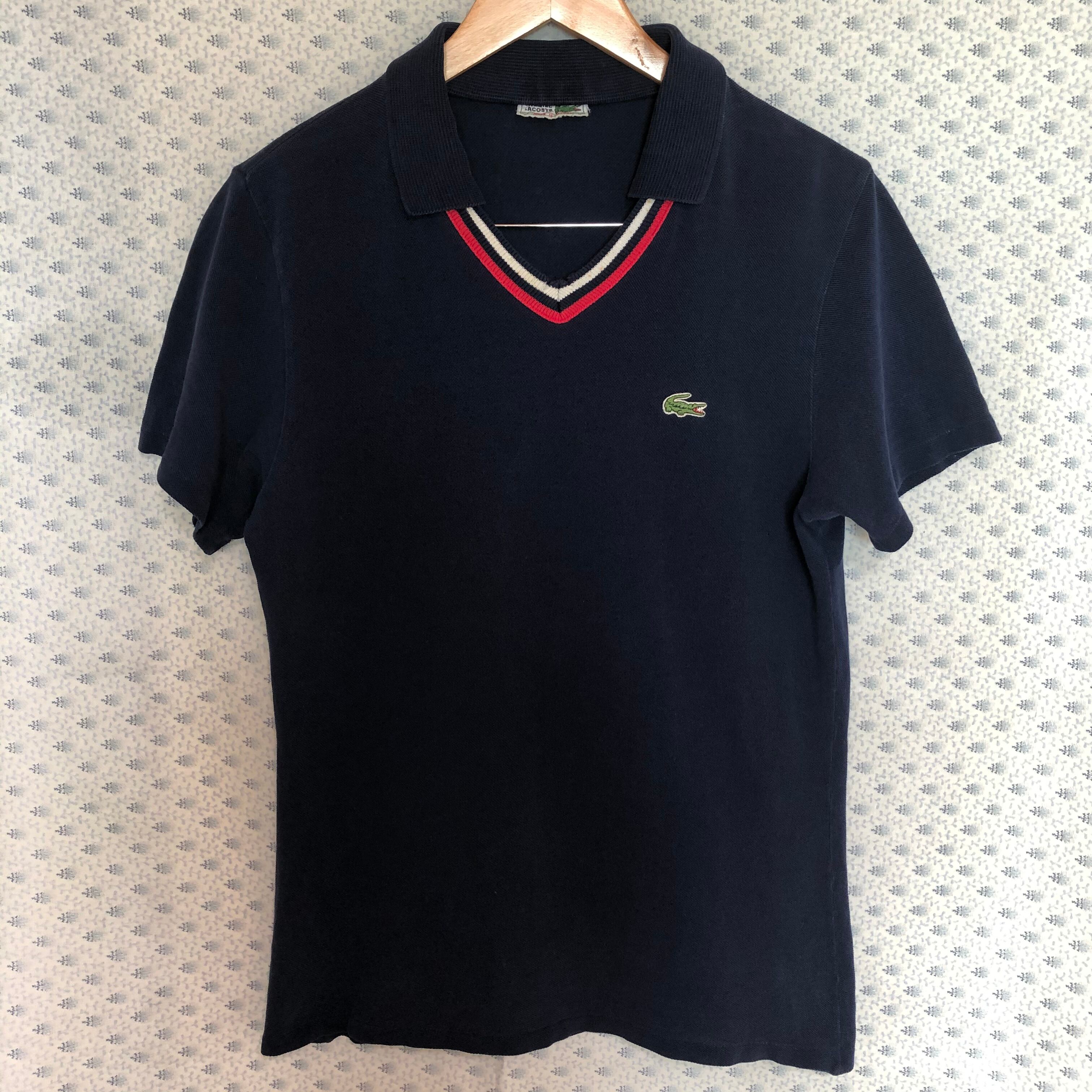 70'sラコステVネックポロ。ユーズド感はあるが、ヴィンテージらしい魅力的なデザイン。細身のシルエット。フランス製。肩幅43 身幅49 着丈65 袖丈19 サイズSぐらい。