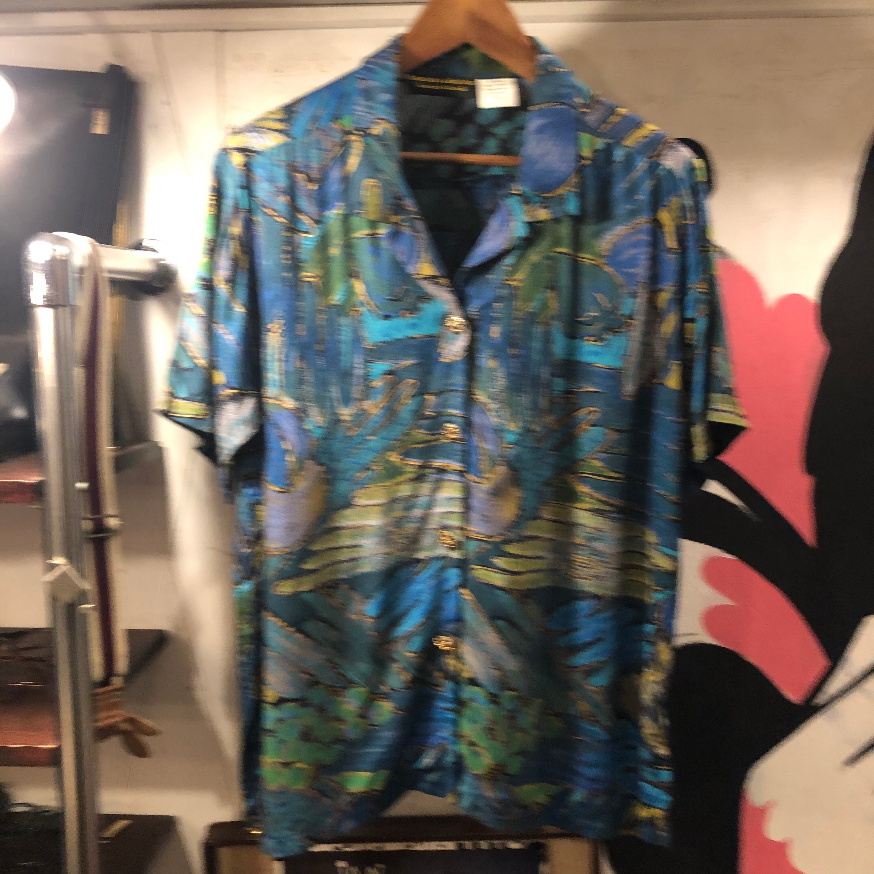 レーヨン素材のアロハシャツ。ハワイのブランドで、インドネシア製。きらびやかなデザイン。