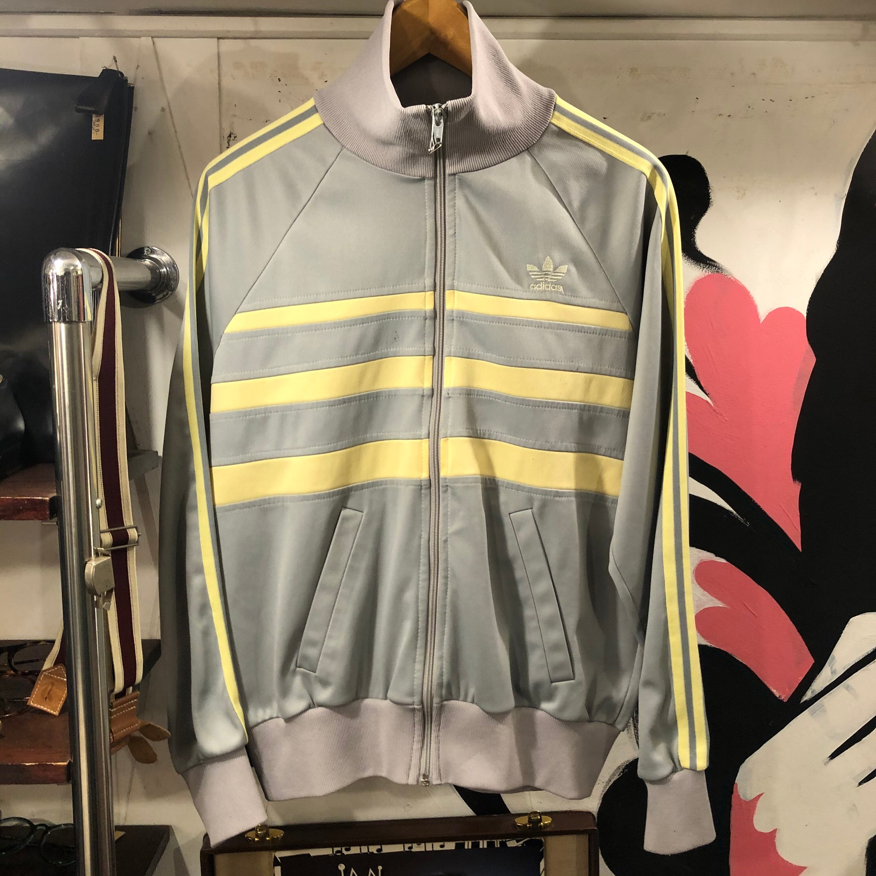 アディダスジャージ70's〜80'sイングランド製。ライトグレー地に、ライトイエローの3本ストライプ。なかなか、スタイリッシュなカラーリング。サイズ表記 イングランド5フィート9インチ フランス174cm サイズ感Mぐらい。