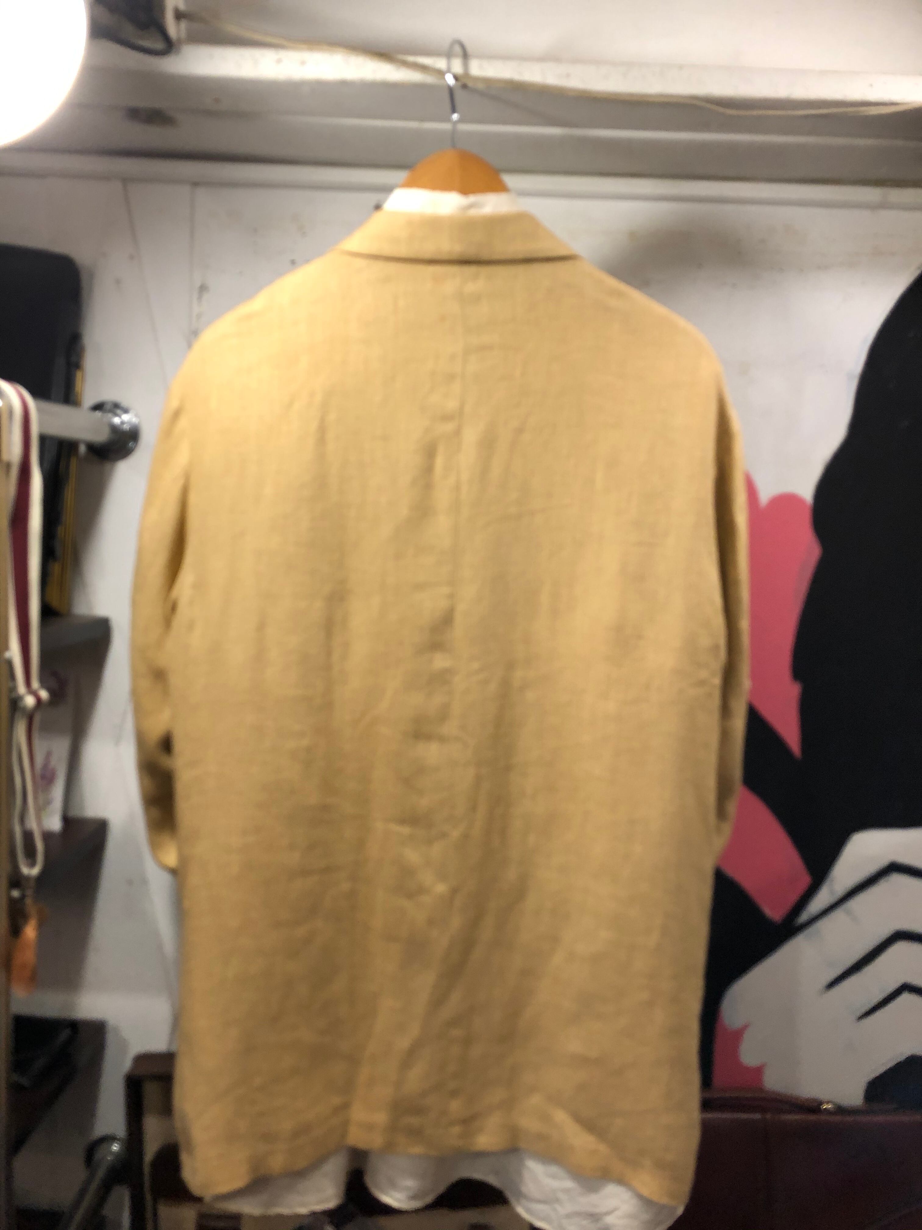 やや黄色っぽいベージュ。三つボタンで、ブランドは、不明。肩幅51 身幅58 着丈77.5 袖丈59.5 サイズ表記46