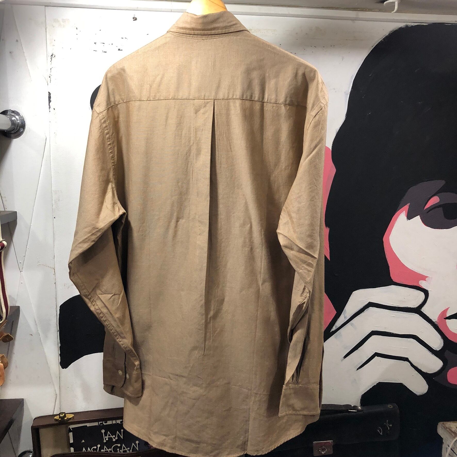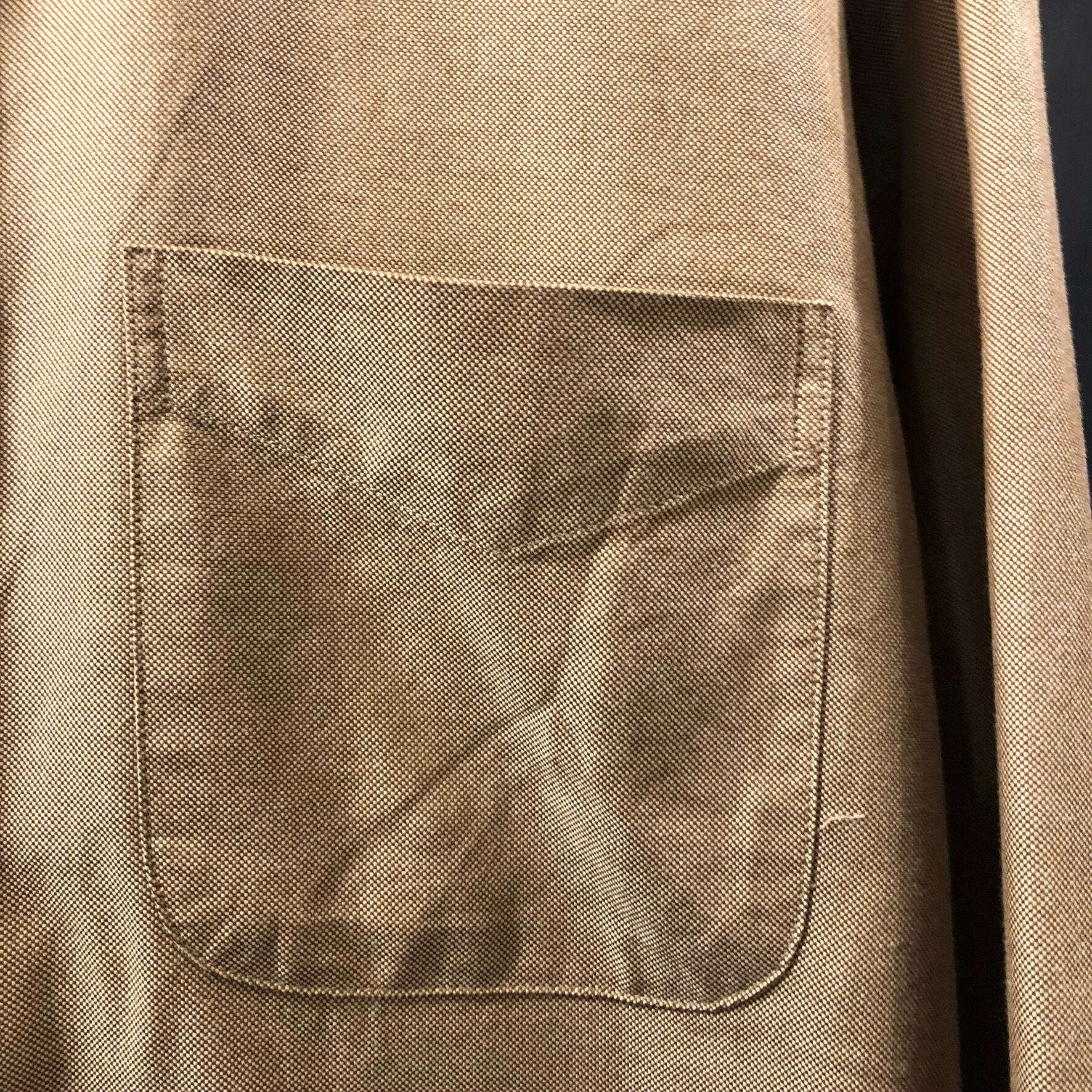 ブルックスブラザーズボタンダウンシャツ。ブルックスブラザーズといえば、オックスフォード生地のボタンダウンシャツ。濃いめのベージュ。肩幅54身幅64着丈83袖丈61.5 サイズ表記はMだが、サイズ感としては、XLぐらい。使用感も少なく、グッドコンディション。