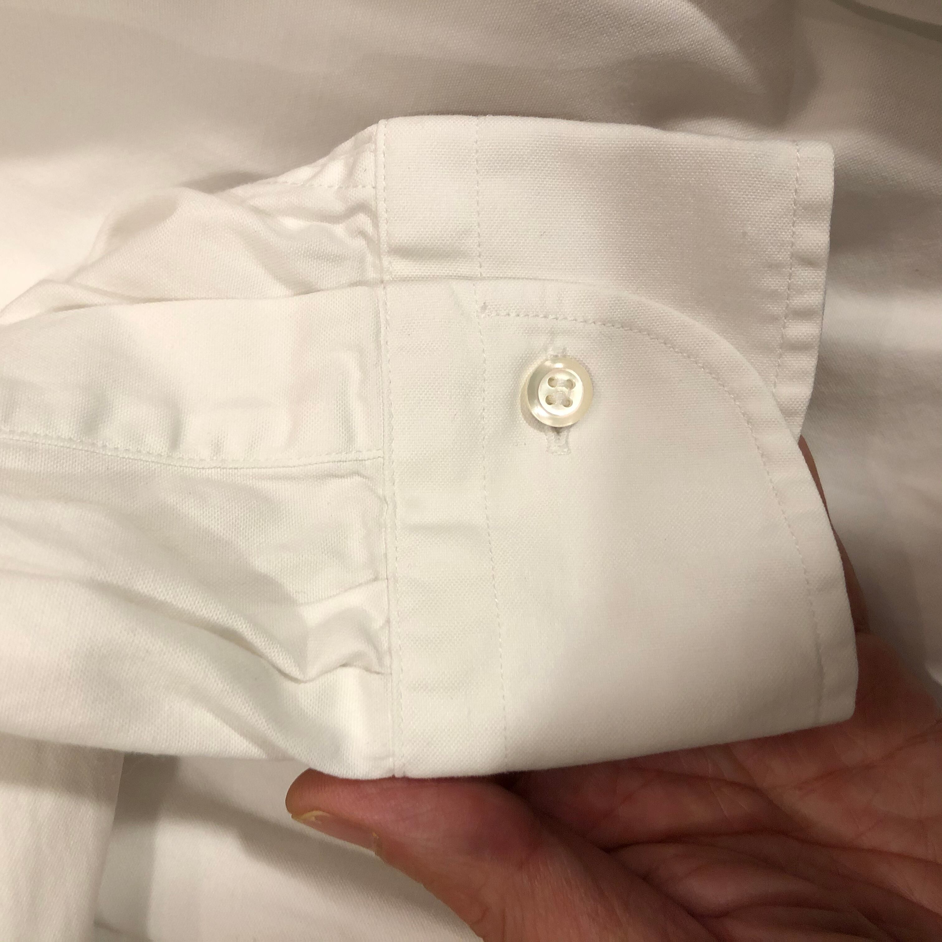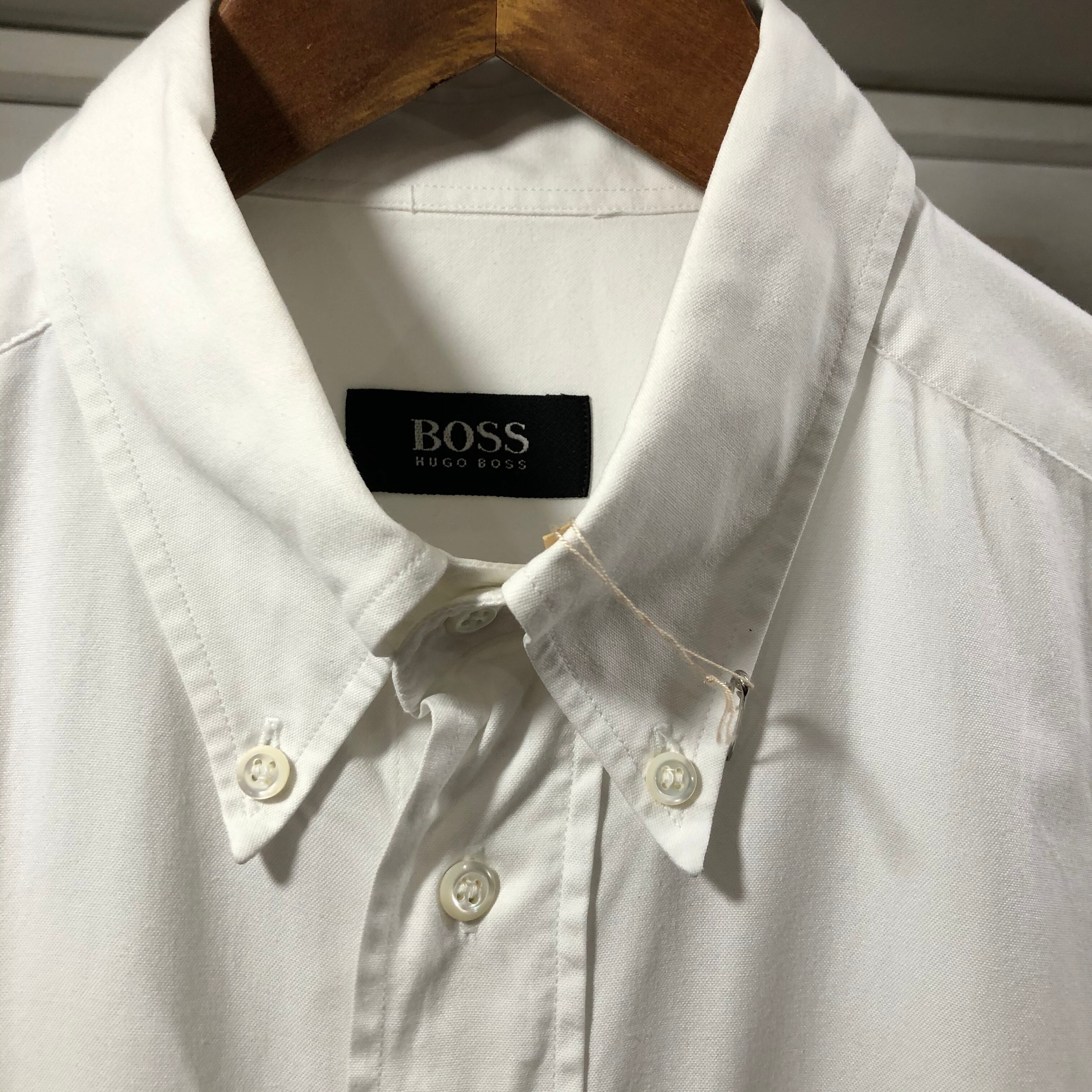 ヒューゴボスボタンダウンオックスフォードシャツ。キメの細かい質のいいオックスフォードシャツ。ボタンもシェルボタン。コンディションのいい高品質の白シャツを探している人にお勧め。