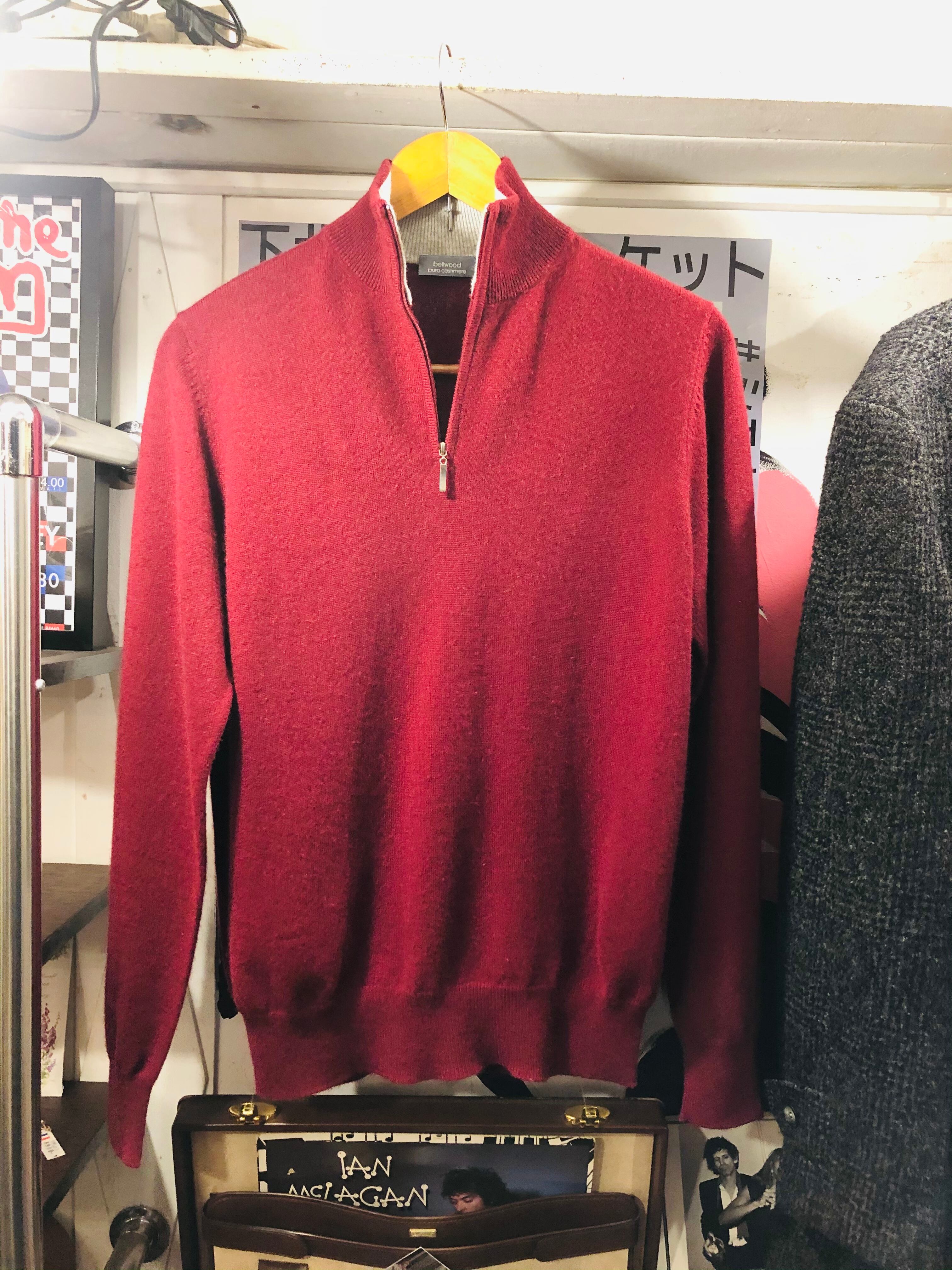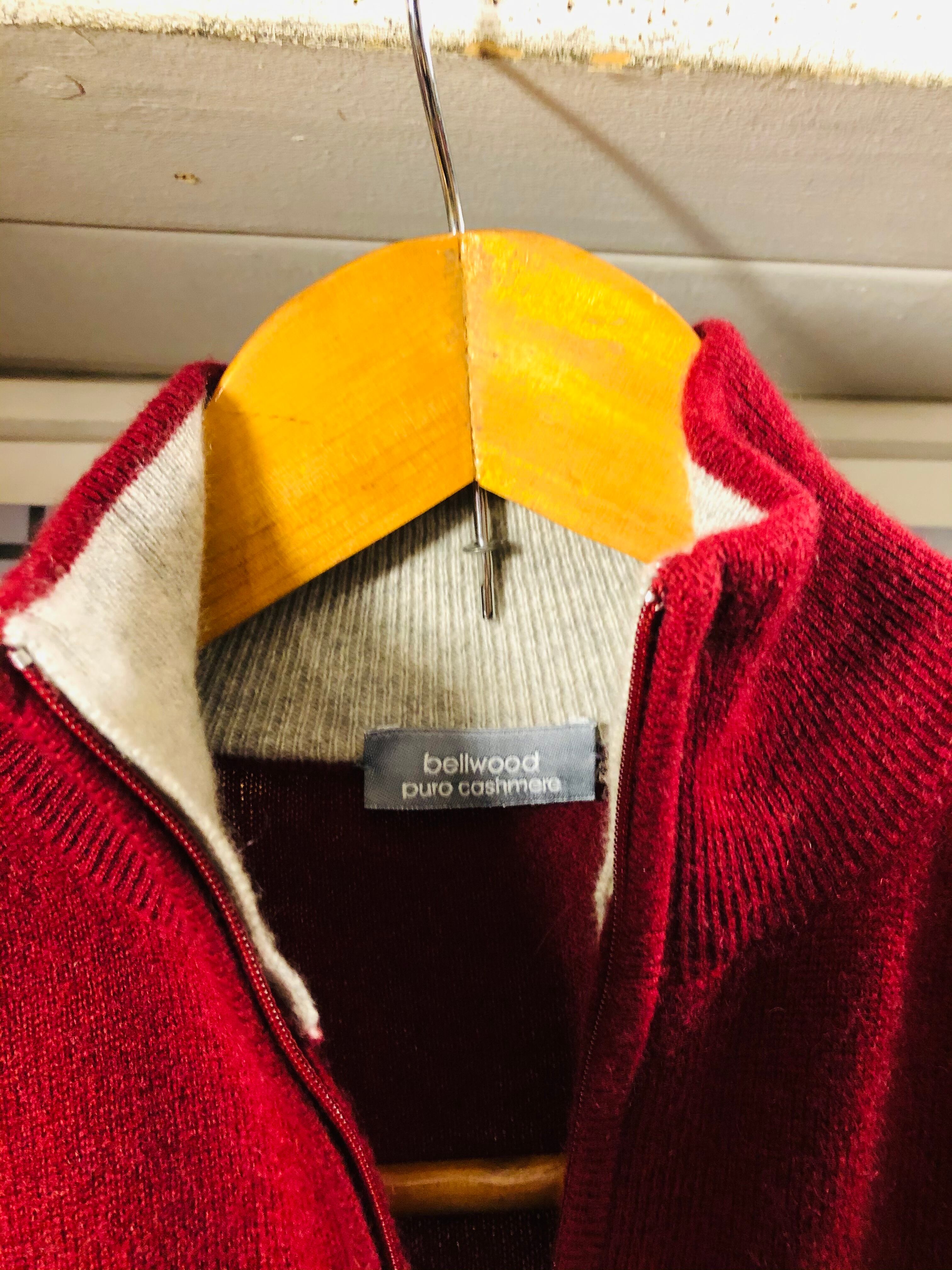 色は、ワインレッド。実物は、画像よりも赤のトーンが控えめ。首のリブ部分の裏は、ライトグレー。程よい厚みがあって上質なカシミア。