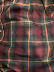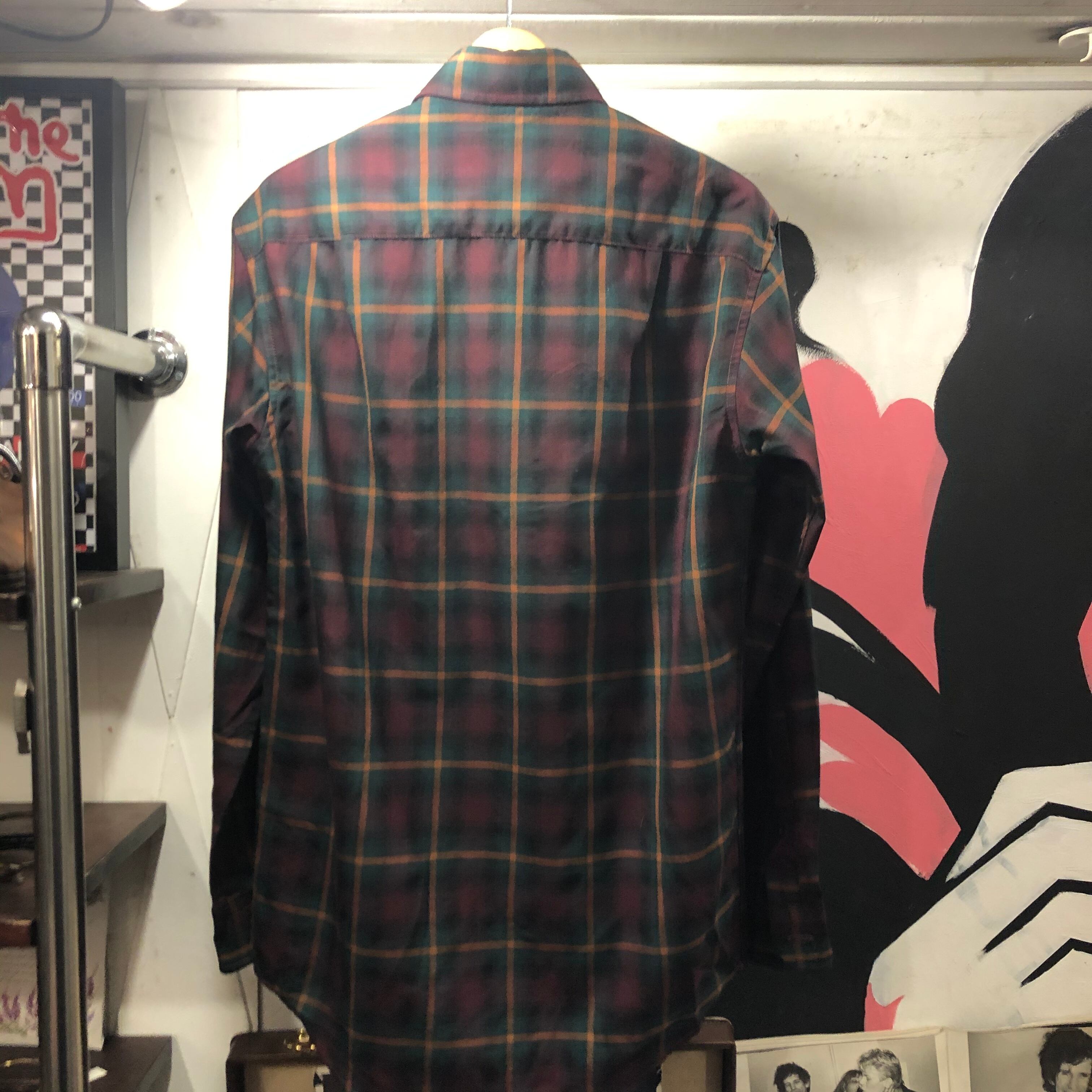 Pendleton格子柄ボタンダウンチェックシャツ。サラッとした肌触りのウール100%のシャツ。ほぼ新品同様のコンディション。サイズS 。メキシコ製で、生地はアメリカ製。濃いめのえんじ色とダークトーンのオレンジ色とグリーンの組み合わせ。