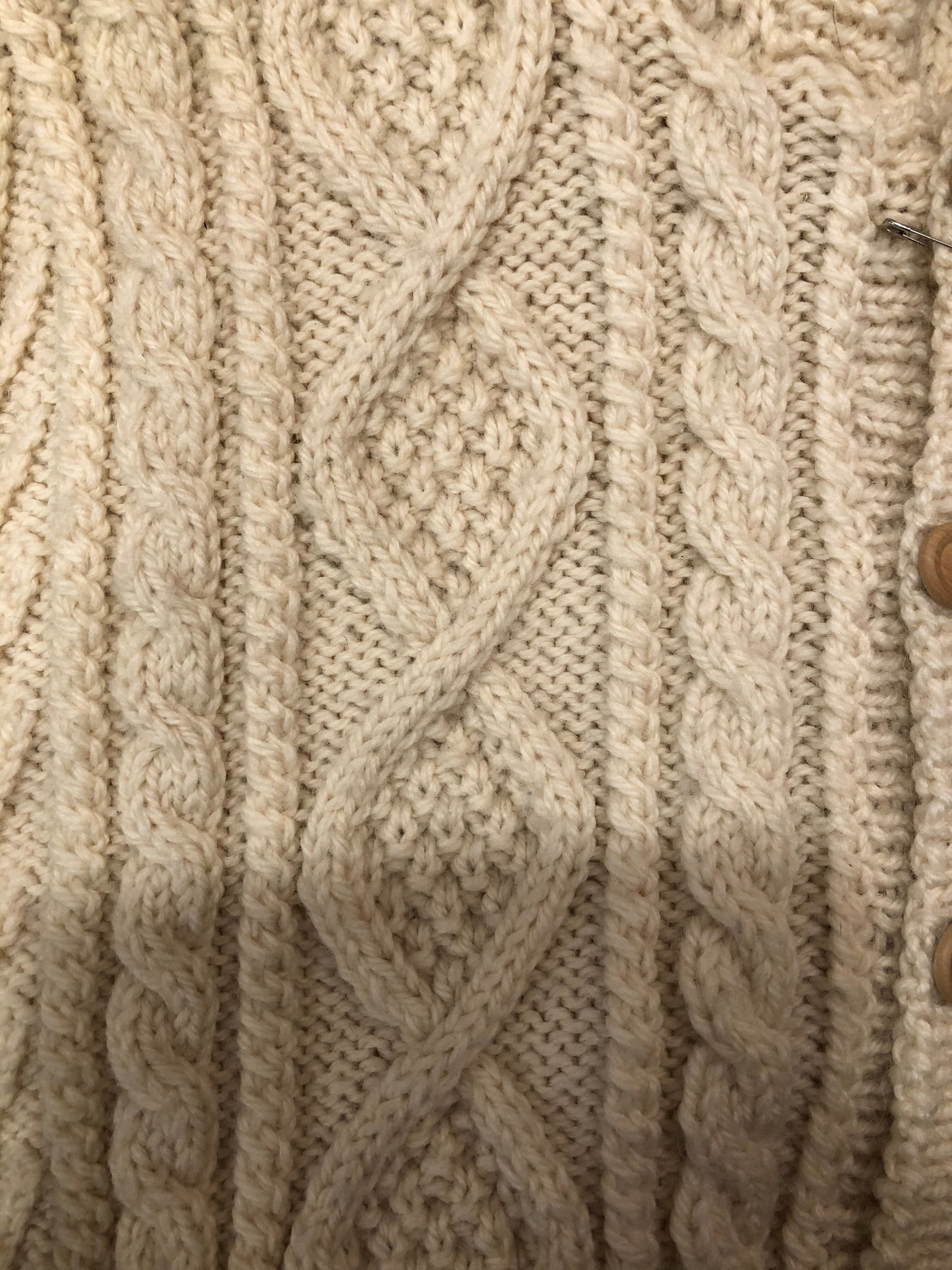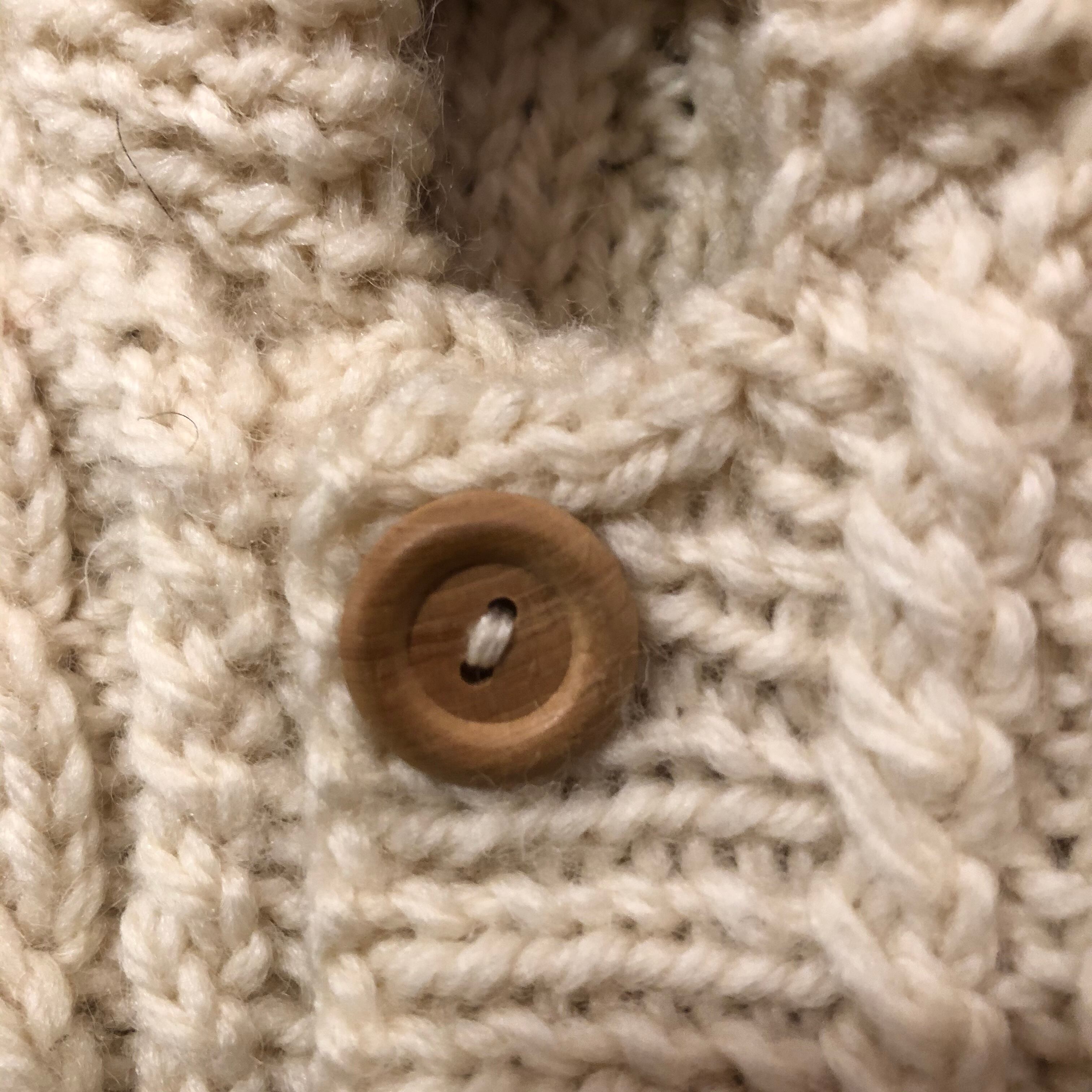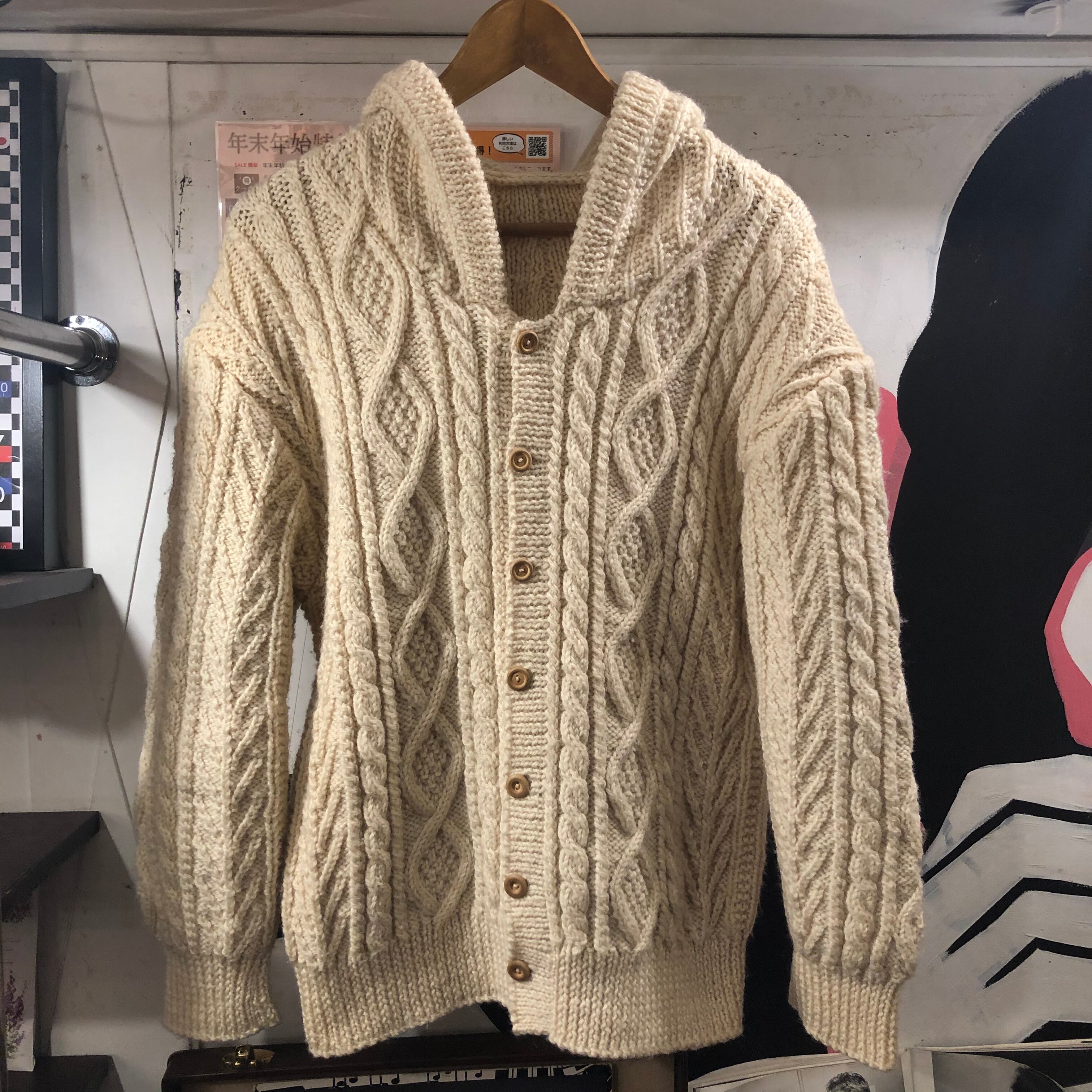 フードのついたハンドメイドのアランニットセーター。ハンドメイドのため素材やサイズ表記がないが、ウール100%だと思います。ボタンは、木製です。肩幅56 身幅56 着丈60 袖丈53 フードがついていて、女の子が着てもかわいいと思います。