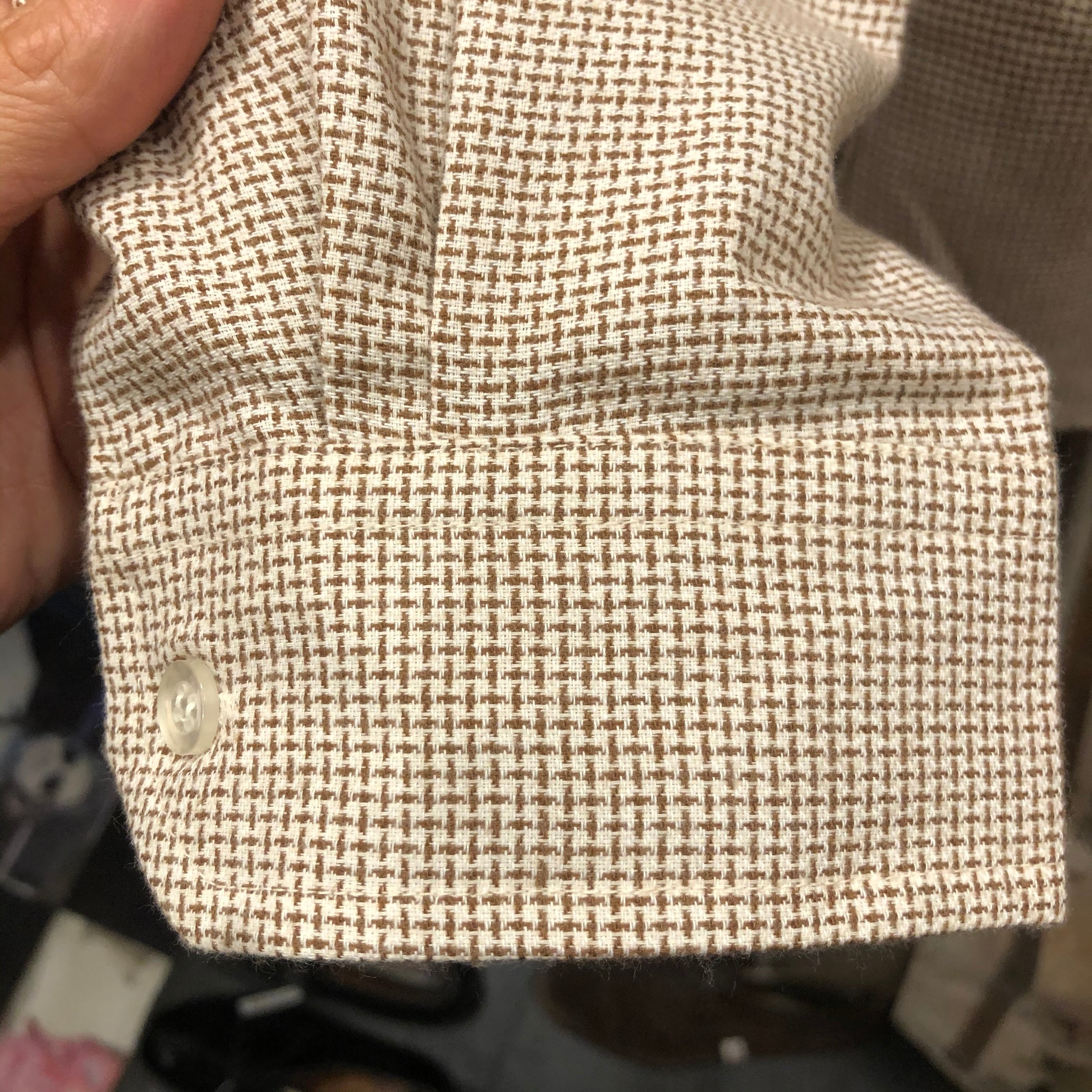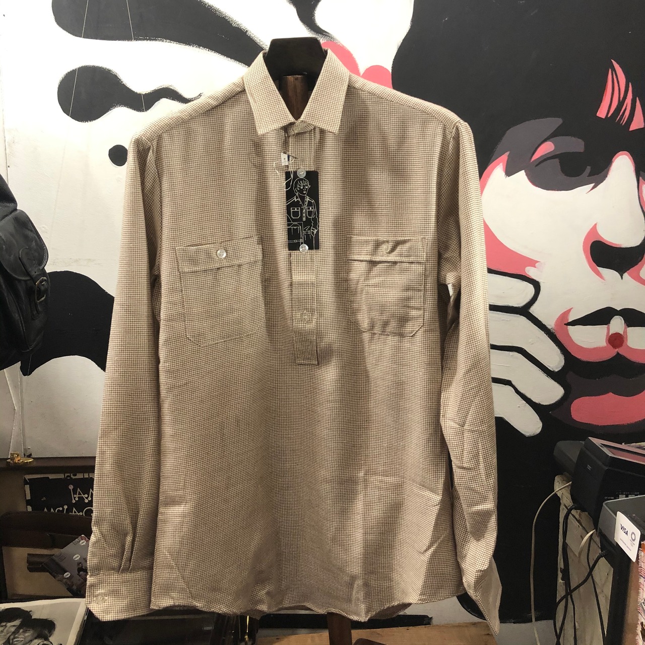 フラッシャーのイラストのように、シャツをタックインして着てもいいし、背が高い人は出して着ても、かっこいいと思います。シャツのボディーは、白に、茶色の幾何学的な柄がデザインされてヴィンテージ らしい雰囲気。