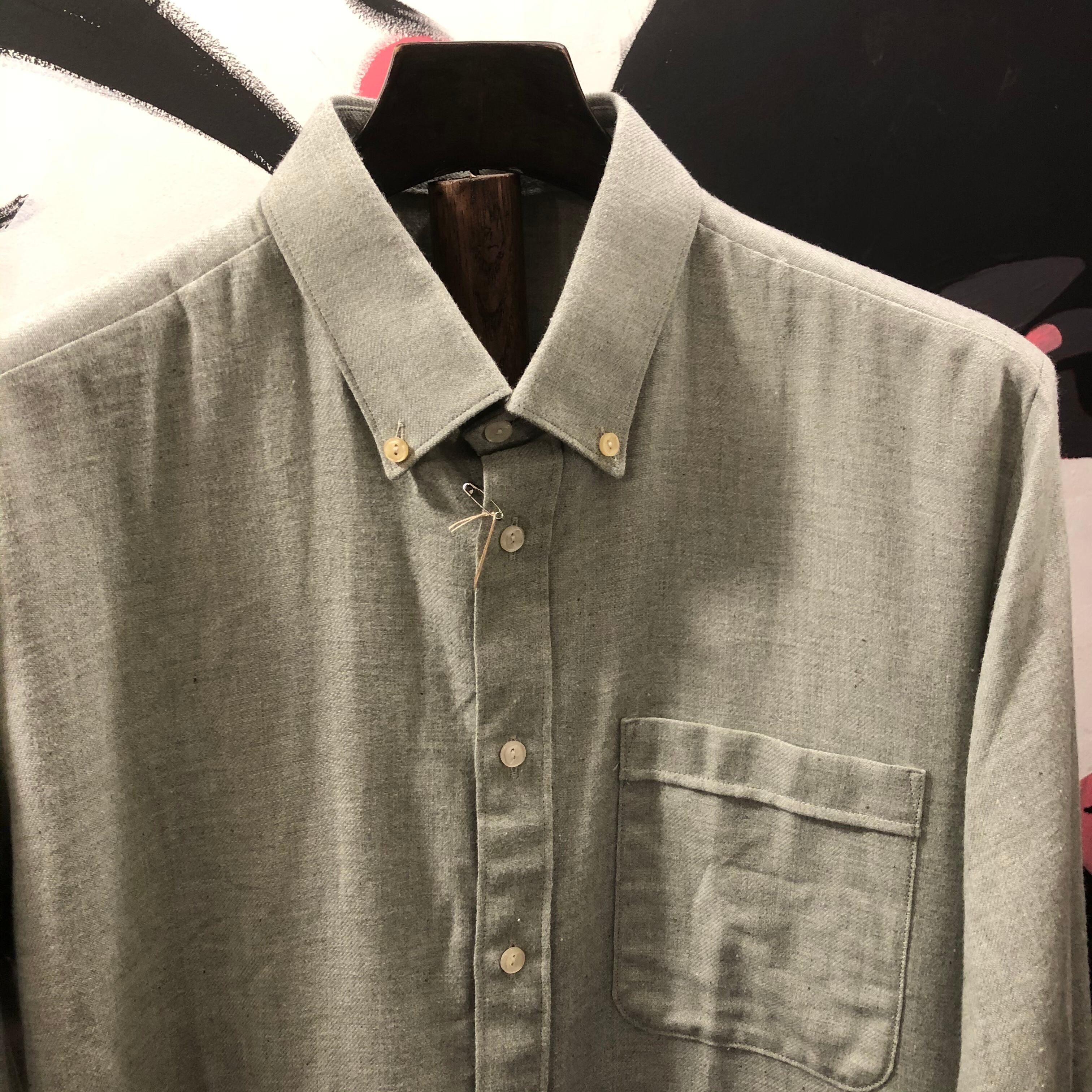 Haticoボタンダウンシャツ。デッドストックヴィンテージ 。ドイツ製。ライトグリーンにグレーを混ぜた落ち着いた繊細な色合い。素材は、綿75%に、レーヨン25%なので、少し柔らかい肌触り。