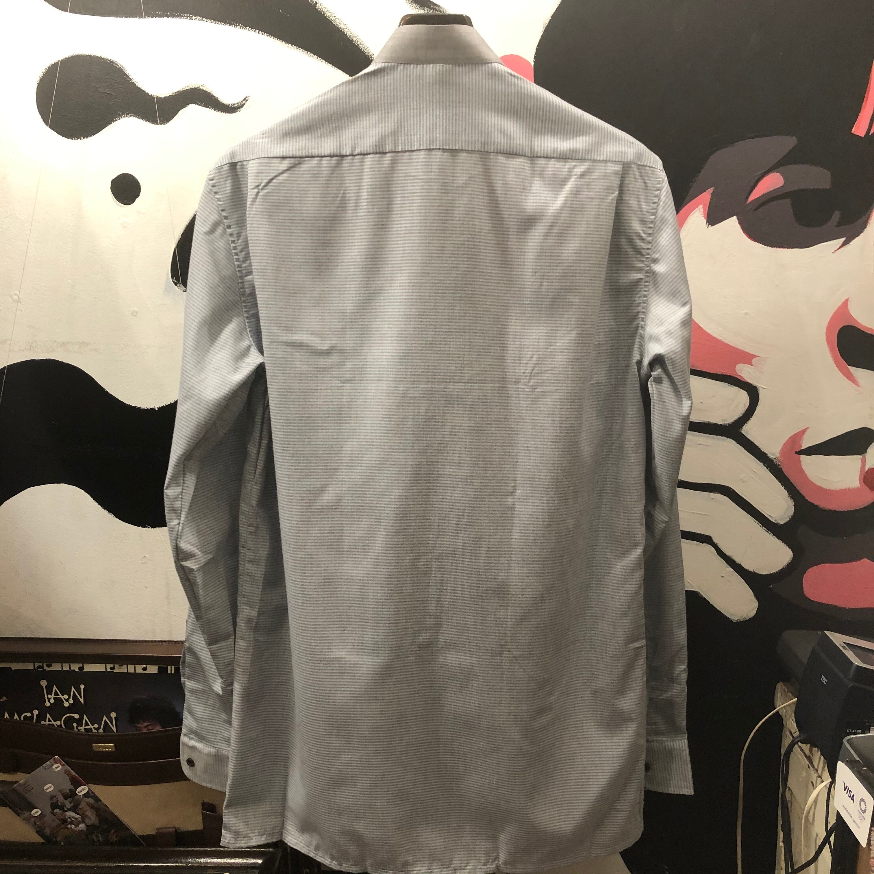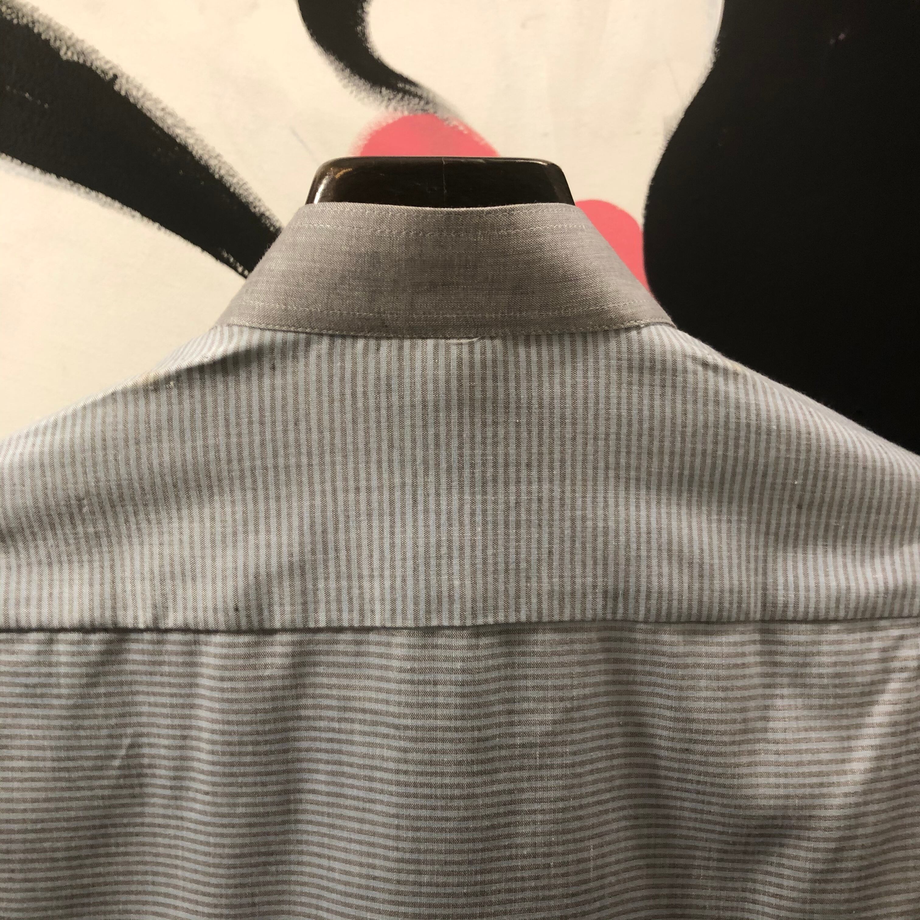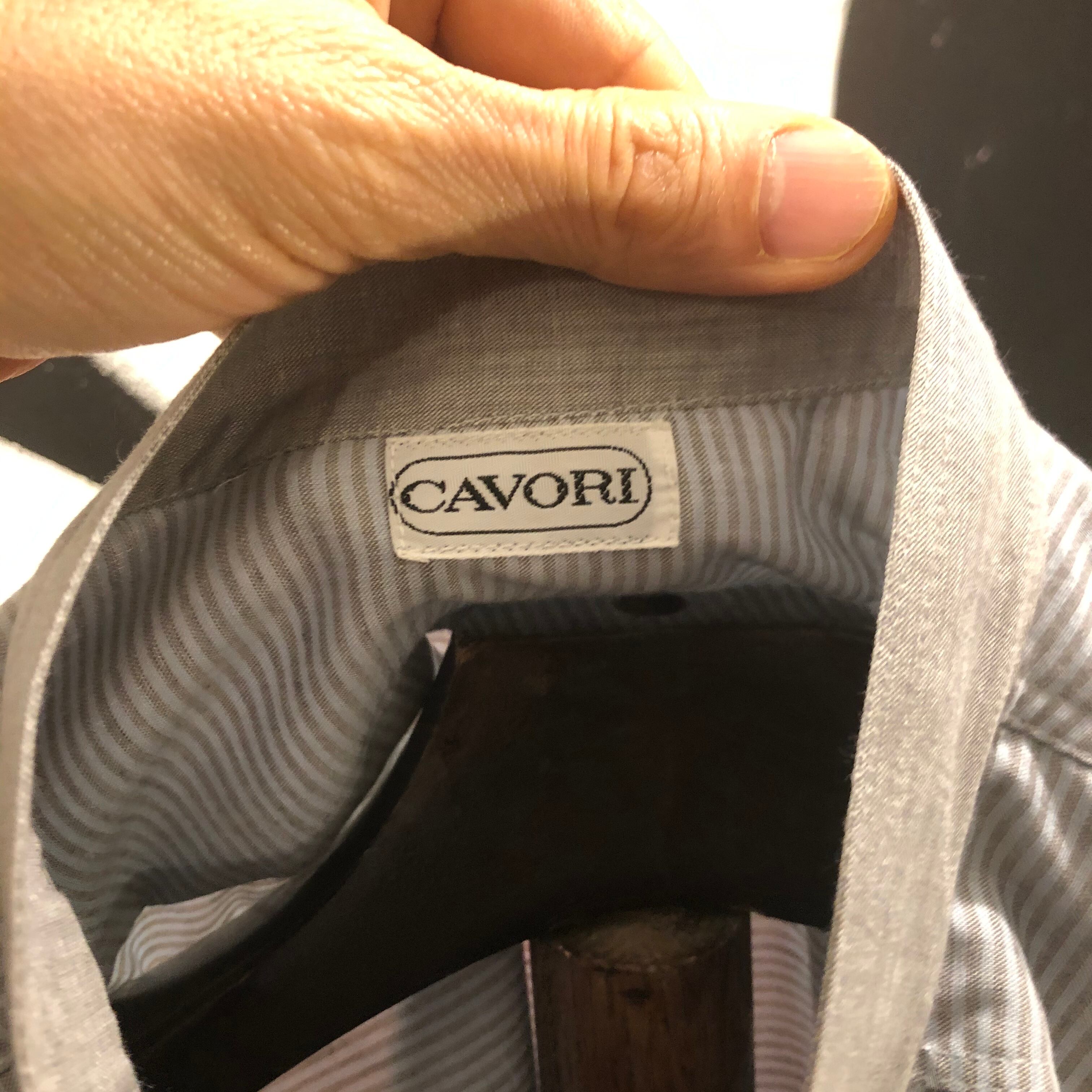 Cavoriスタンドカラーシャツ。イタリア製。デッドストックヴィンテージ 。カラー部分は、グレーで、ボディーは、水色×グレーのストライプシャツ。ボタンは、パープル。