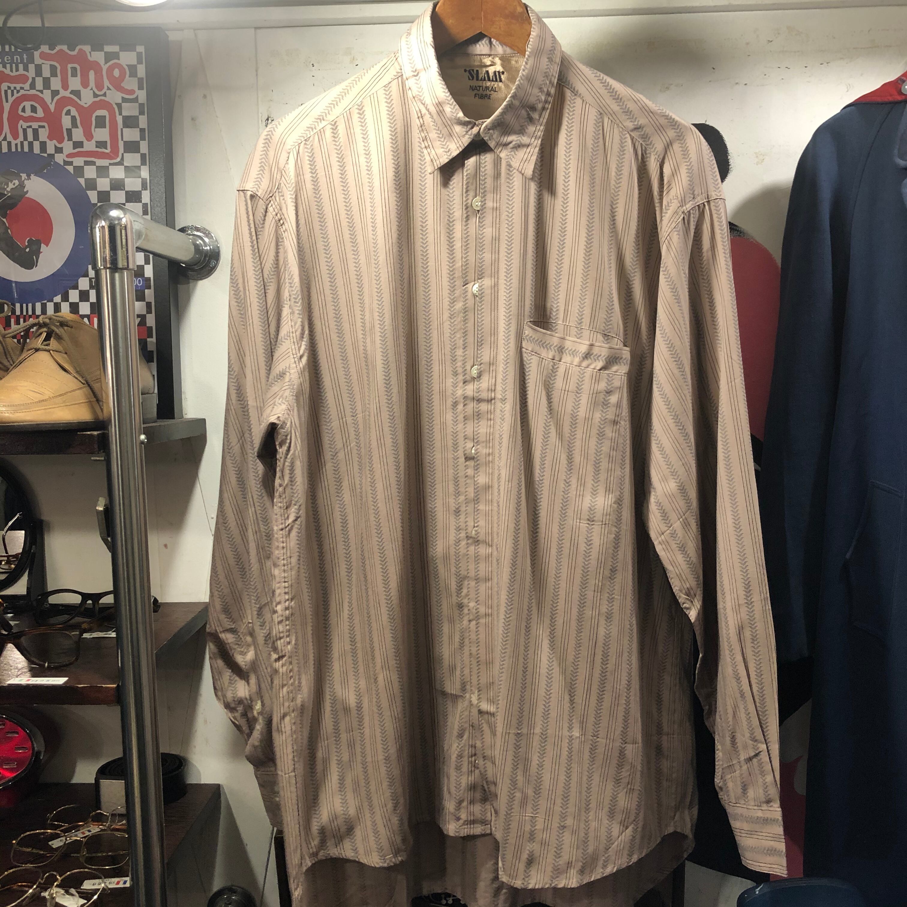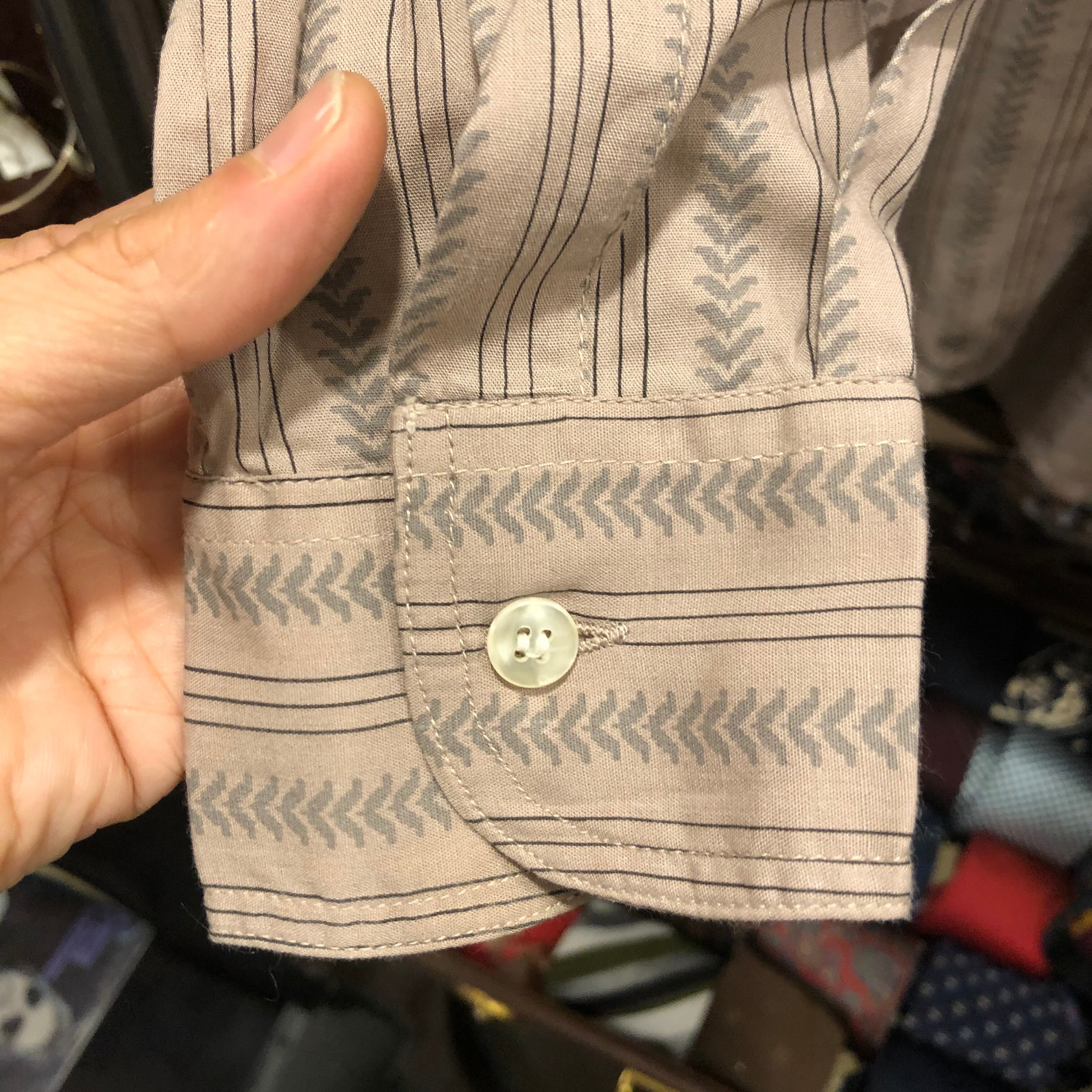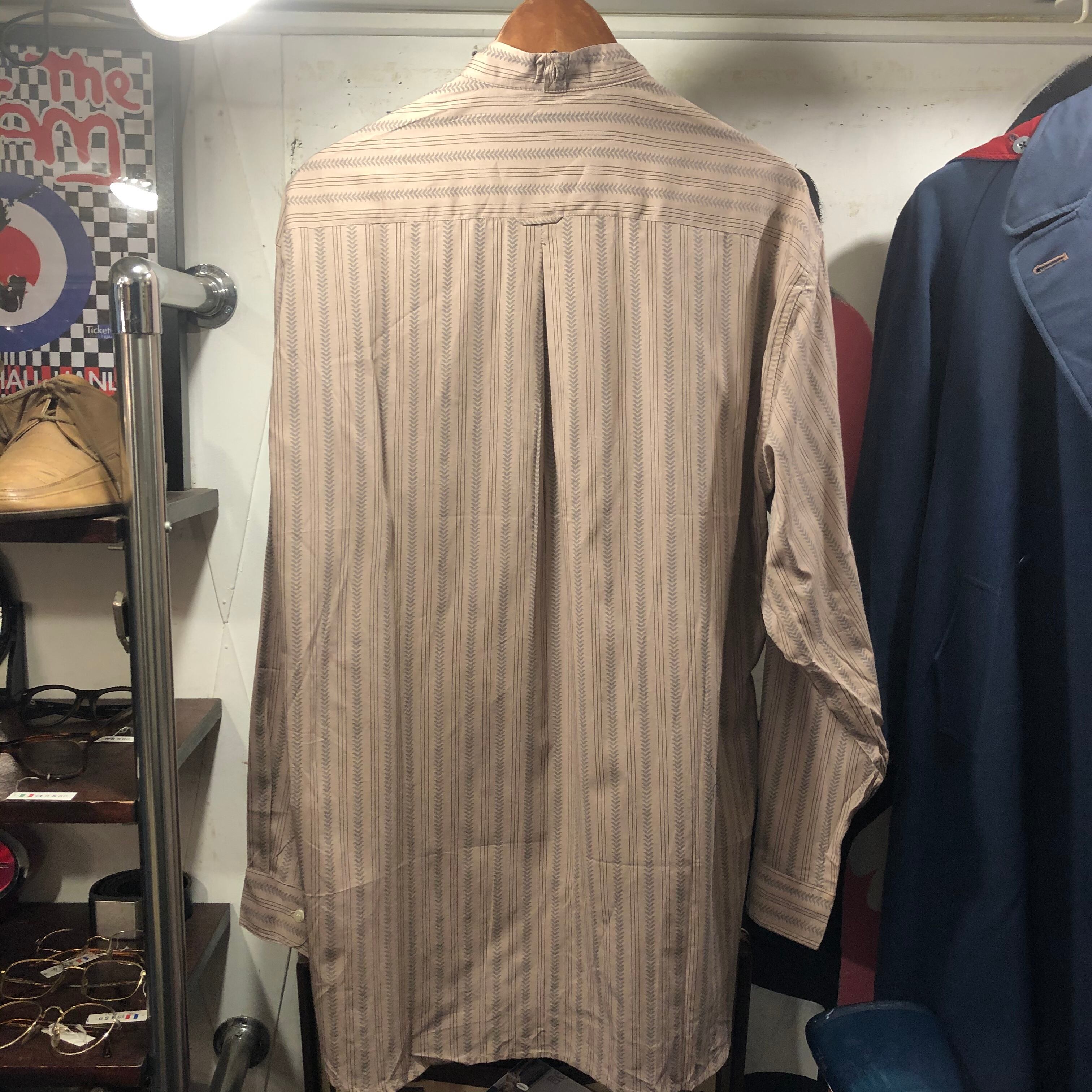 このシャツは、襟が取り外しが出来る面白いデザイン。スタンドカラーシャツとしても着れる。ボタン部分も、比翼仕立てになっているが、ボタンが全部隠れないで半分くらい見えるようにデザインされているのも面白い。