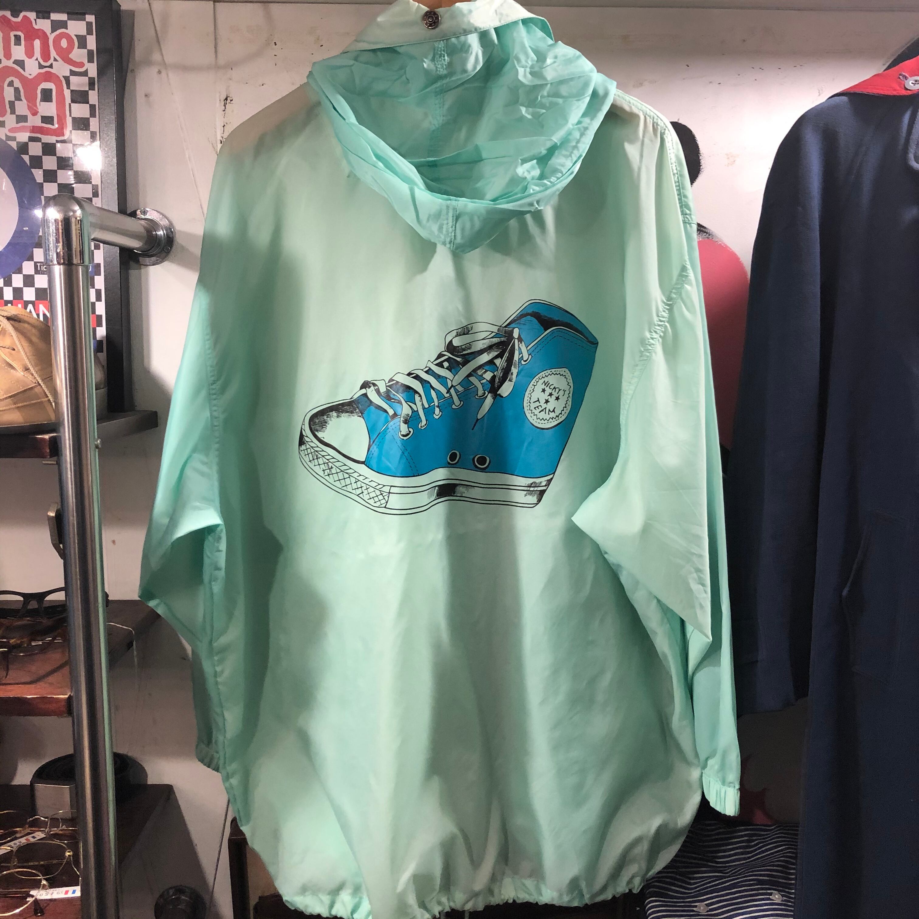 左腕に赤いスニーカーの刺繍と背中に青いスニーカーのプリントがデザイン面で大きな特徴。