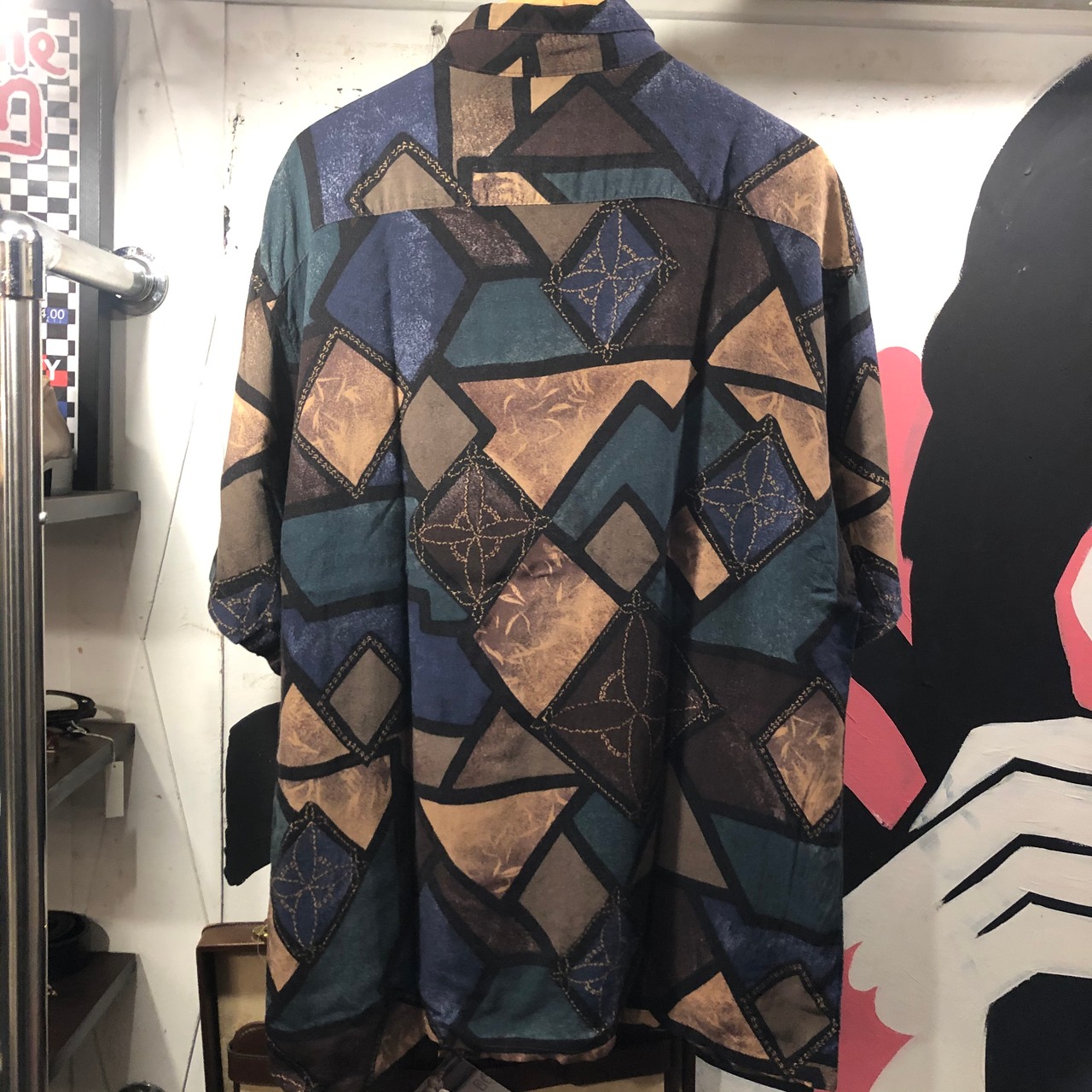 ピエールカルダン総柄半袖シャツ。素材は、レーヨン。サイズ表記は、L。韓国製。肩幅56 身幅62 着丈78 袖丈26.5 ダークグリーン×黒×紫×紺×茶×ベージュとカラフルだけど、落ち着いたダークトーン。