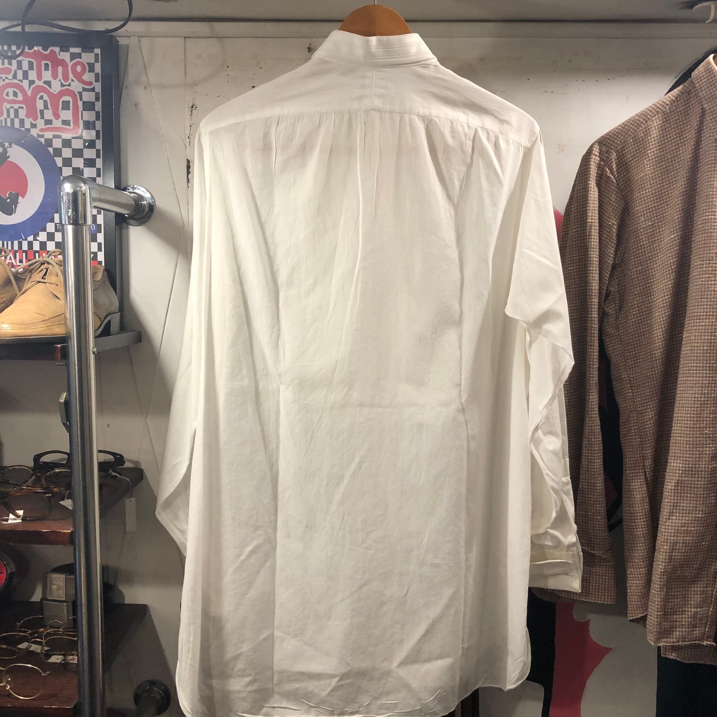 肩幅45 身幅63 着丈86 袖丈63 袖口は、ダブルカフス仕様になっているので、着用に、カフスボタンが必要ですが、カフスボタンなしでも着用出来るように、シェルボタンを縫い付けました。ヴィンテージ でドレッシーな雰囲気なシャツが好きな人にお勧めです。