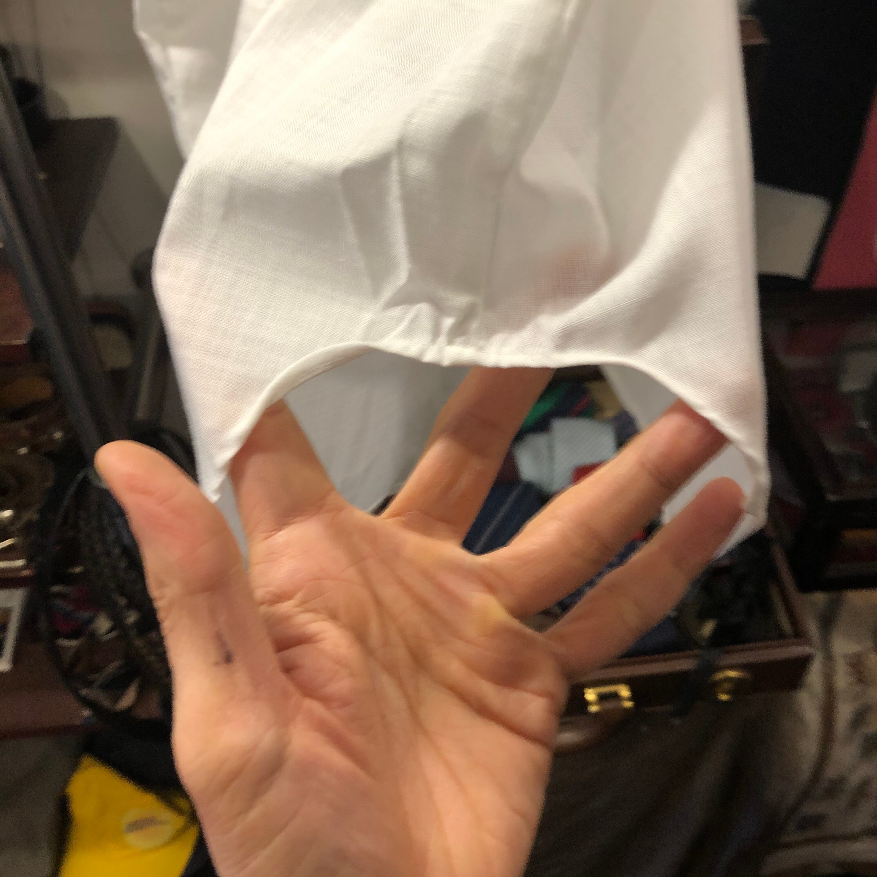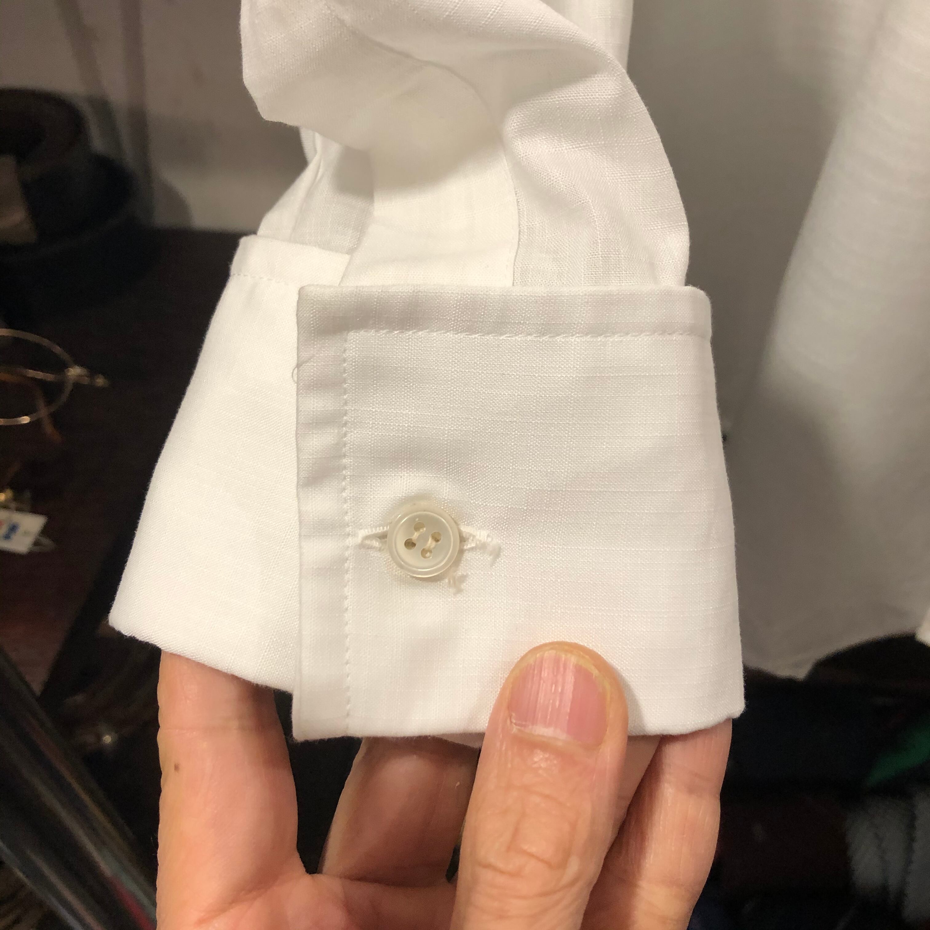 首廻り44 肩幅52.5 身幅66 着丈80 袖丈64 サイズ感は、XLぐらい。ダブルカフス仕様なので、着用の際は、カフスボタンが必要ですが、カフスボタンの代わりに、シェルボタンを縫い付けたので、なくても着用できます。