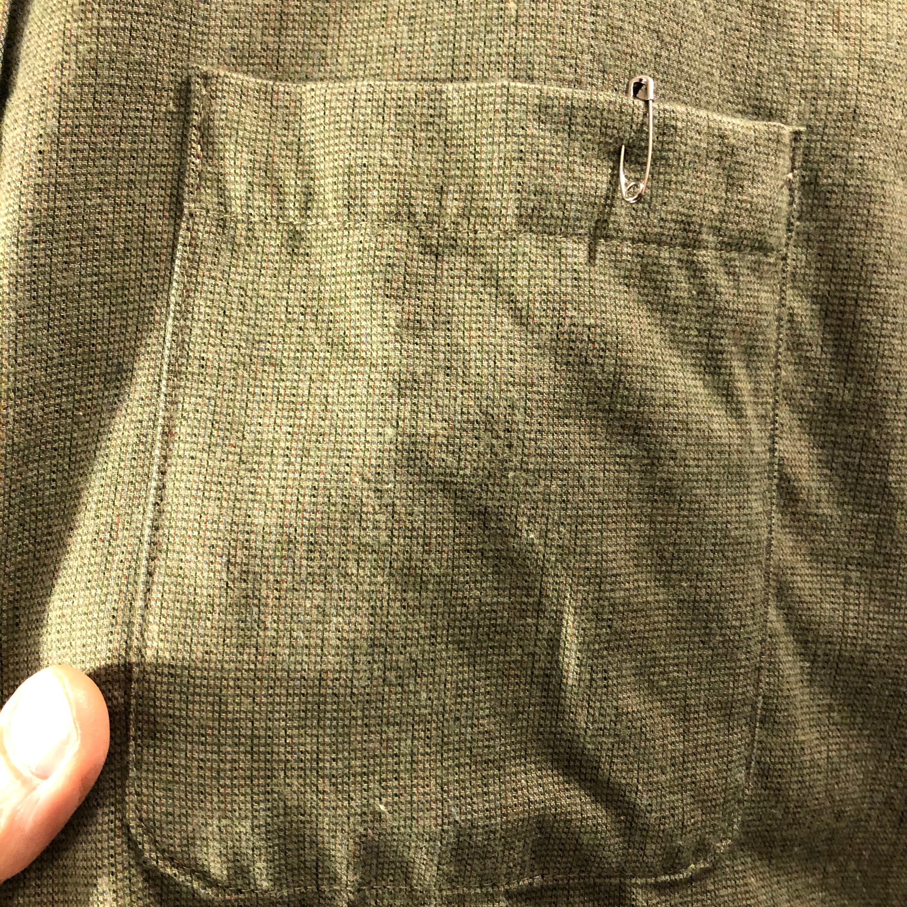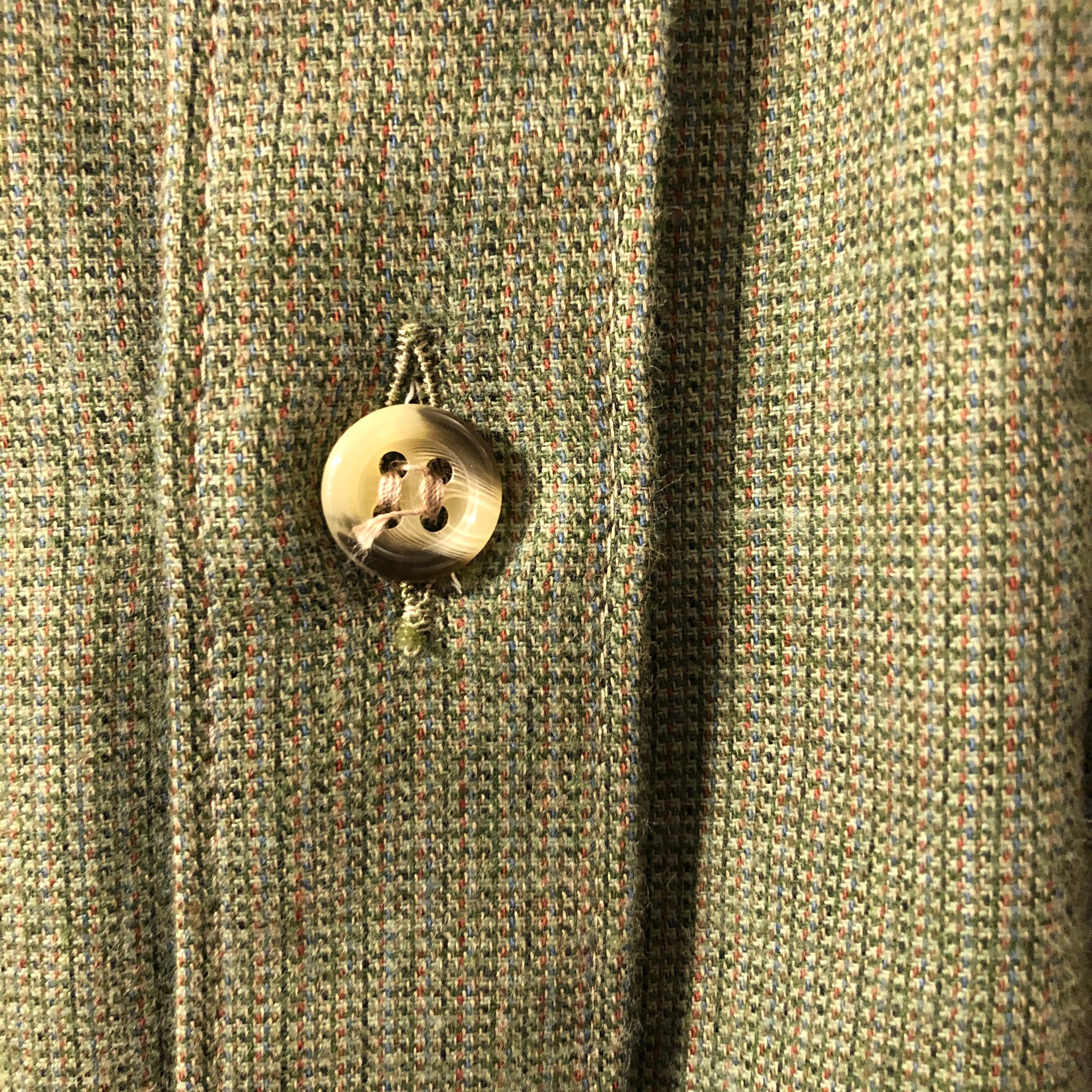 一見カーキ色のシャツだが、近くでみると、カーキ以外に赤やオレンジの色の糸で、編み込まれているので、味わい深い風合いがでている。