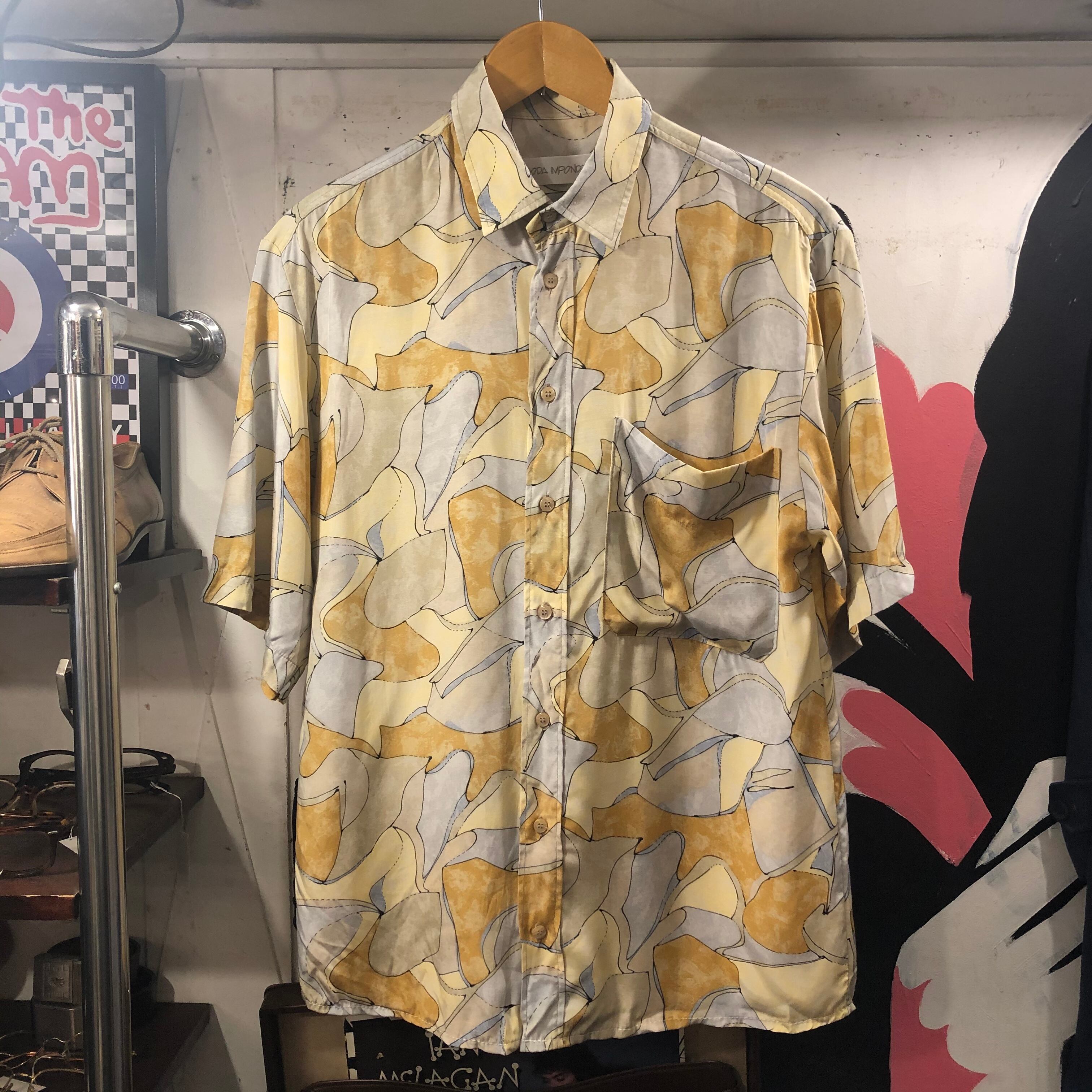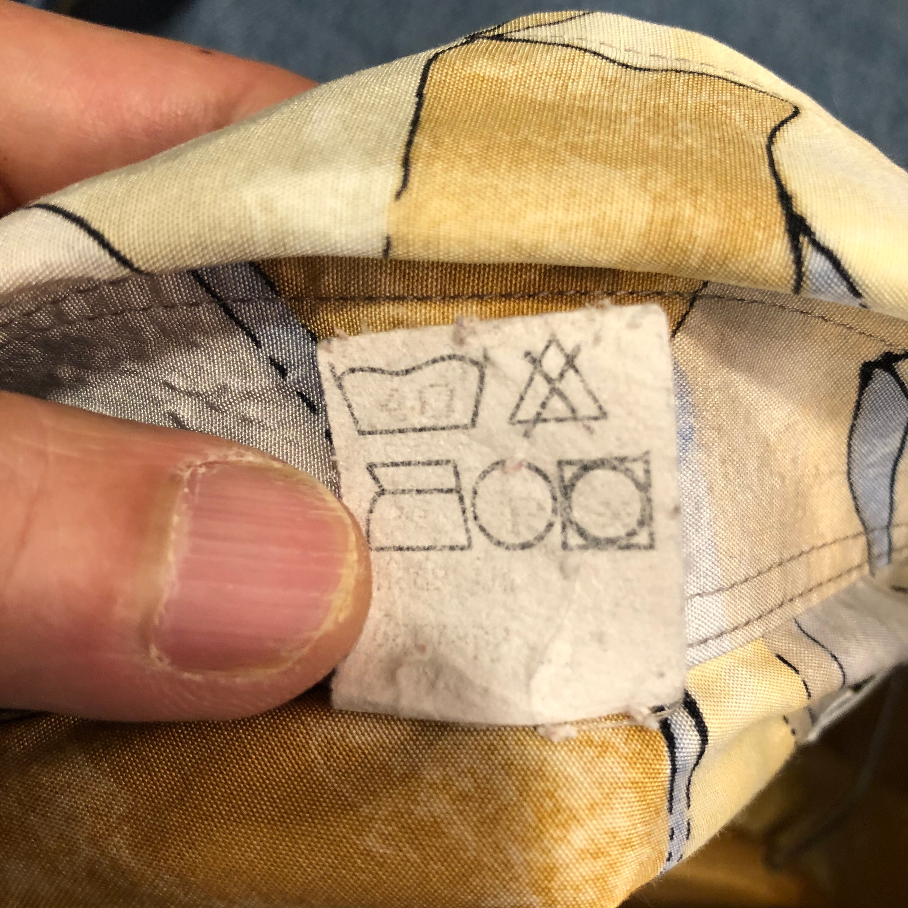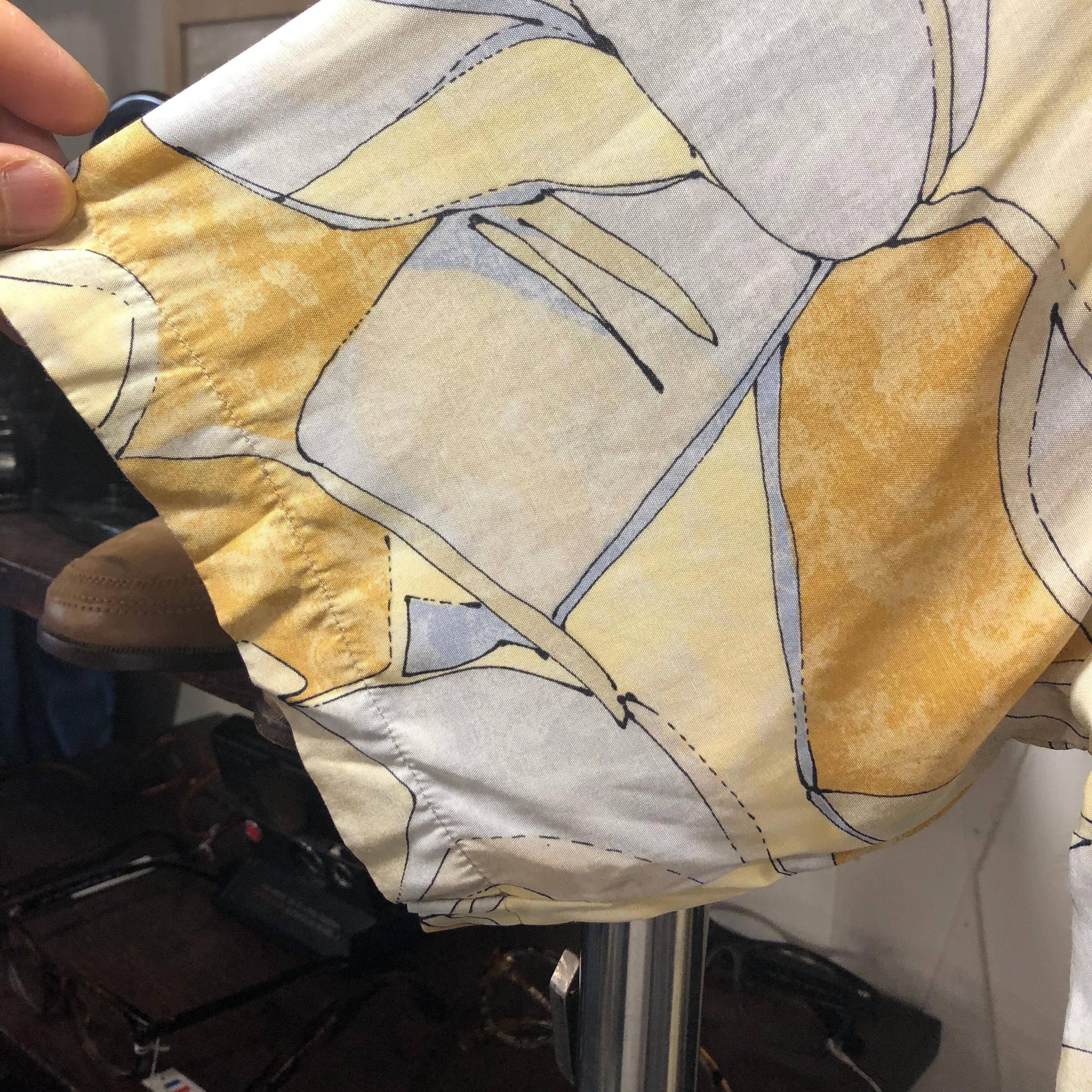 素材表記が掠れて見えないが、おそらくビスコース。テロンとした肌触り。色味は、パステル調のレモンイエロー×若草色×ライトグレー×オレンジ