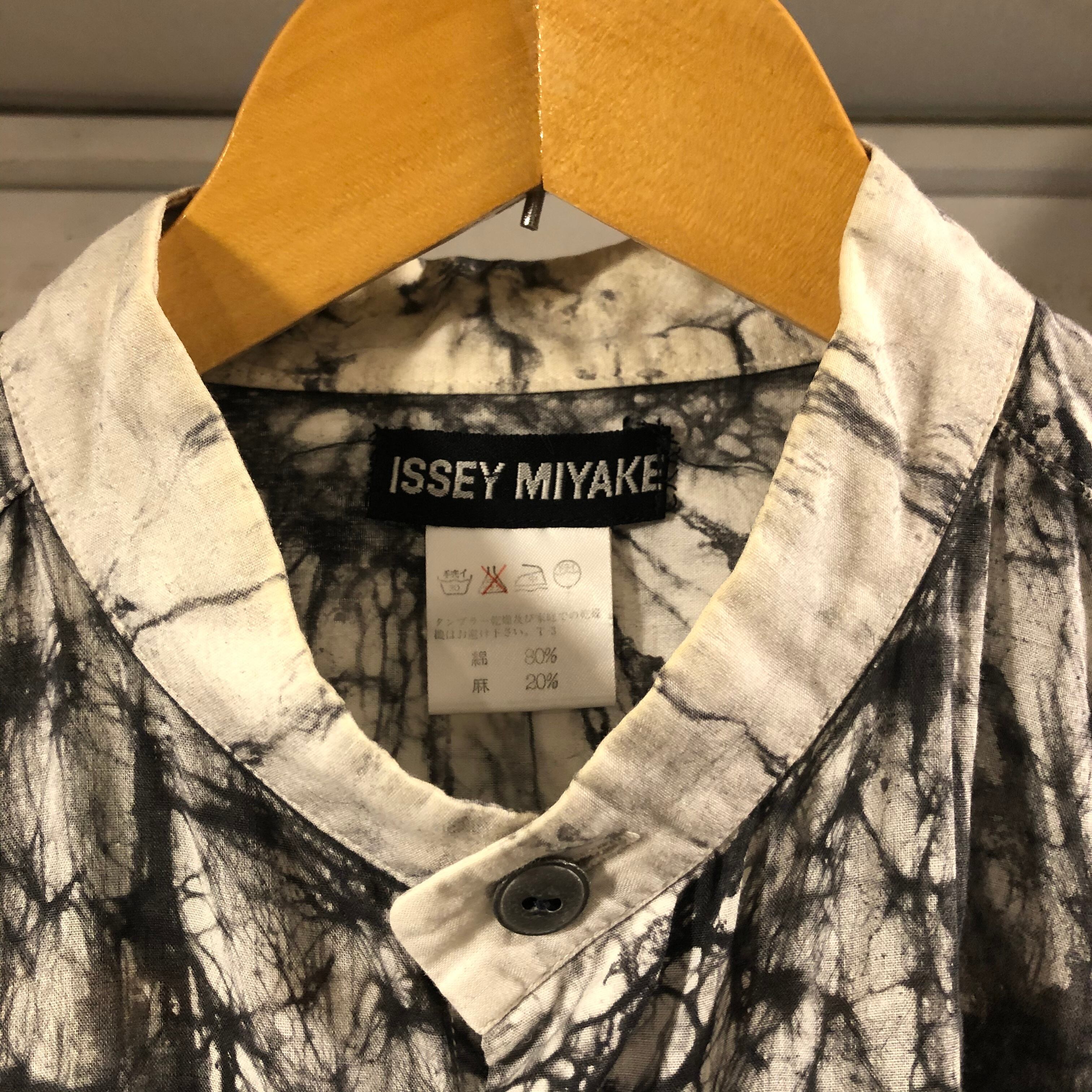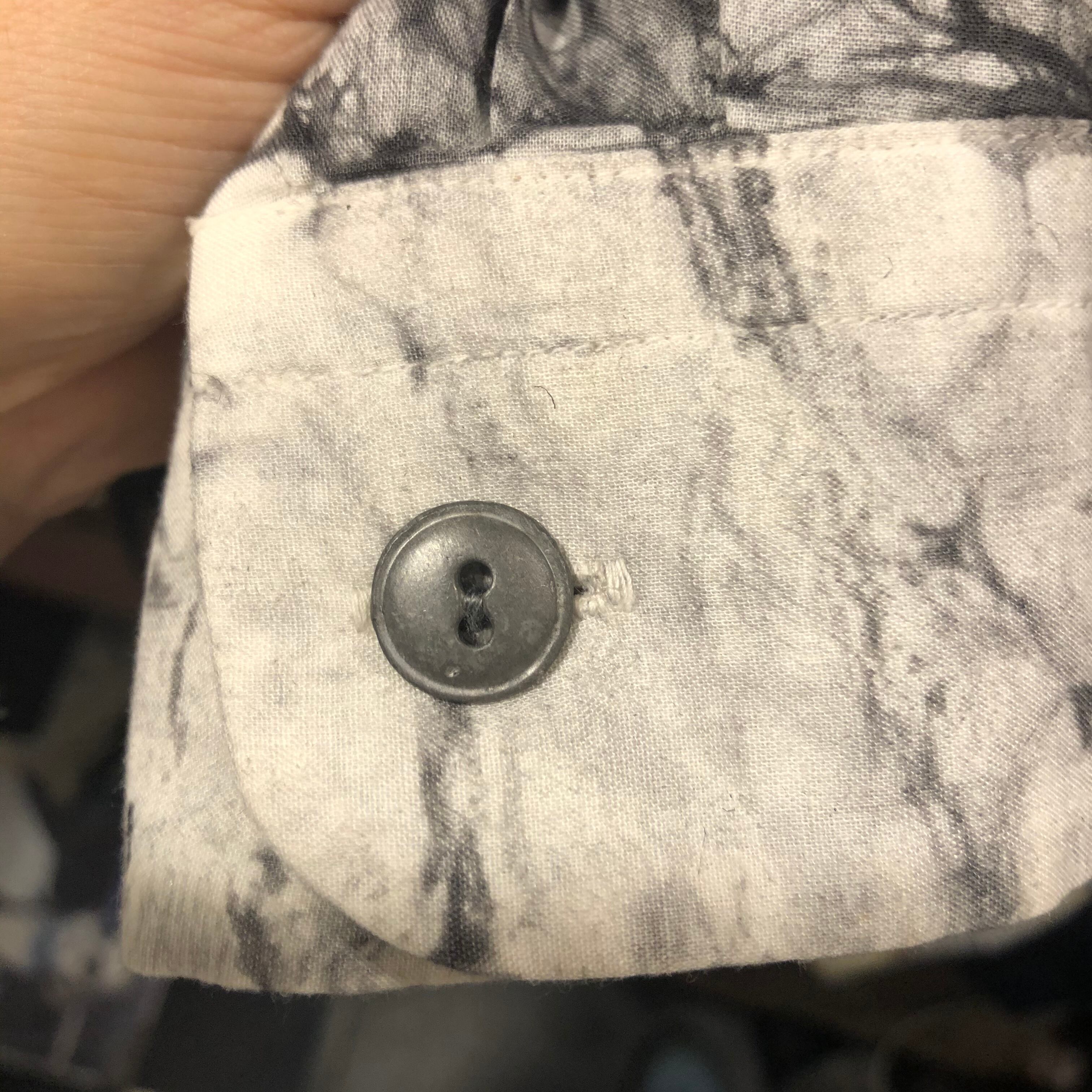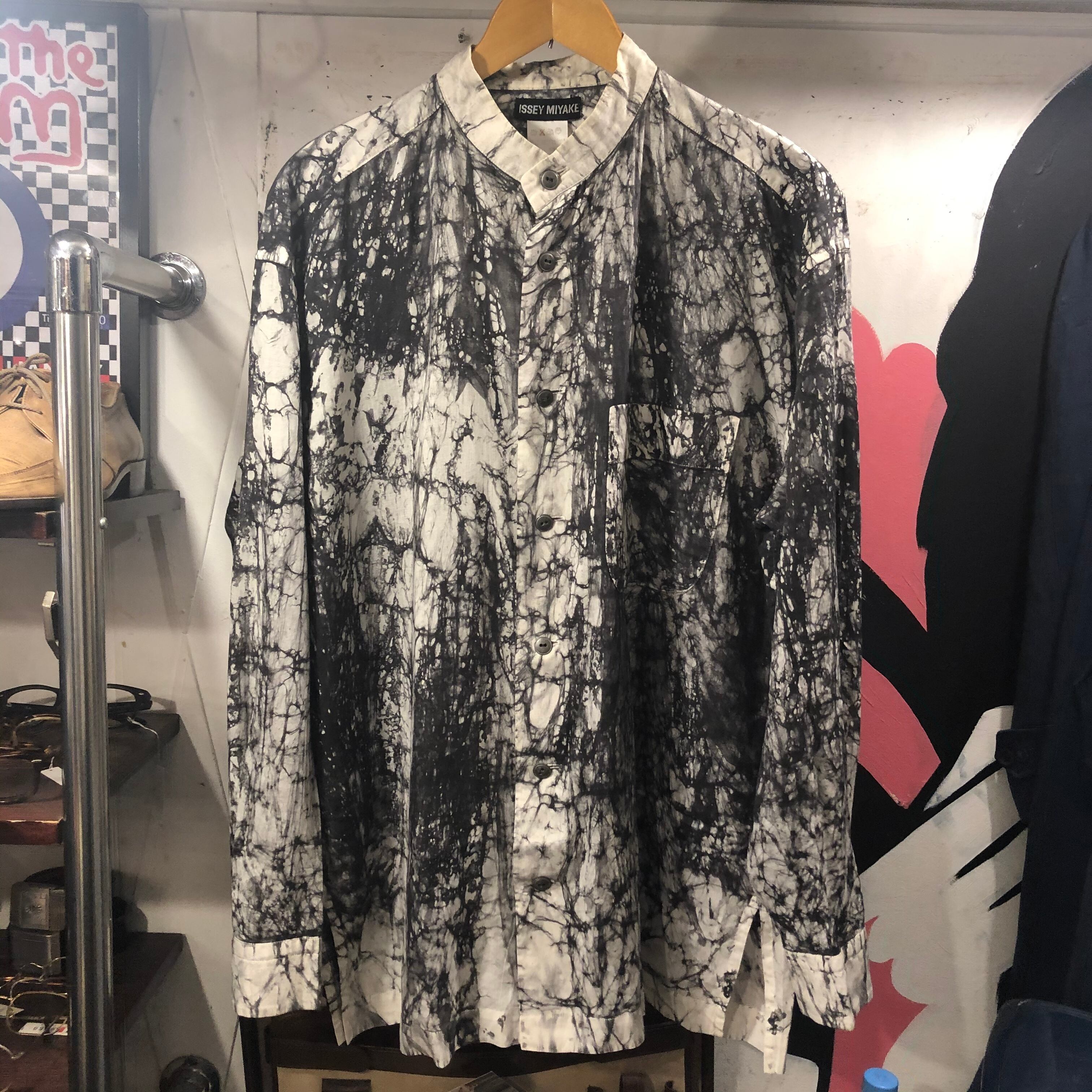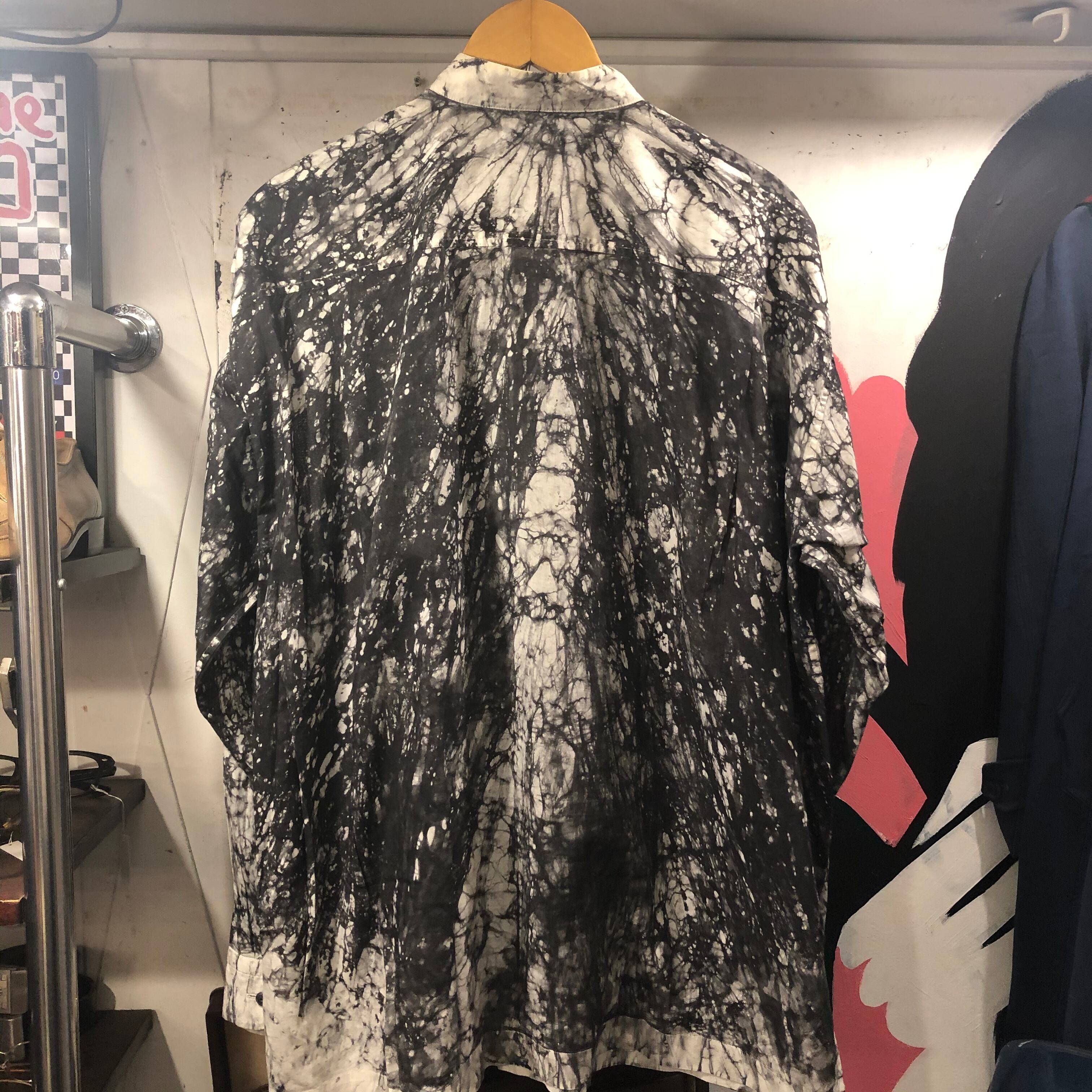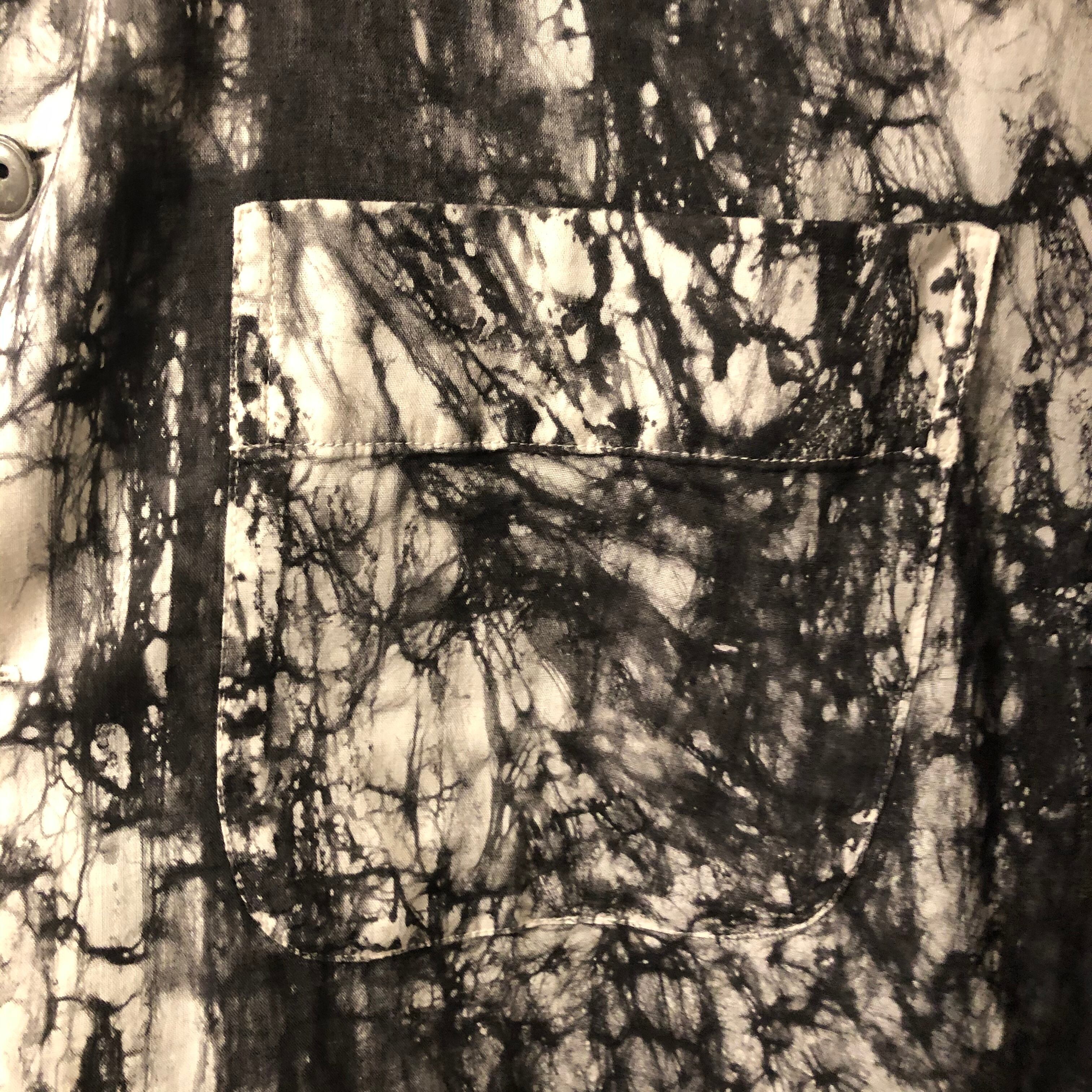 白シャツを墨汁の様な液体に浸して染め上げたのだろうか?なんだか迫力のある柄です。ボタンは、メタルボタン。生地は、綿80% 麻20%