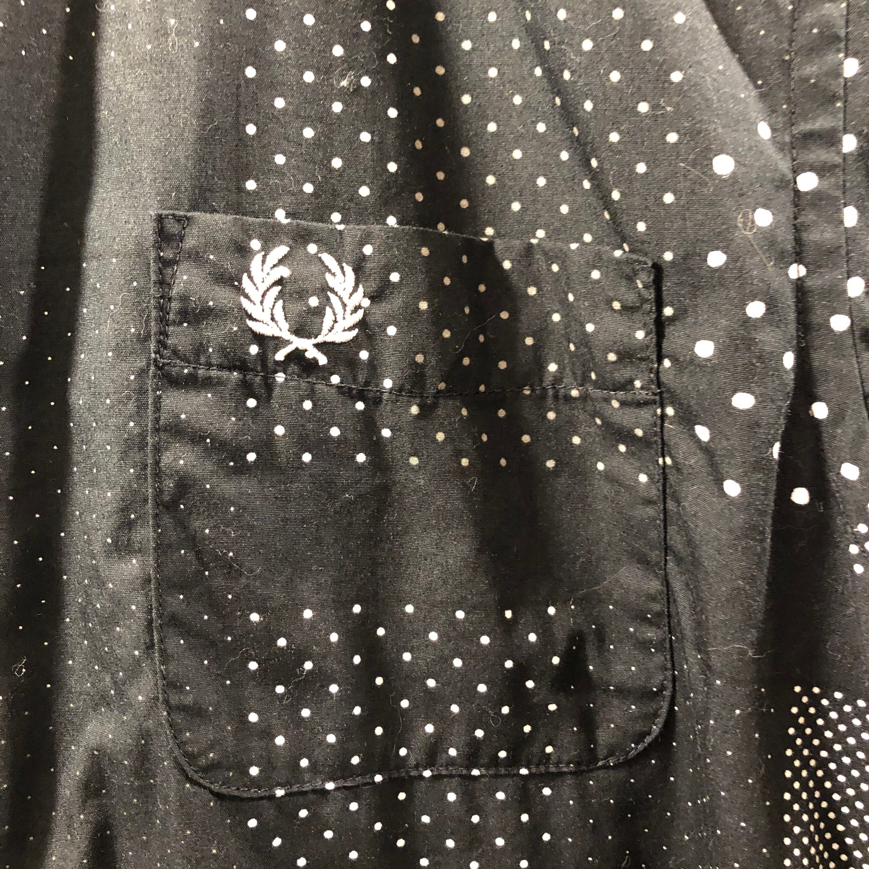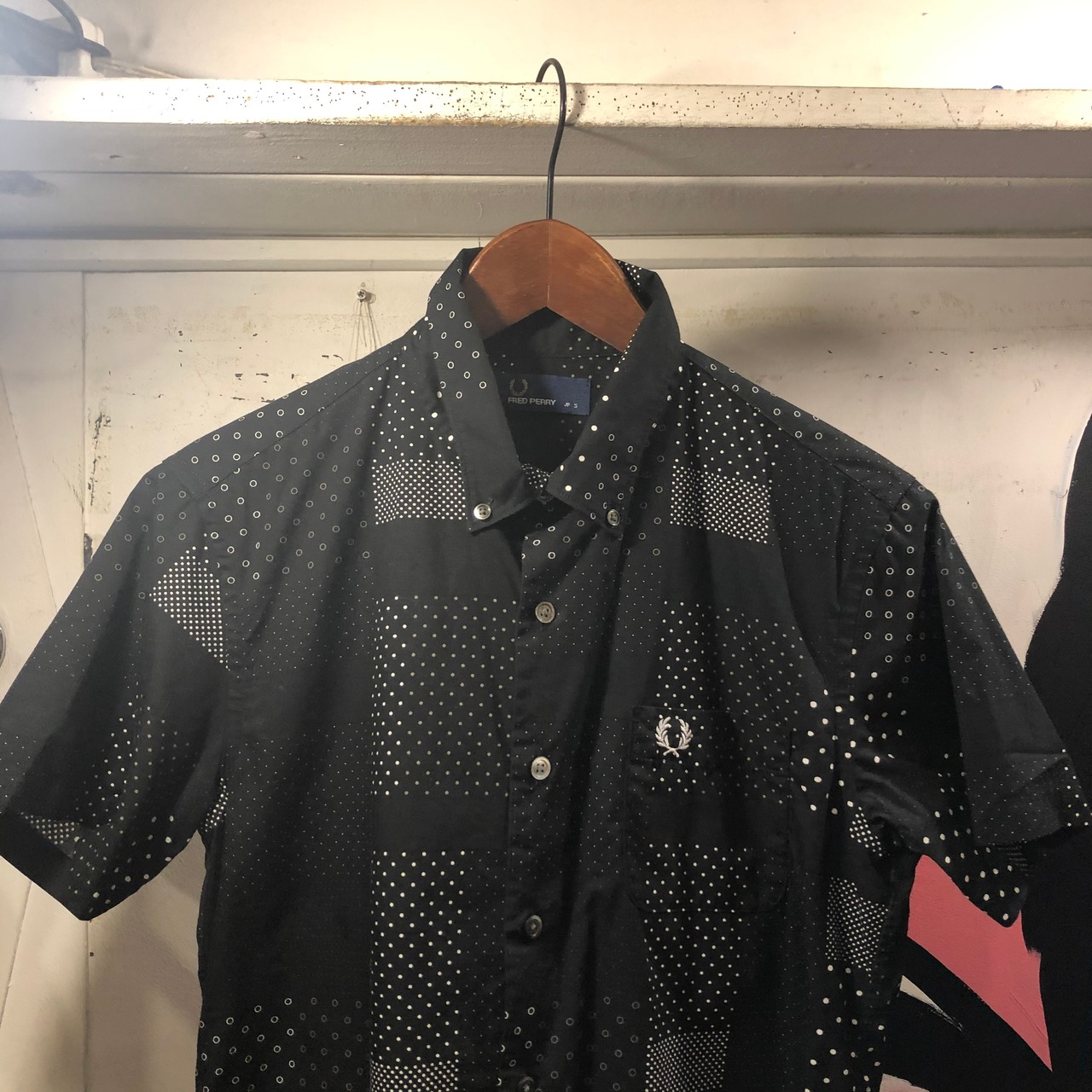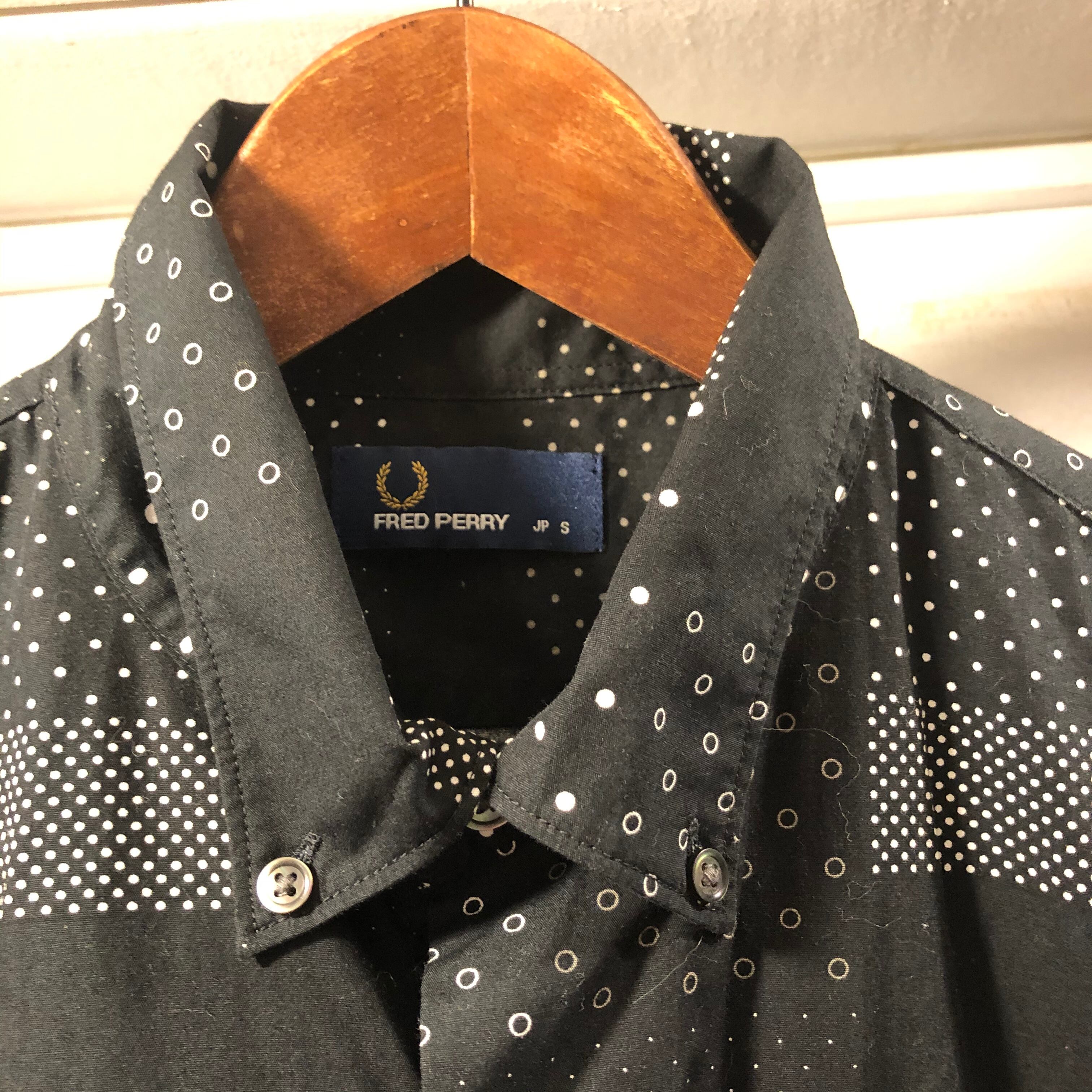 黒ボディーに、色々なタイプのドット柄がプリントされている。ボタンは、シェルボタンで細身のシルエット。
