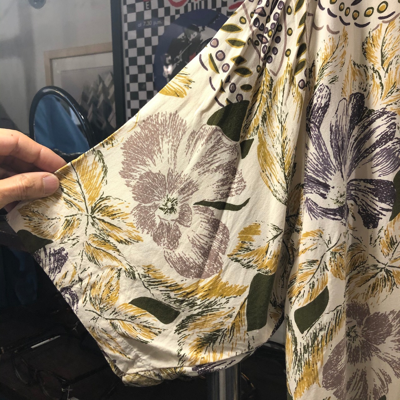 花柄と大きなペイズリー柄、鋭角なフォルムの襟に、四角形のボタン。比翼仕立て。