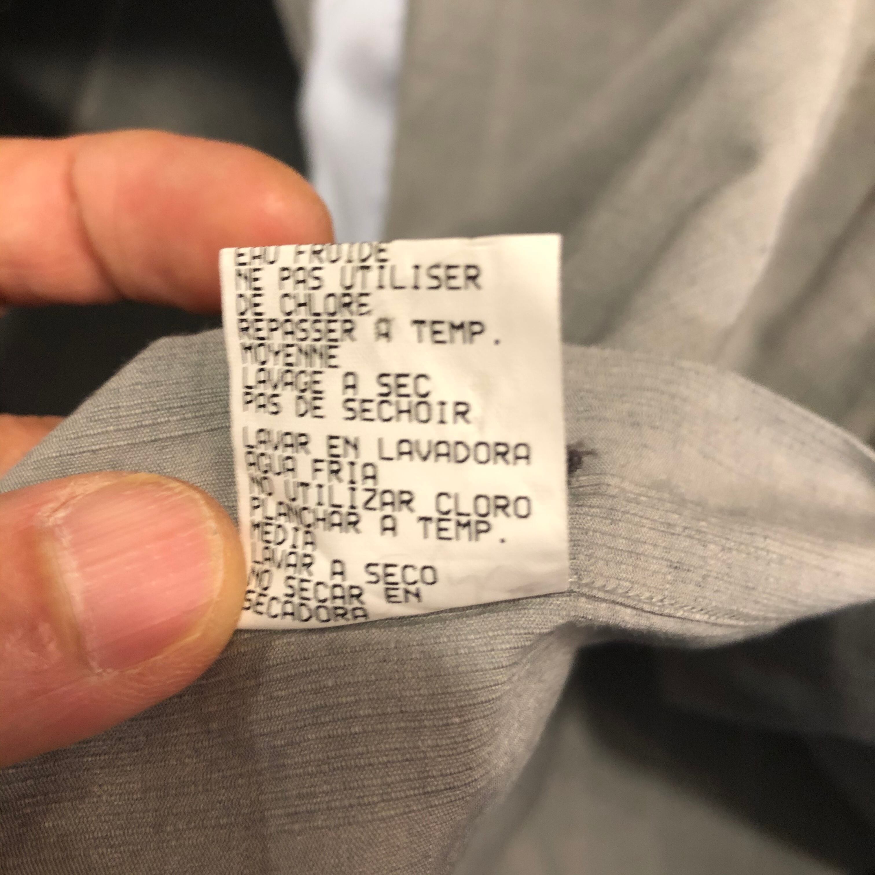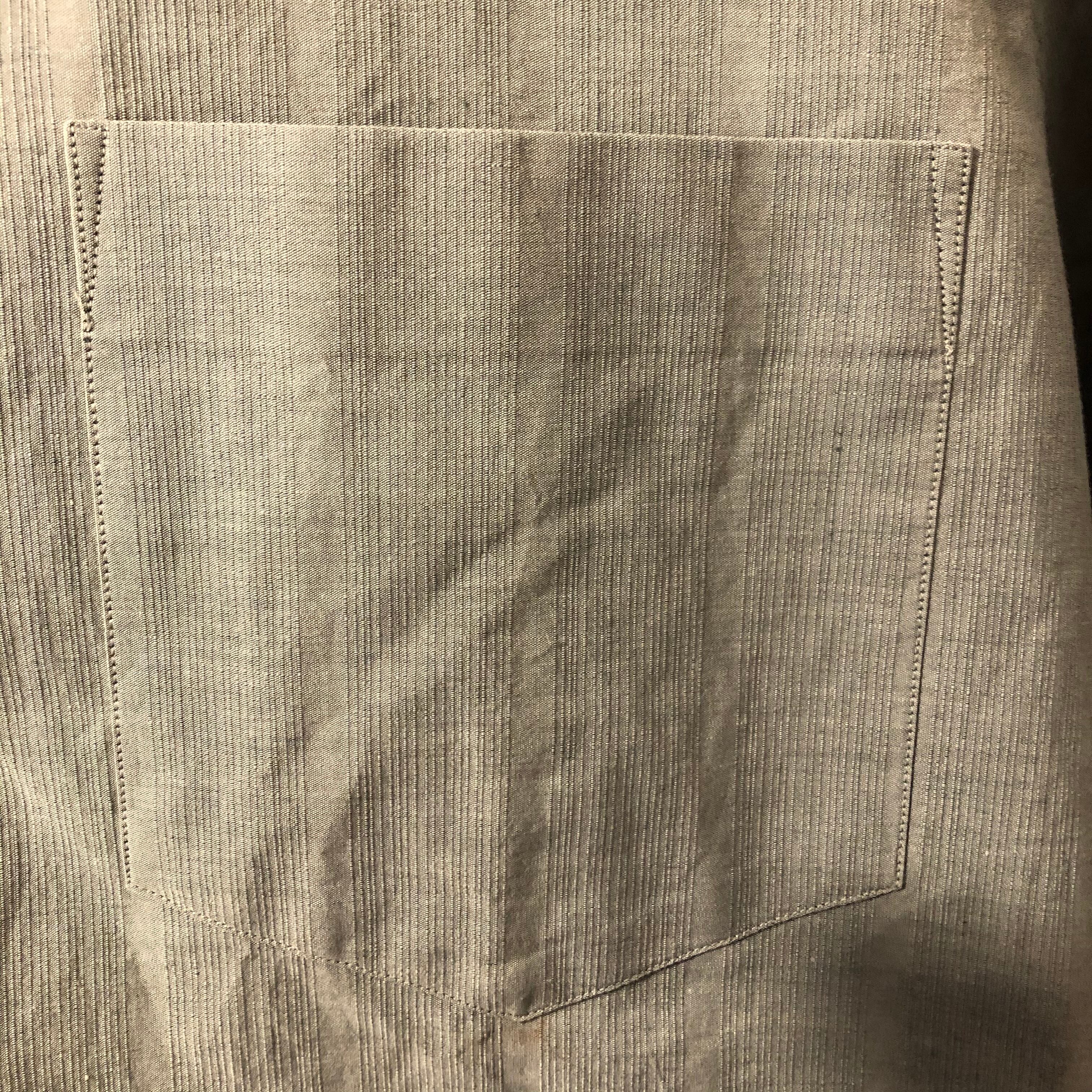 シャツの色はグレーで、たくさんのピンストライプが密集して2.5cm幅の太いストライプを構成しています。ピンストライプは、少し凹凸があるので、その肌にベタつかずサラッとした肌触りです。ボタンは、チャコールグレーのシェルボタン。