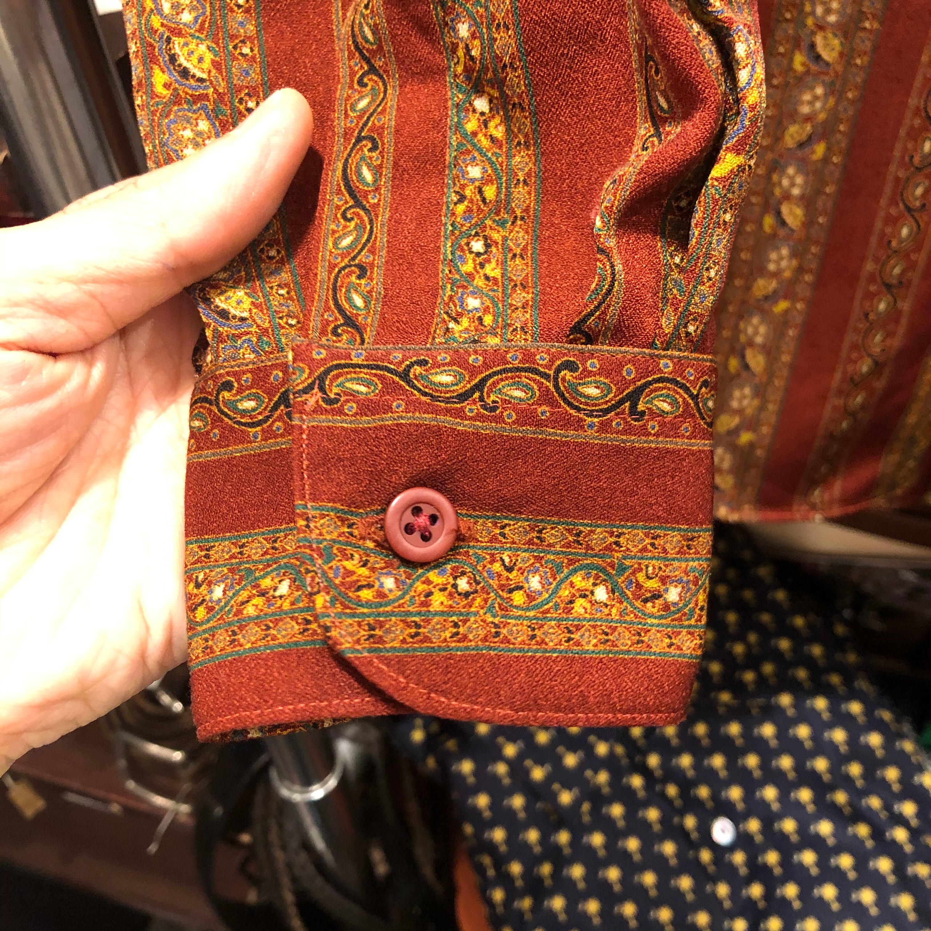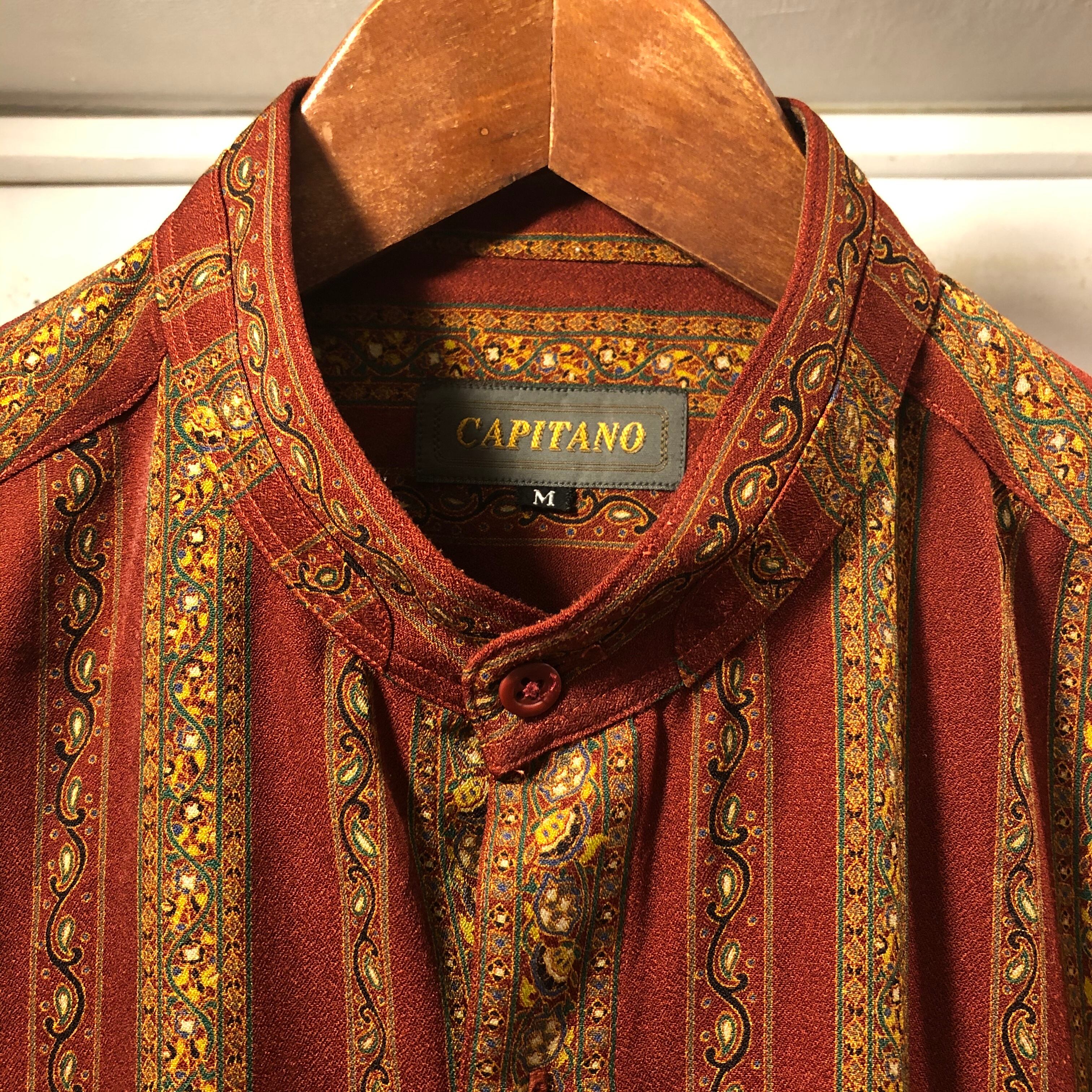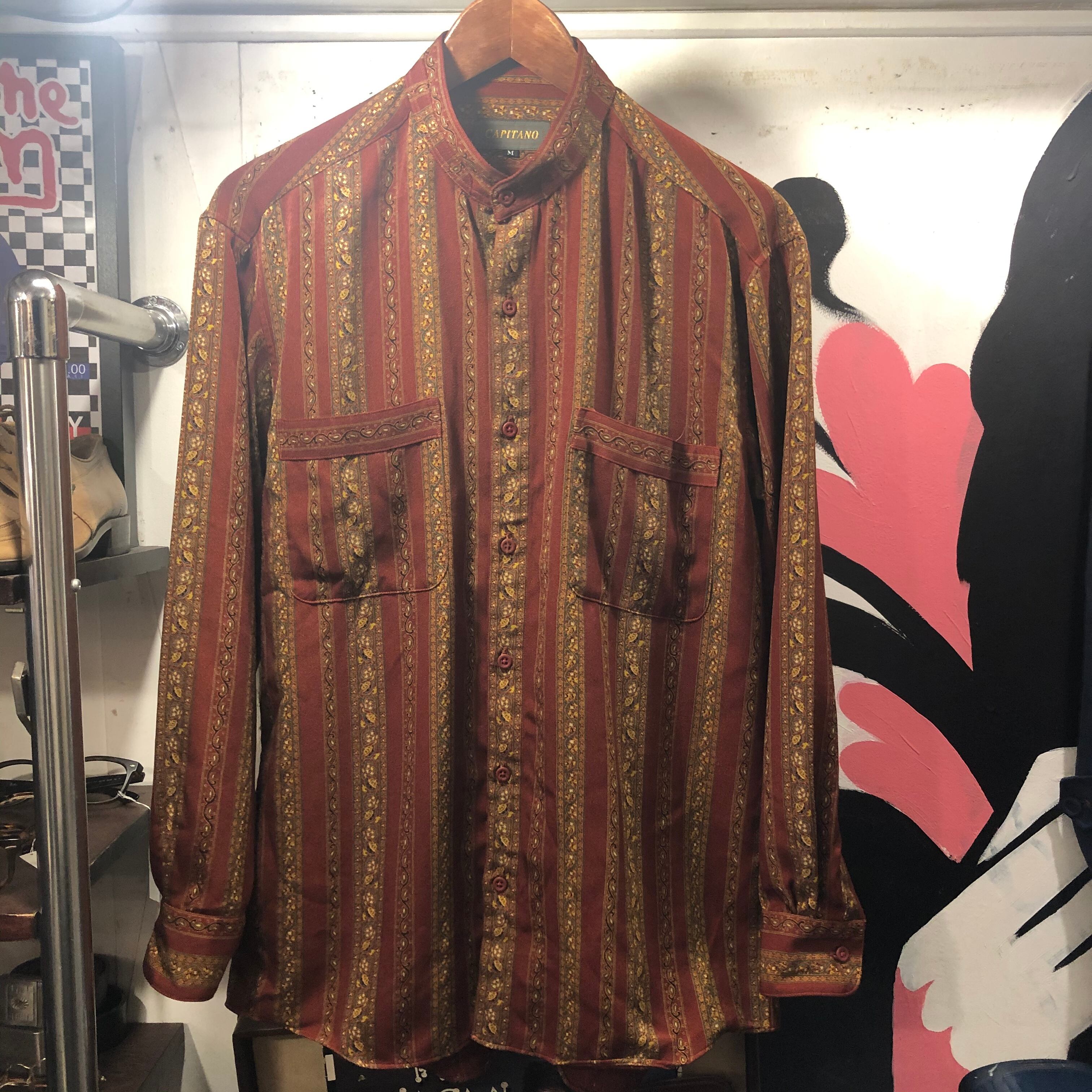 えんじ色をベースカラーに、ペイズリー柄がストライプ状にプリントされたスタンドカラーシャツ。素材は、やや厚地のポリエステル100%肌触りや質感は、レーヨンのようにテロンとした感じ。