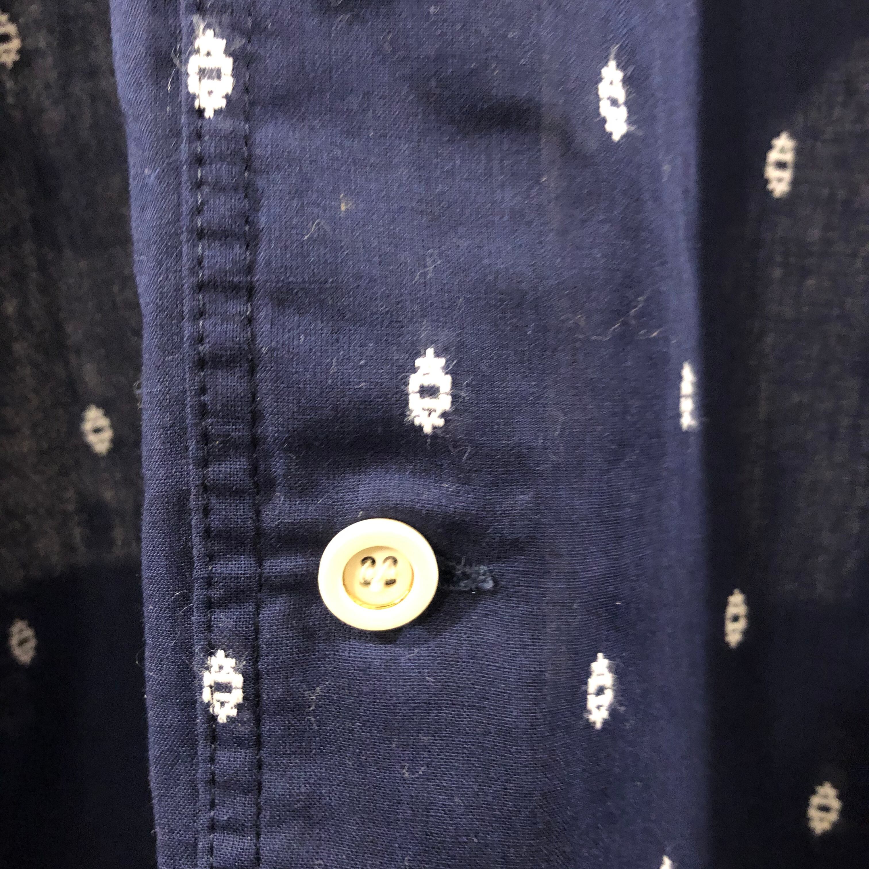 きめの細かいコットンローン生地で、透け感のある70'sらしい細身の半袖開襟シャツ。白い小紋柄は、刺繍。ヴィンテージ らしい雰囲気。フレアパンツと相性が良いと思います。