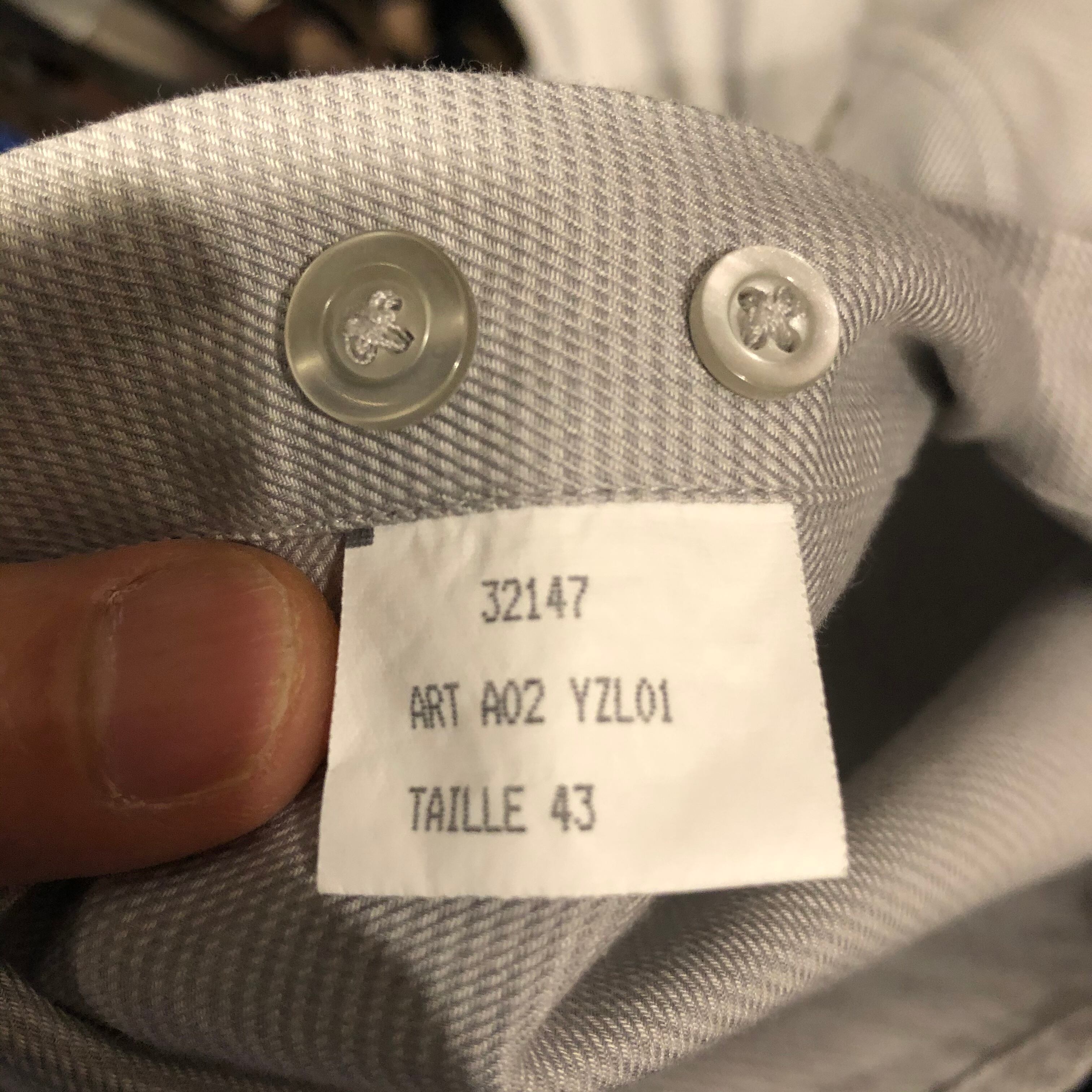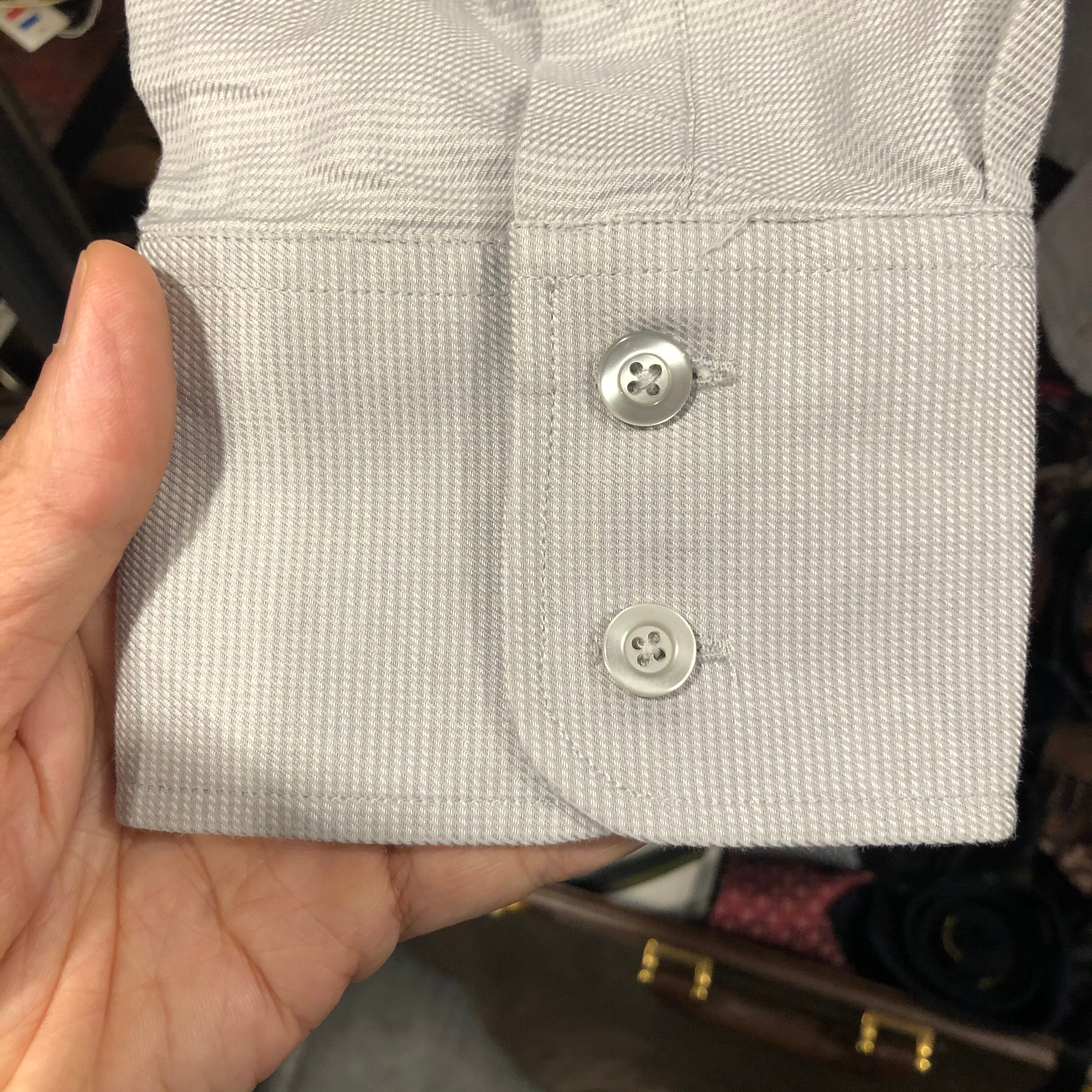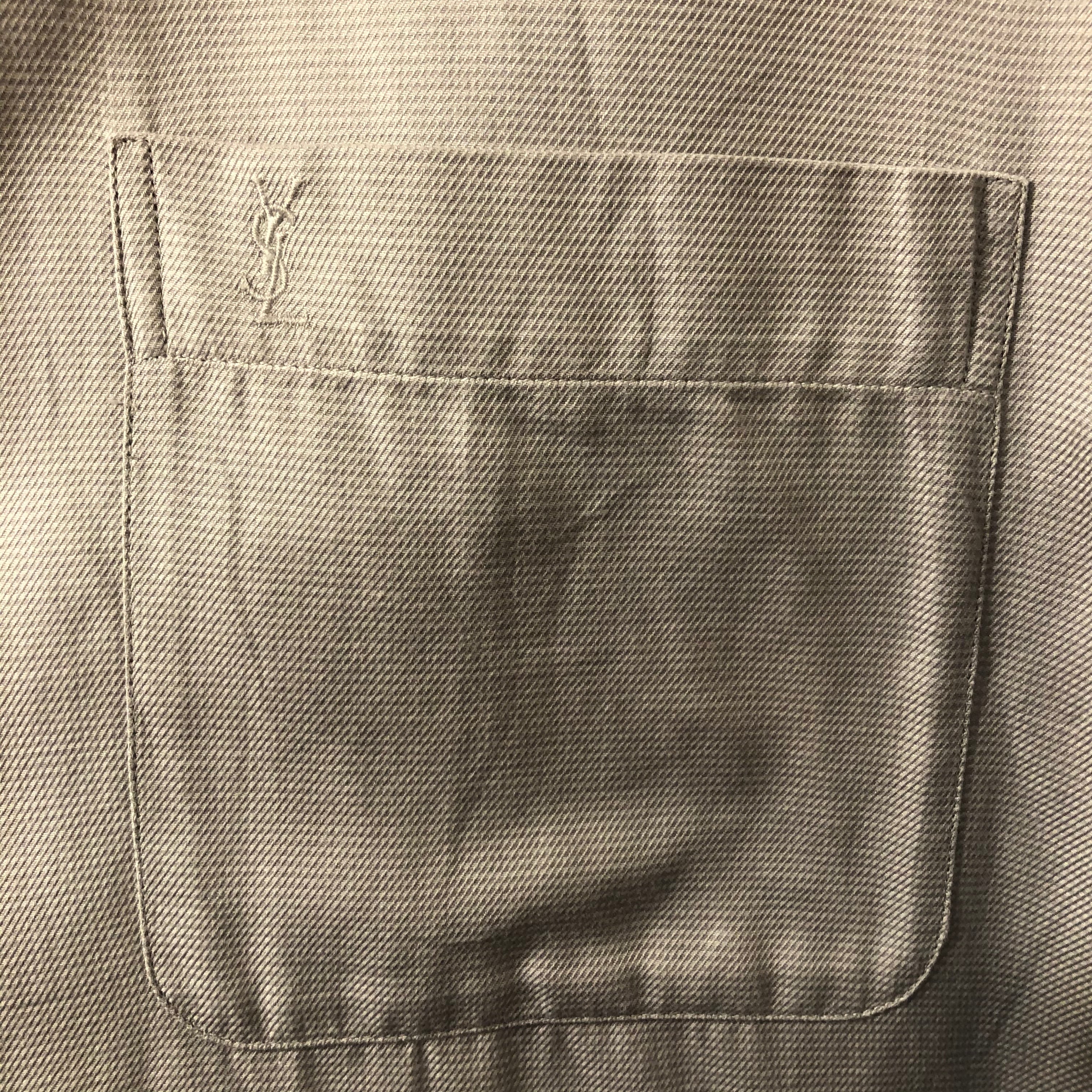 ライトグレー×ホワイトグレーの糸を交互にツイル織で織り込まれた生地。そのため、生地が立体的でシルバーぽい光沢感が生まれる。ボタンは、クリアライトグレー。ポケットには、イブサンローランの刺繍ロゴ。都会的なスタイリッシュな雰囲気のシャツ。