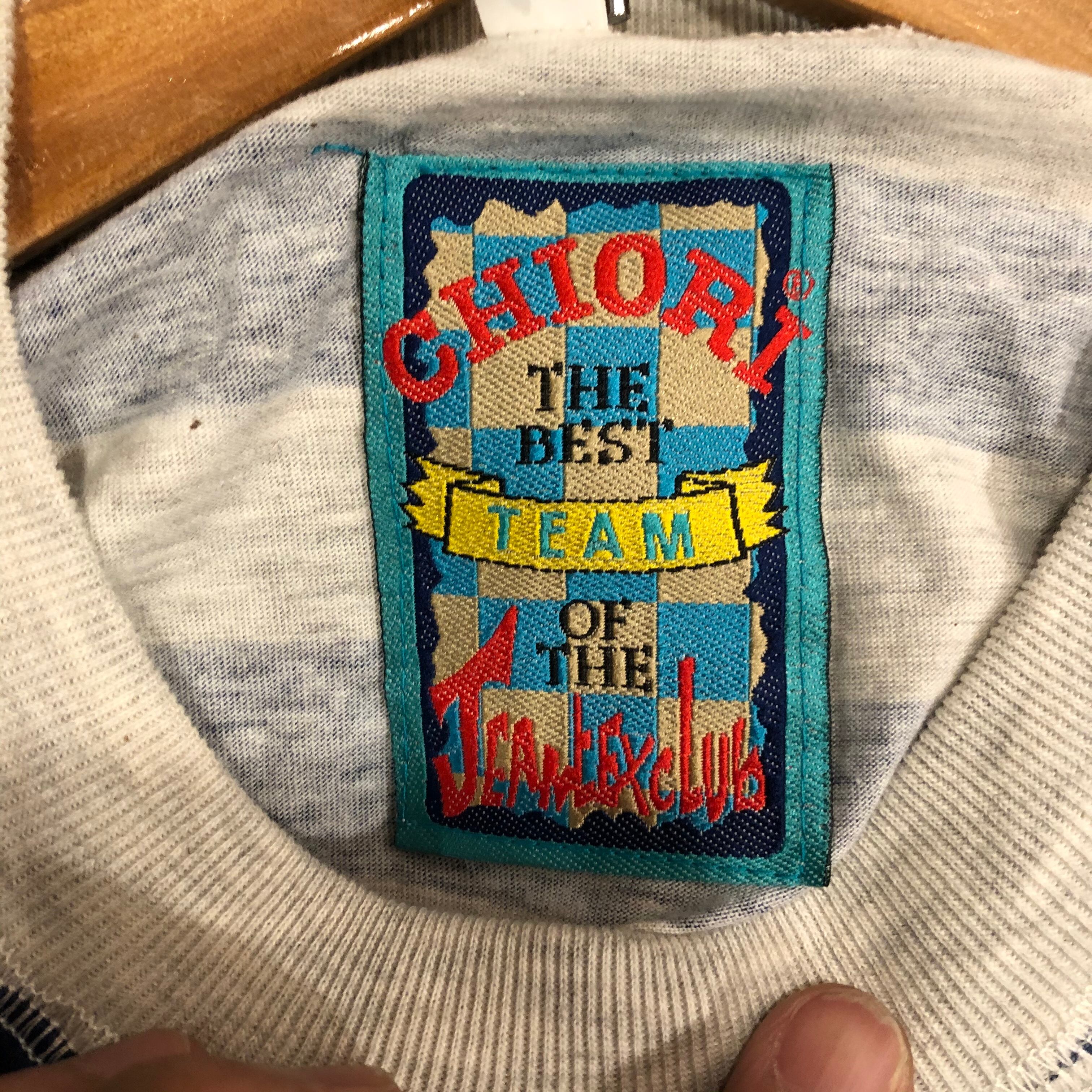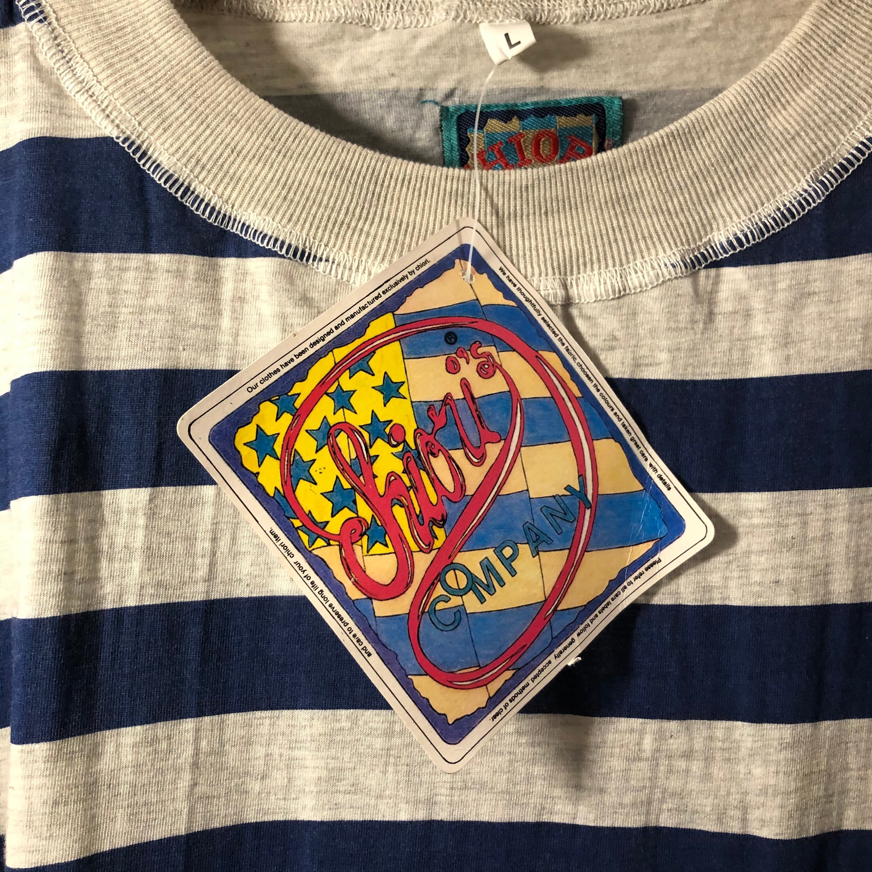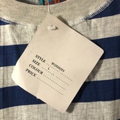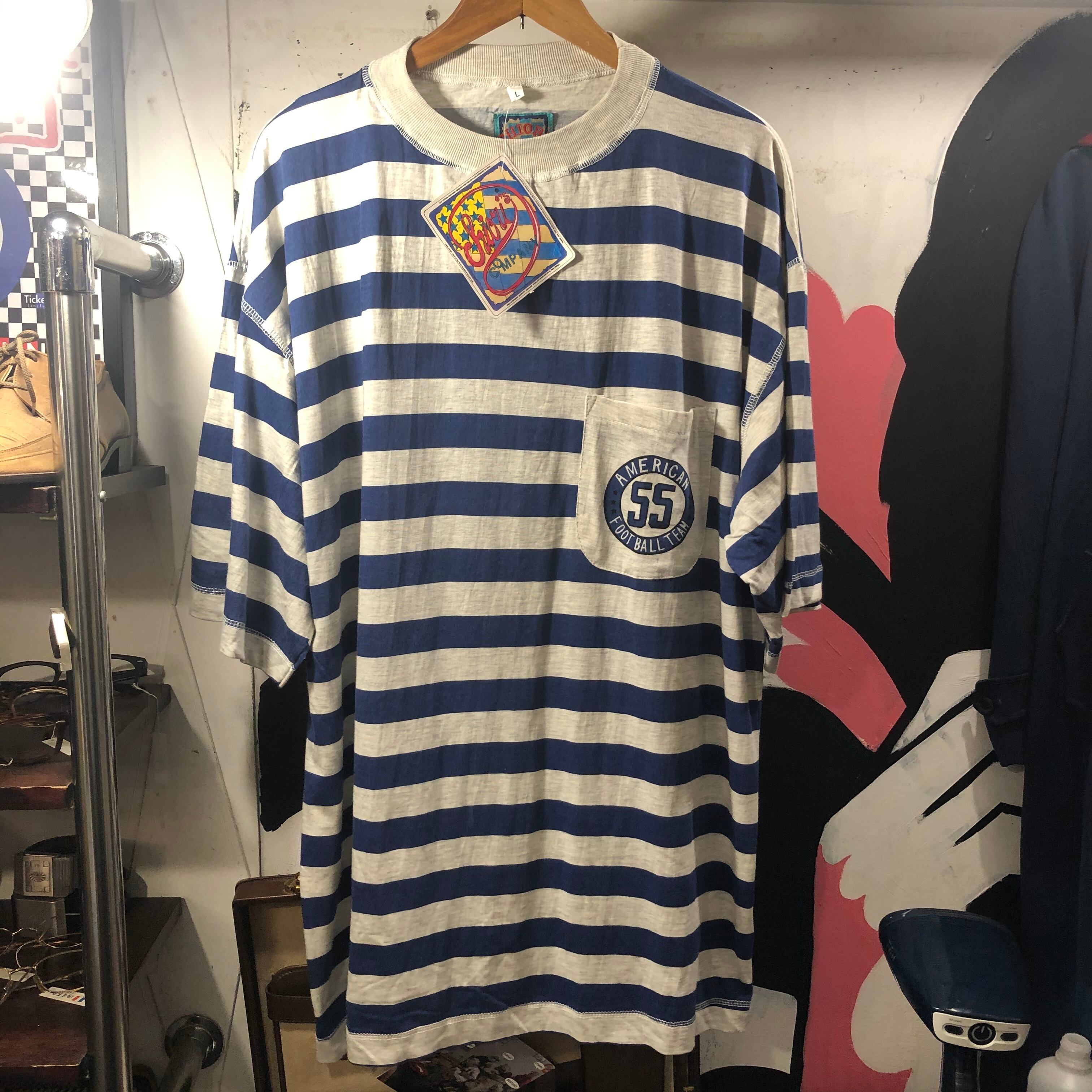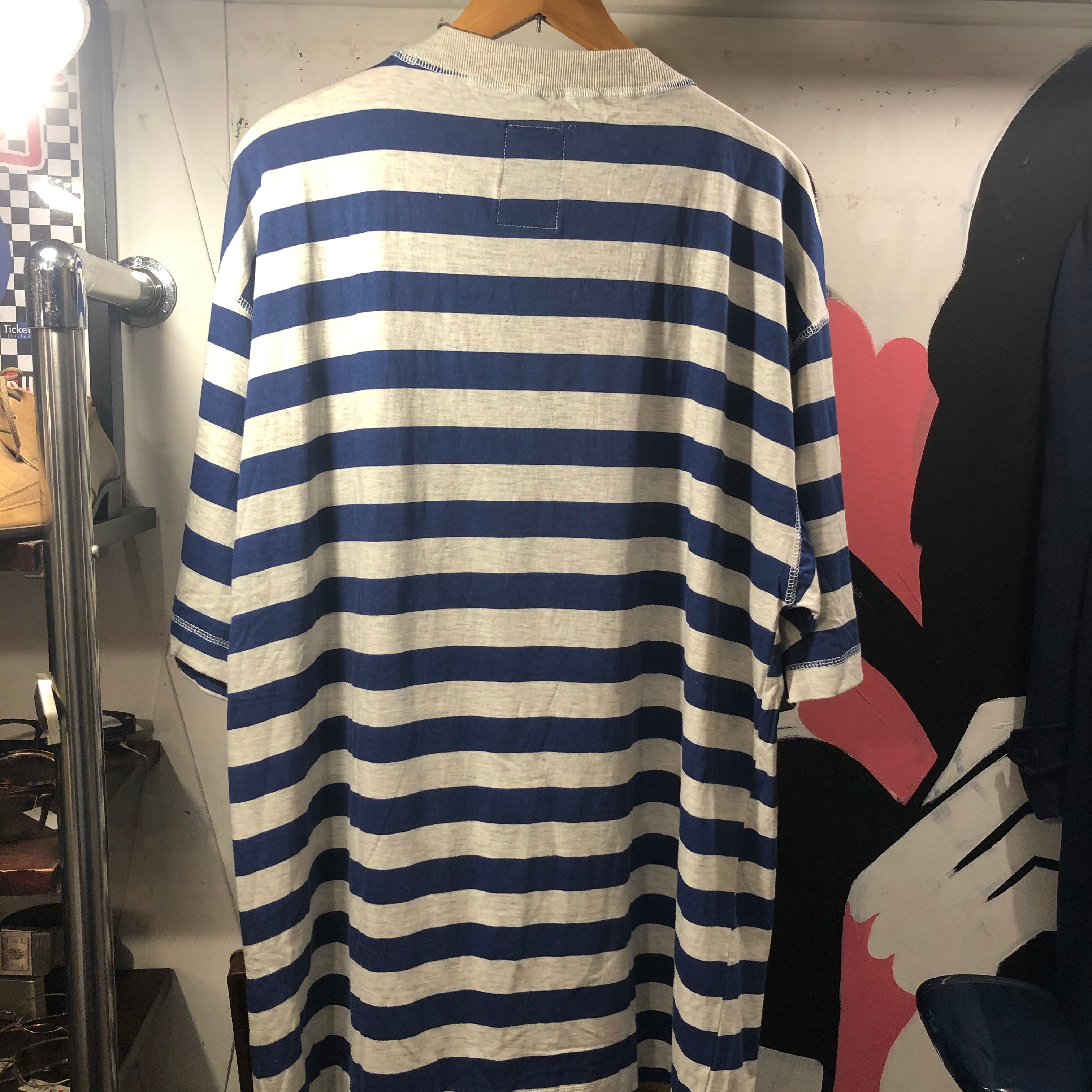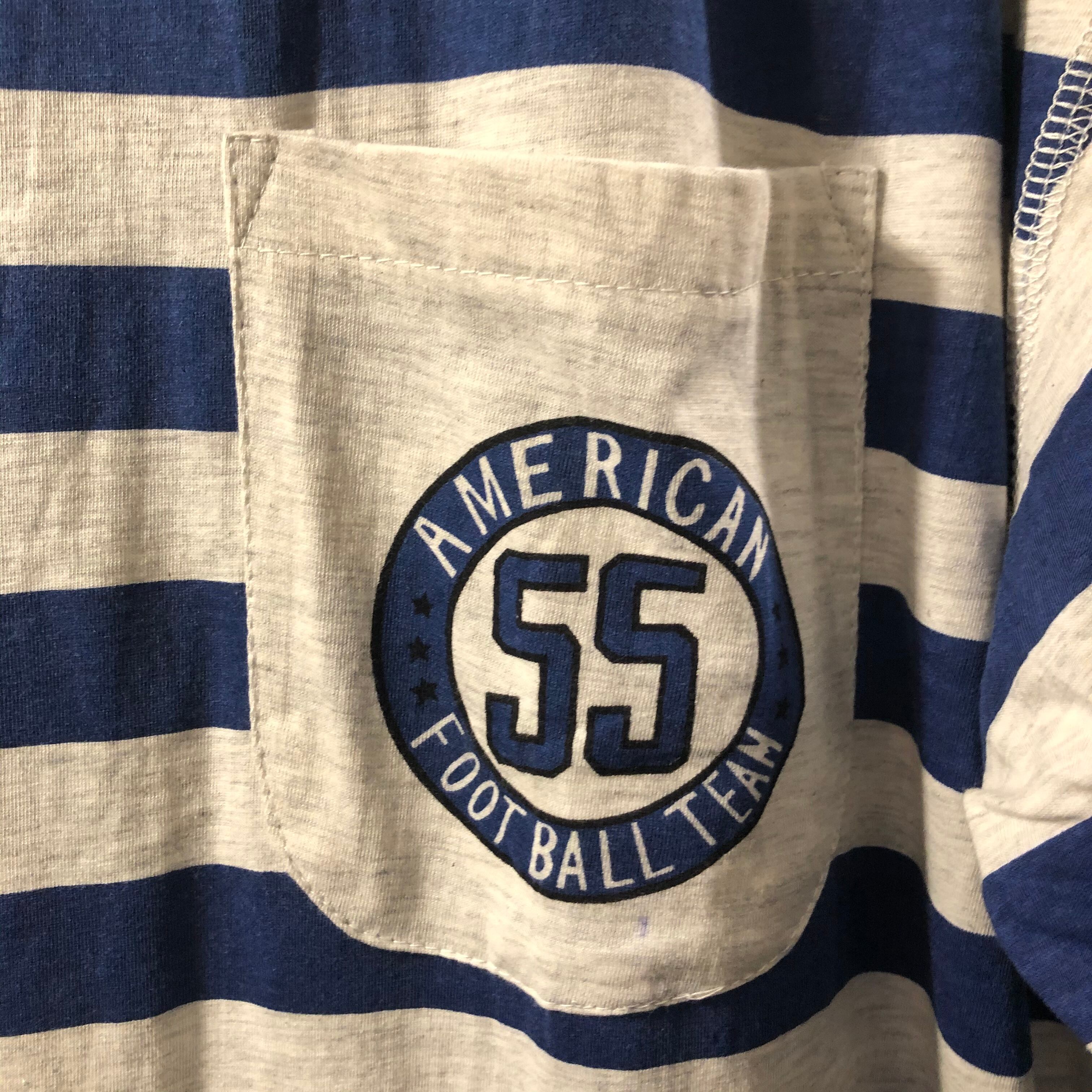 やや濃いめのブルー×ライトグレーのボーダーTシャツ。ポップなデザインの胸ポケットが特徴。