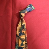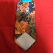 オレンジをメインにしたフラワープリントのタイです。素材は、ポリエステル100%