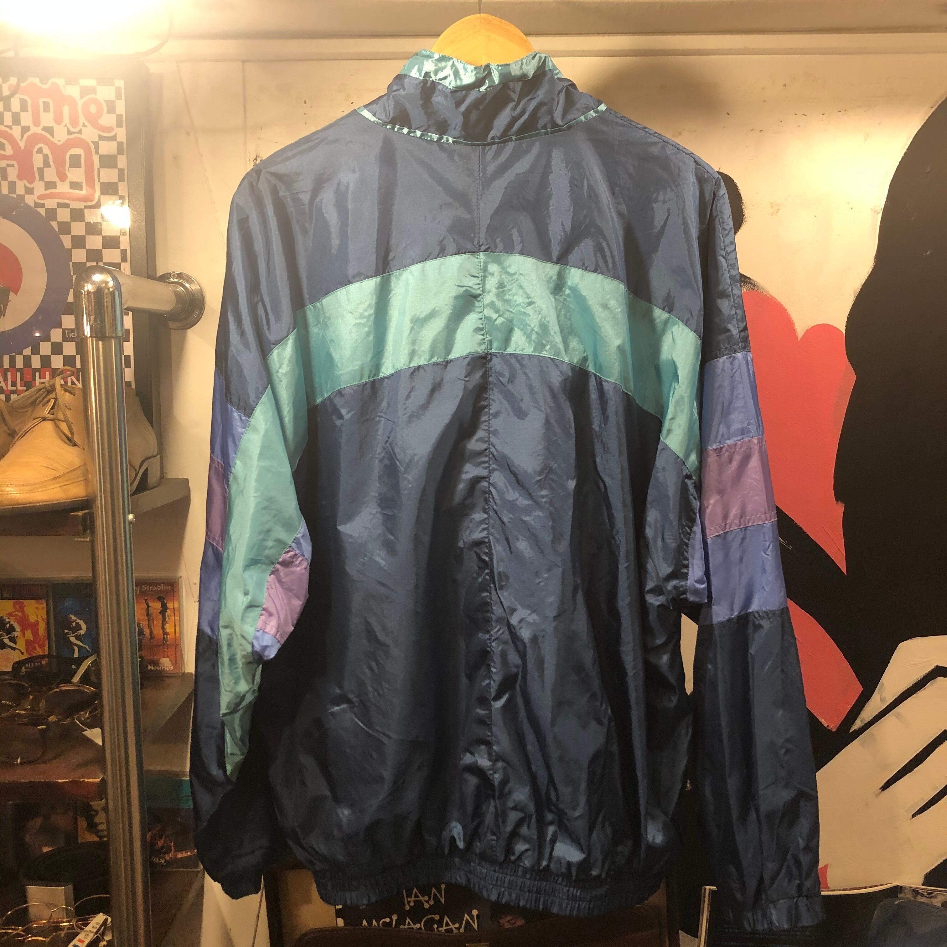 メタリックなグリーン×パープル×ネイビーのカラーリングのウィンドブレーカー。生産国と素材表記が取れてしまっていて、不明な点があるが、オランダから仕入れた物です。