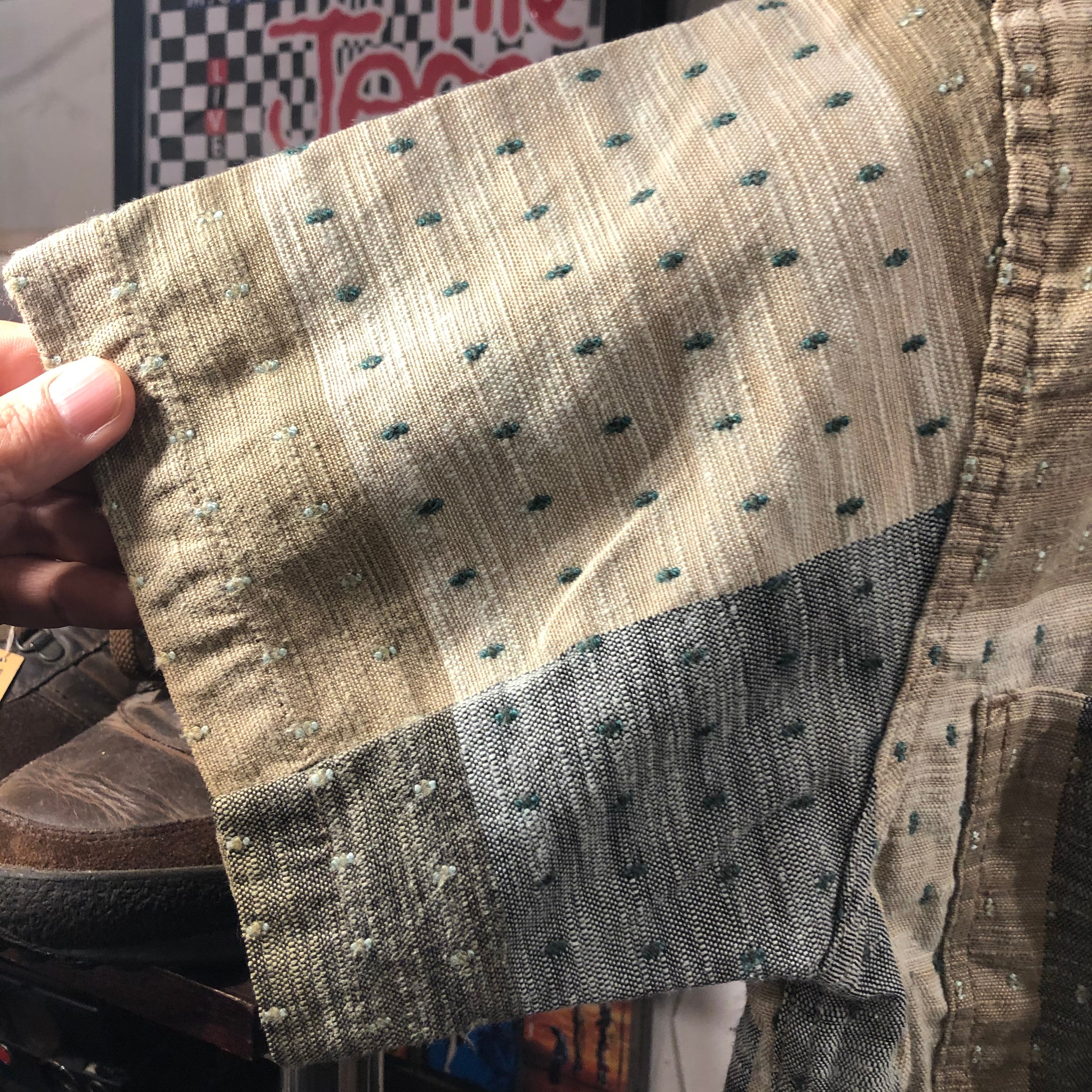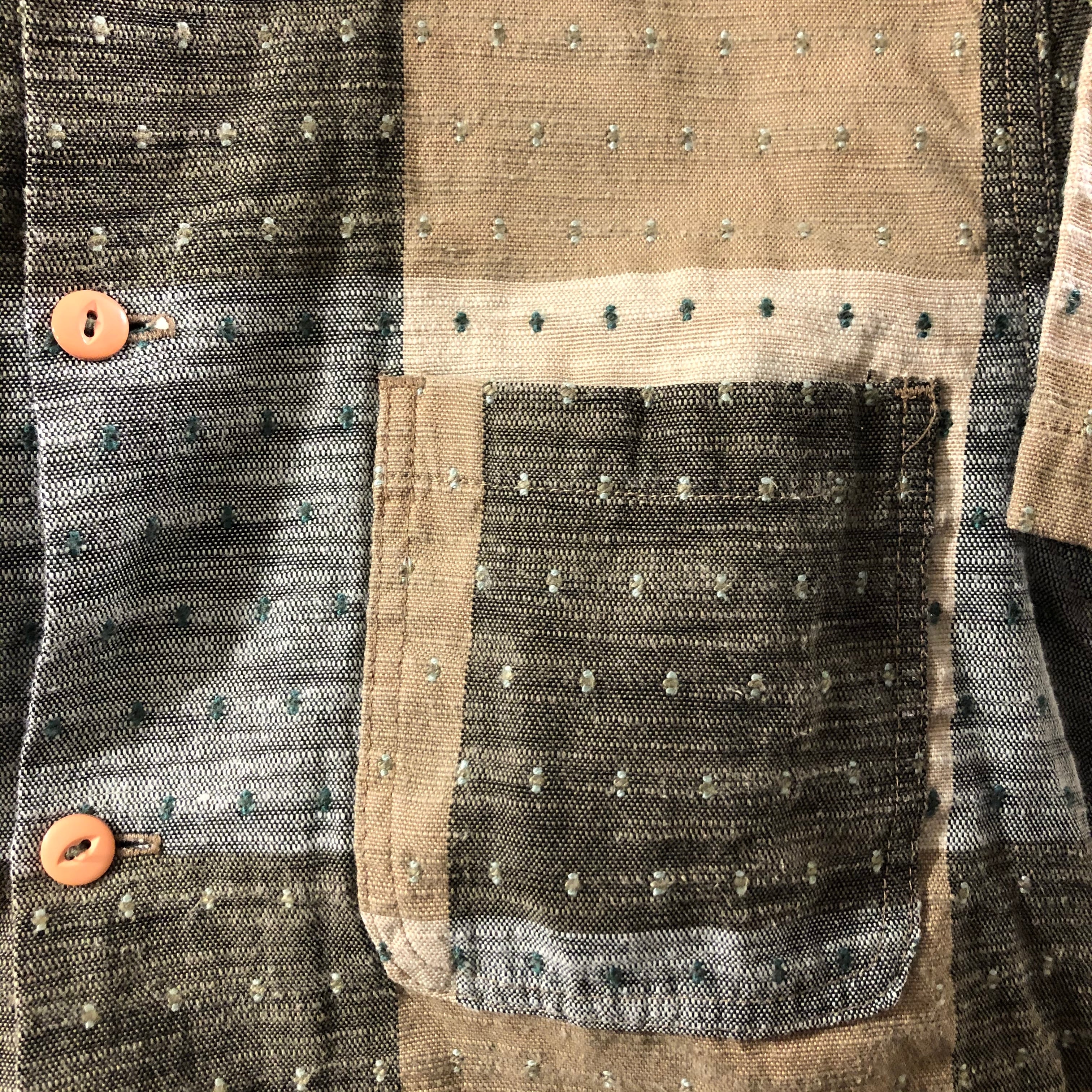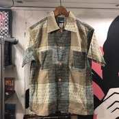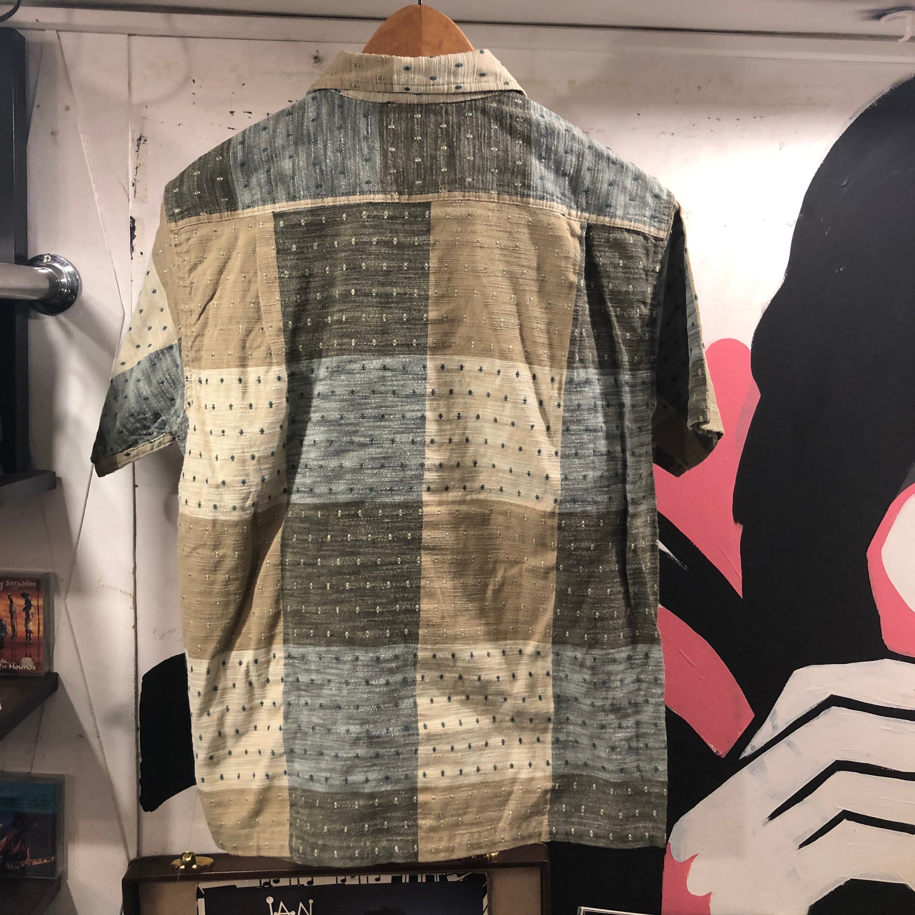 頒布のようなしっかりとした生地に、クラフト感満載のパッチワークデザインの半袖シャツ。