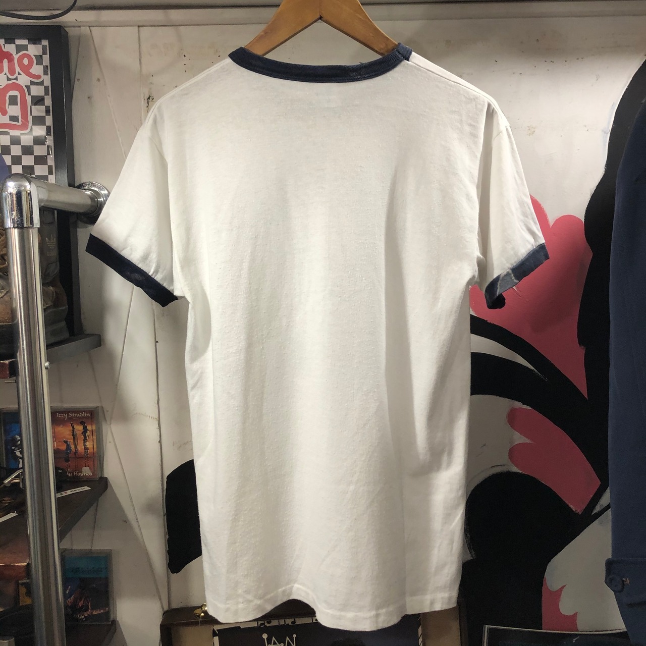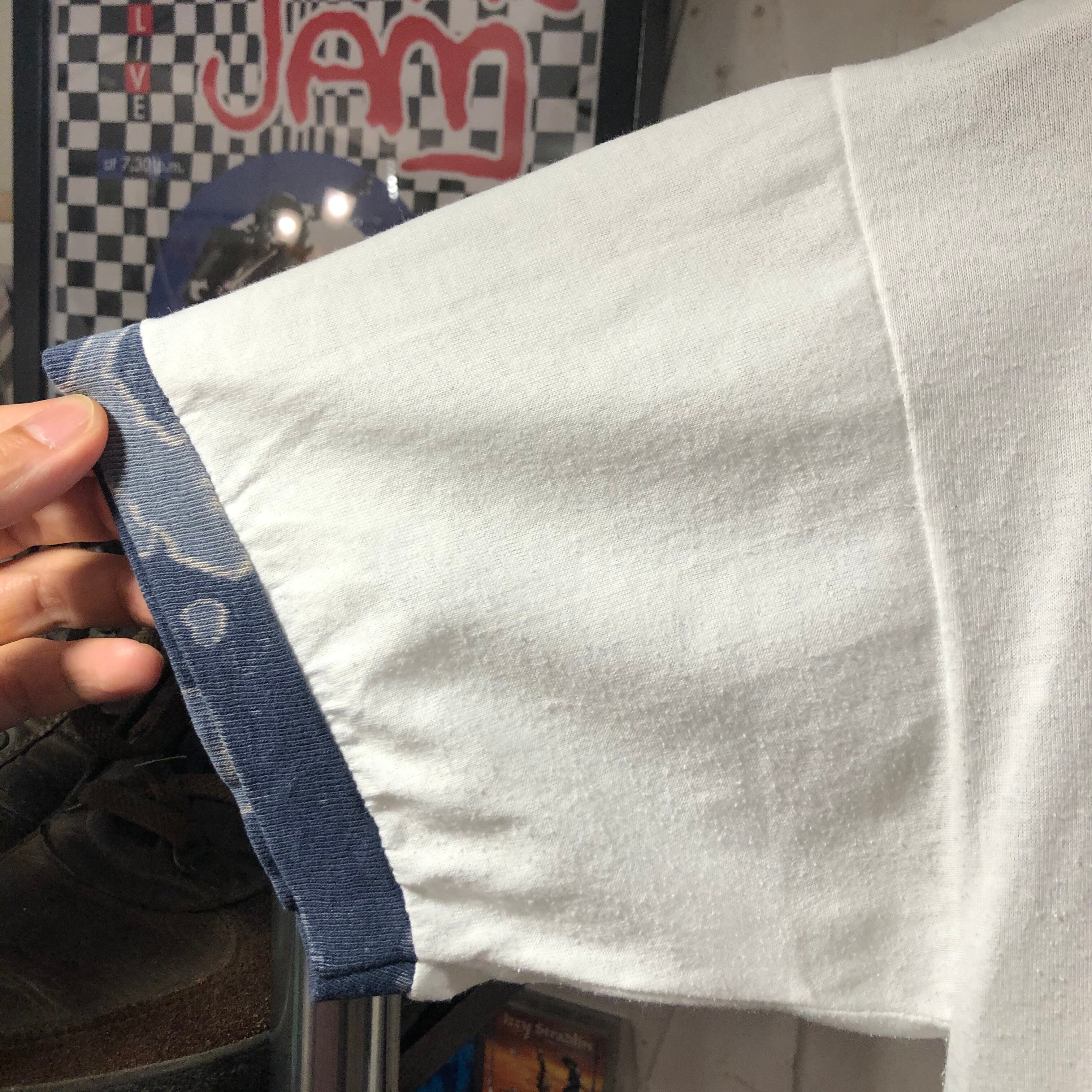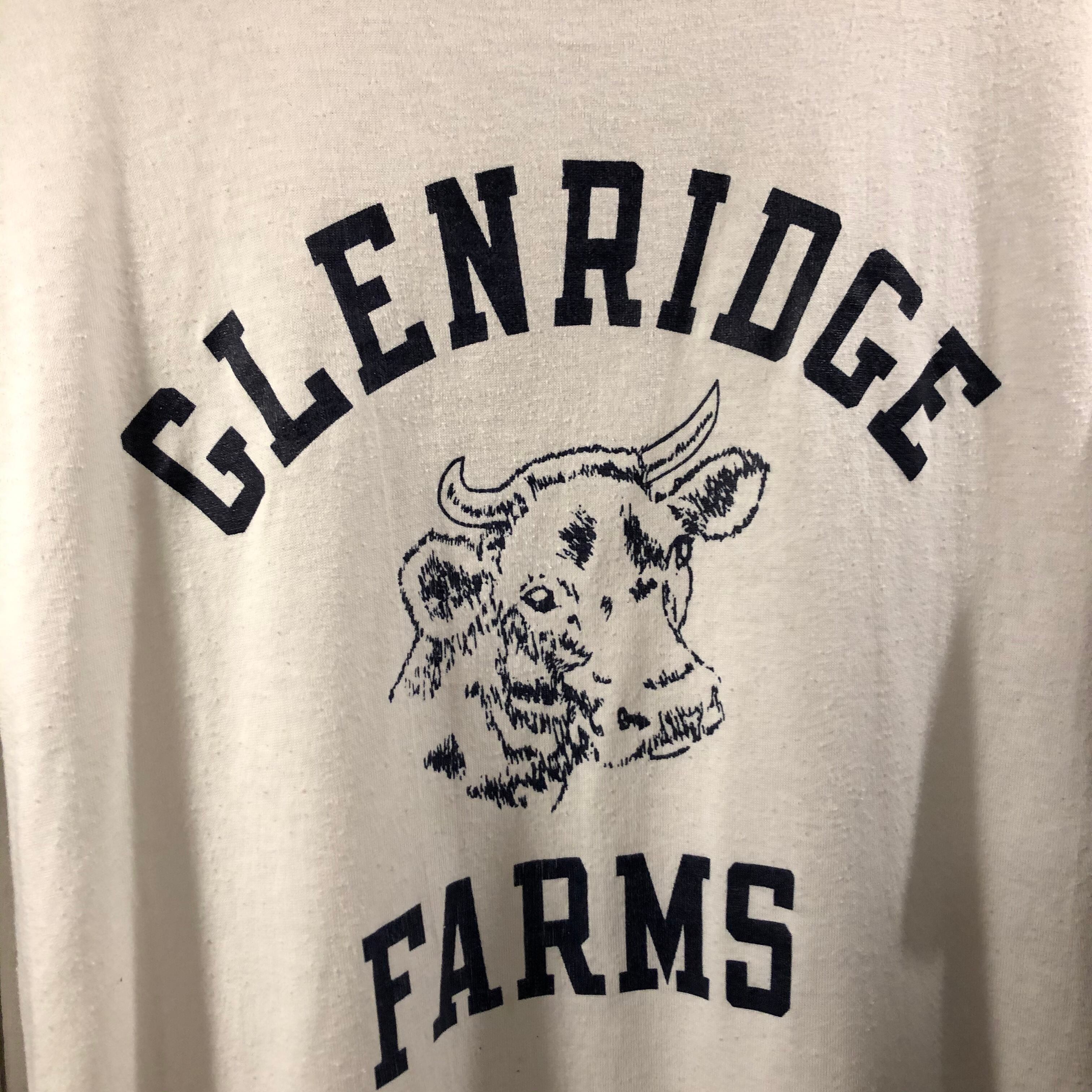 アメリカの牧場のプリントTシャツ。画像の通り、ネックやリブ部分が漂白のような色落ちがある。また、生地も、全体的に小さなネップ(毛玉)がある。