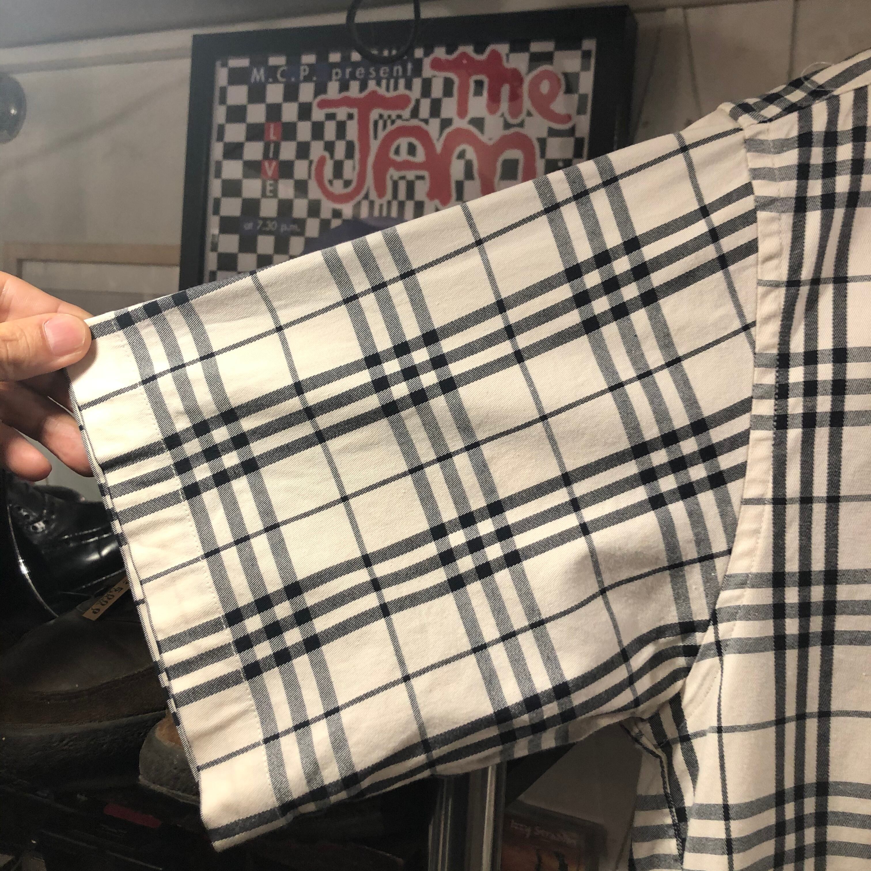 アイボリーカラーに黒のチェック柄のバーバリーのシャツ。スパンデックスという非常にストレッチ性の高い素材が含まれていて、個人的には、心地よい着心地だと思います。