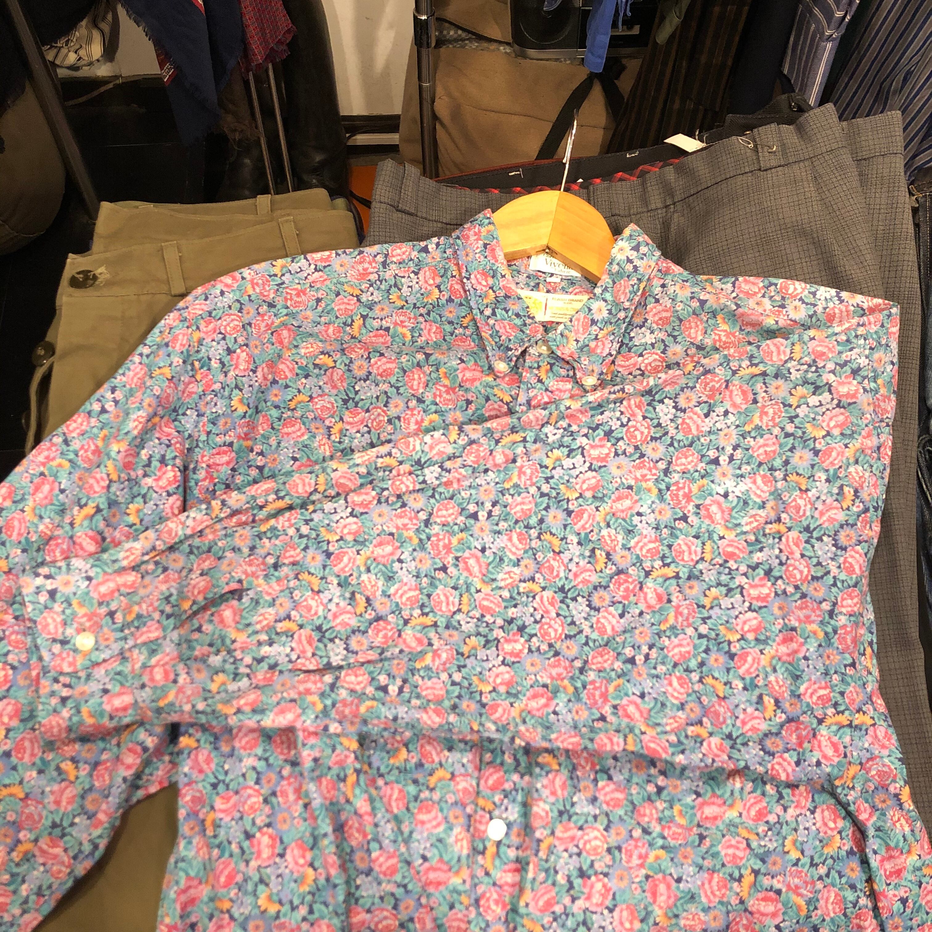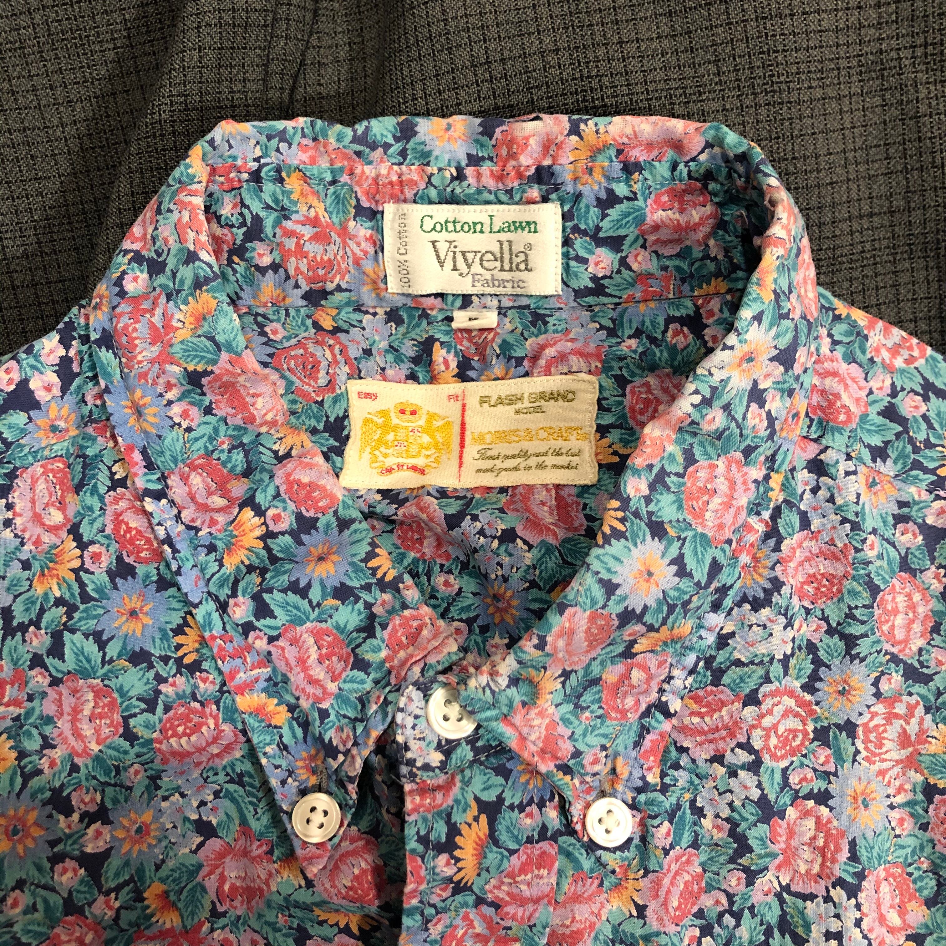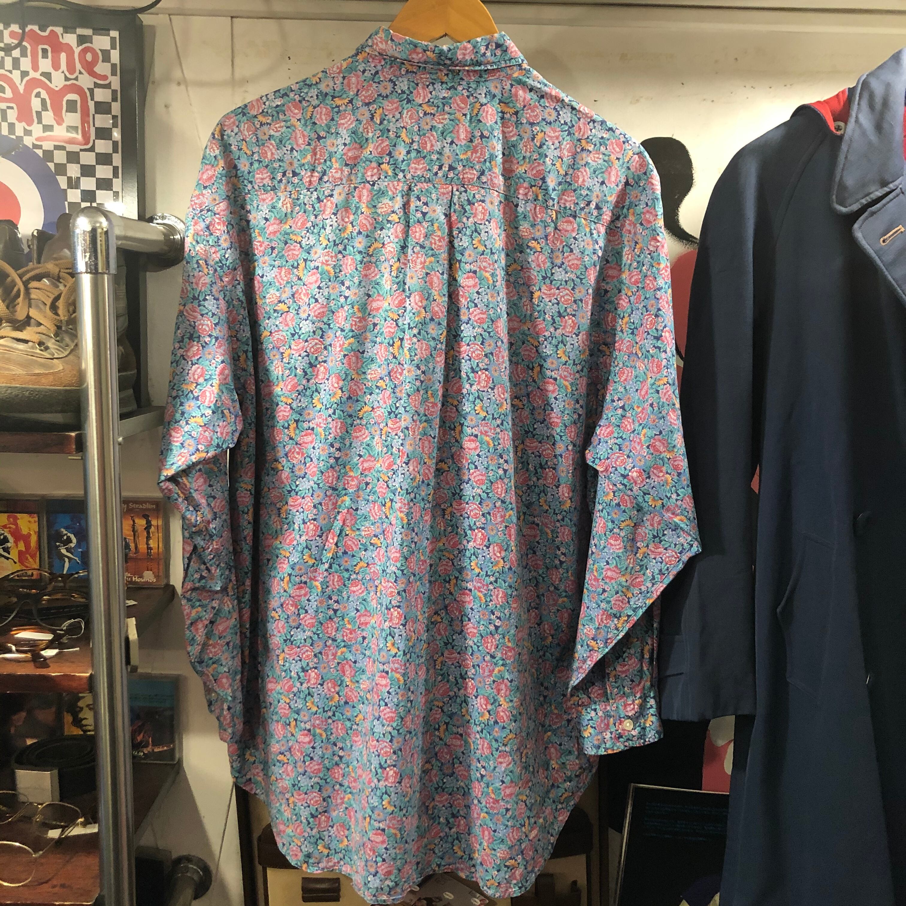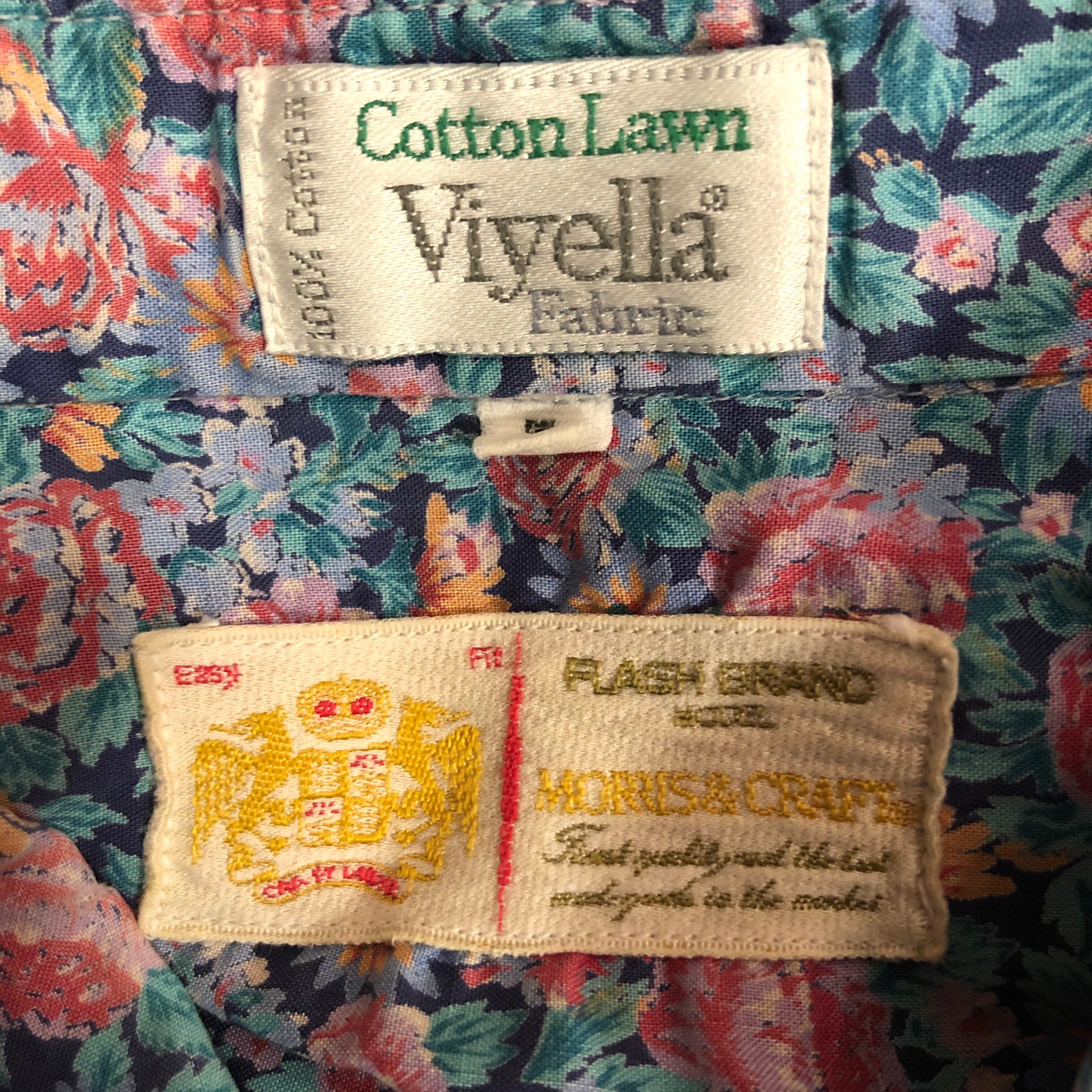 キメの細かくて、柔らかいコットンローン生地。発色のきれいなグリーン×紫×赤×ピンクなどの色彩豊かな花柄シャツ。サイズ表記は、5。
