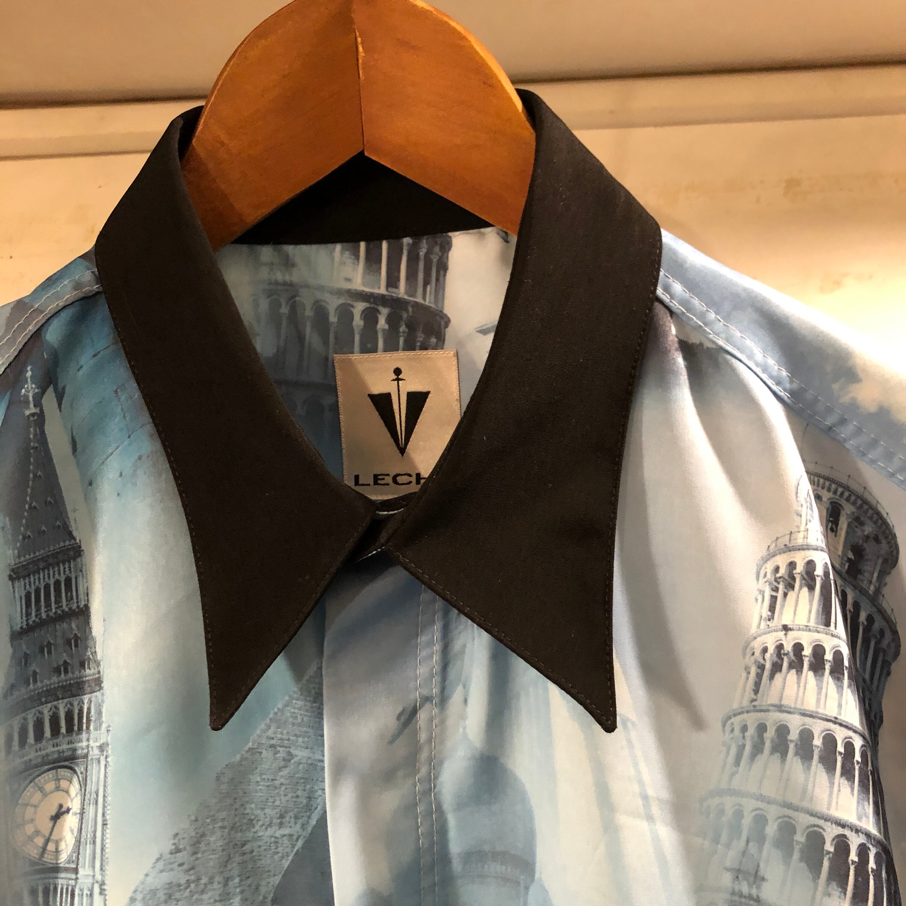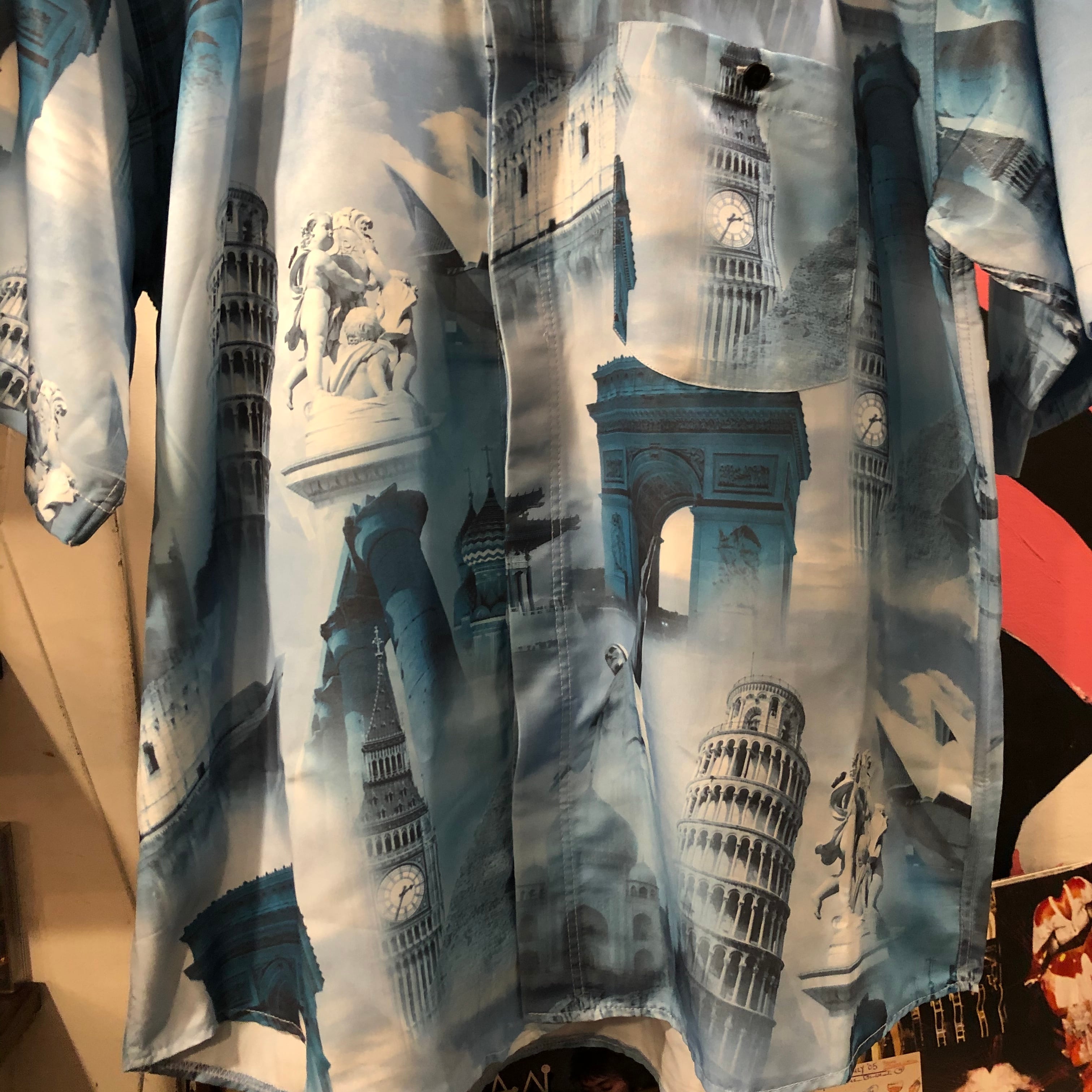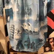 ピラミッド、ピサの斜塔、凱旋門、タージマハルなど、世界的に有名な建築物や場所がプリントされたユニークなシャツ。生産国や素材表記が不明だが、ツルっとしたポリエステルだと思います。