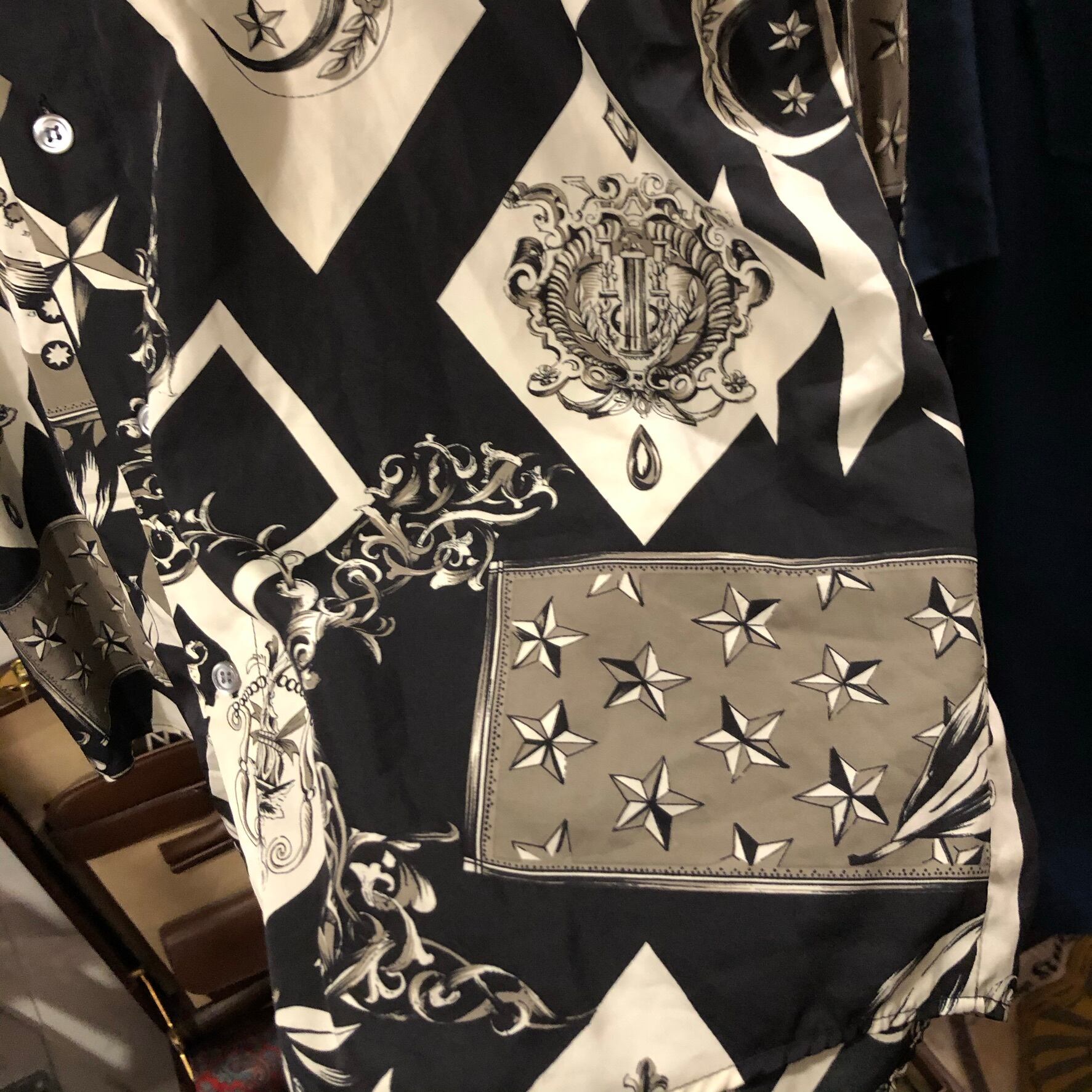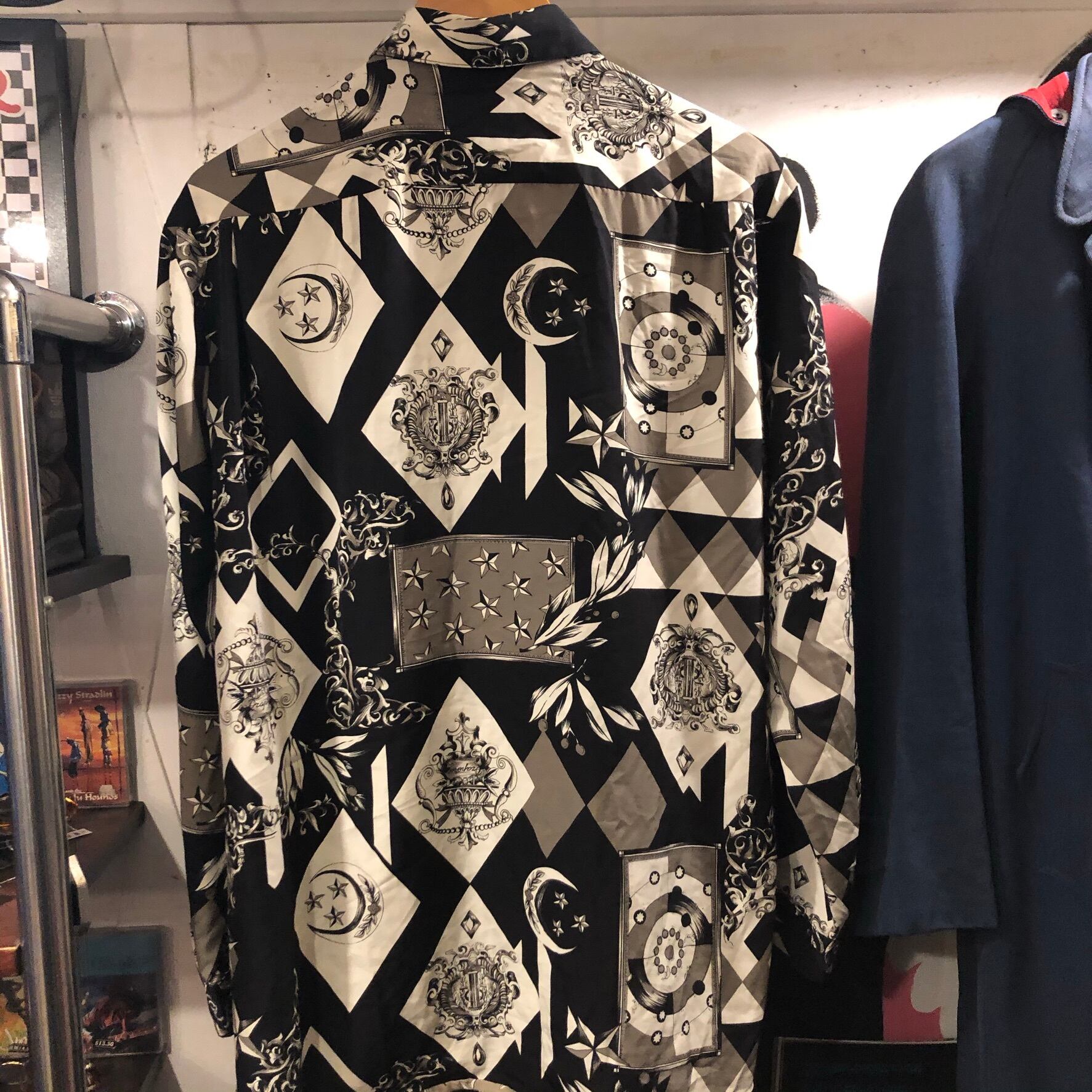 黒、白、グレーの総柄のポリシャツ。薄手のツルッとした肌触りのポリエステル生地を仕様。ジョジョの登場人物が着ていそうな柄。