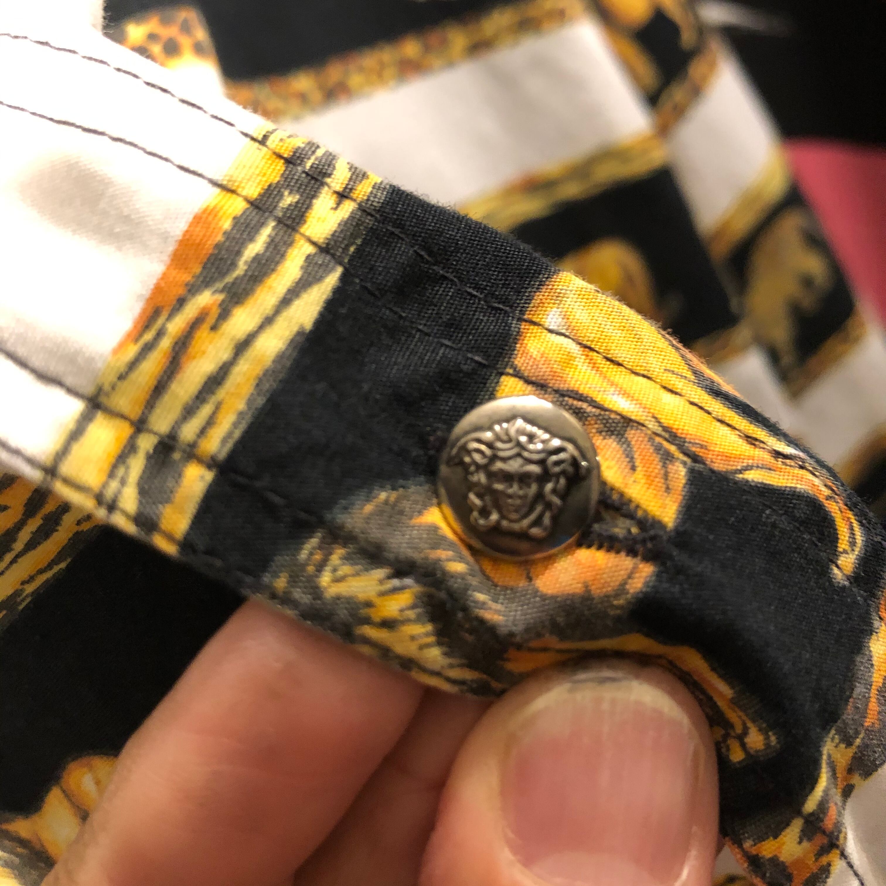 素材表記は、見当たりませんがコットンだと思います。メタルボタンは、ヴェルサーチのシンボルマークのメデューサがデザインされています。トップボタンが欠損しています。