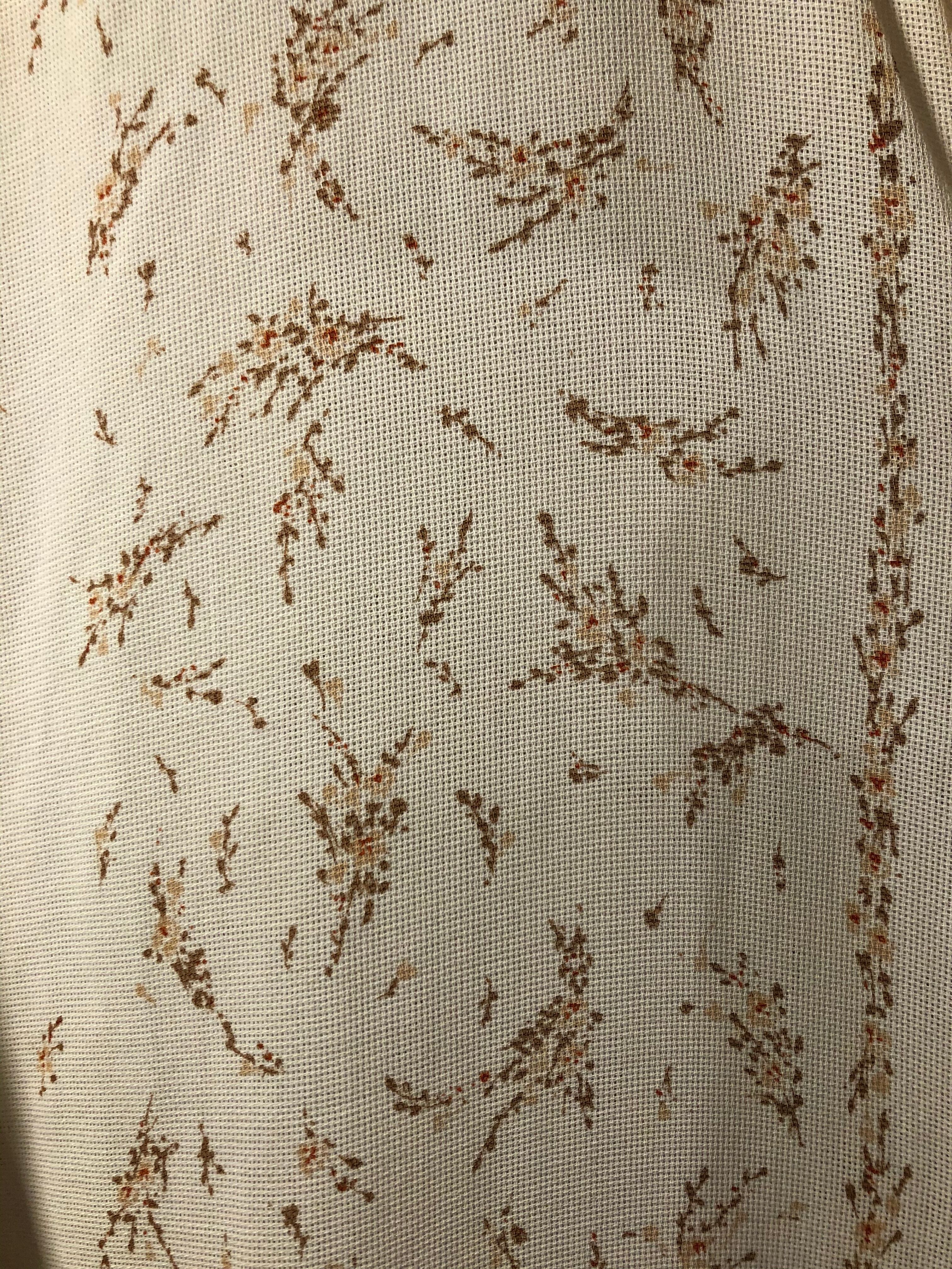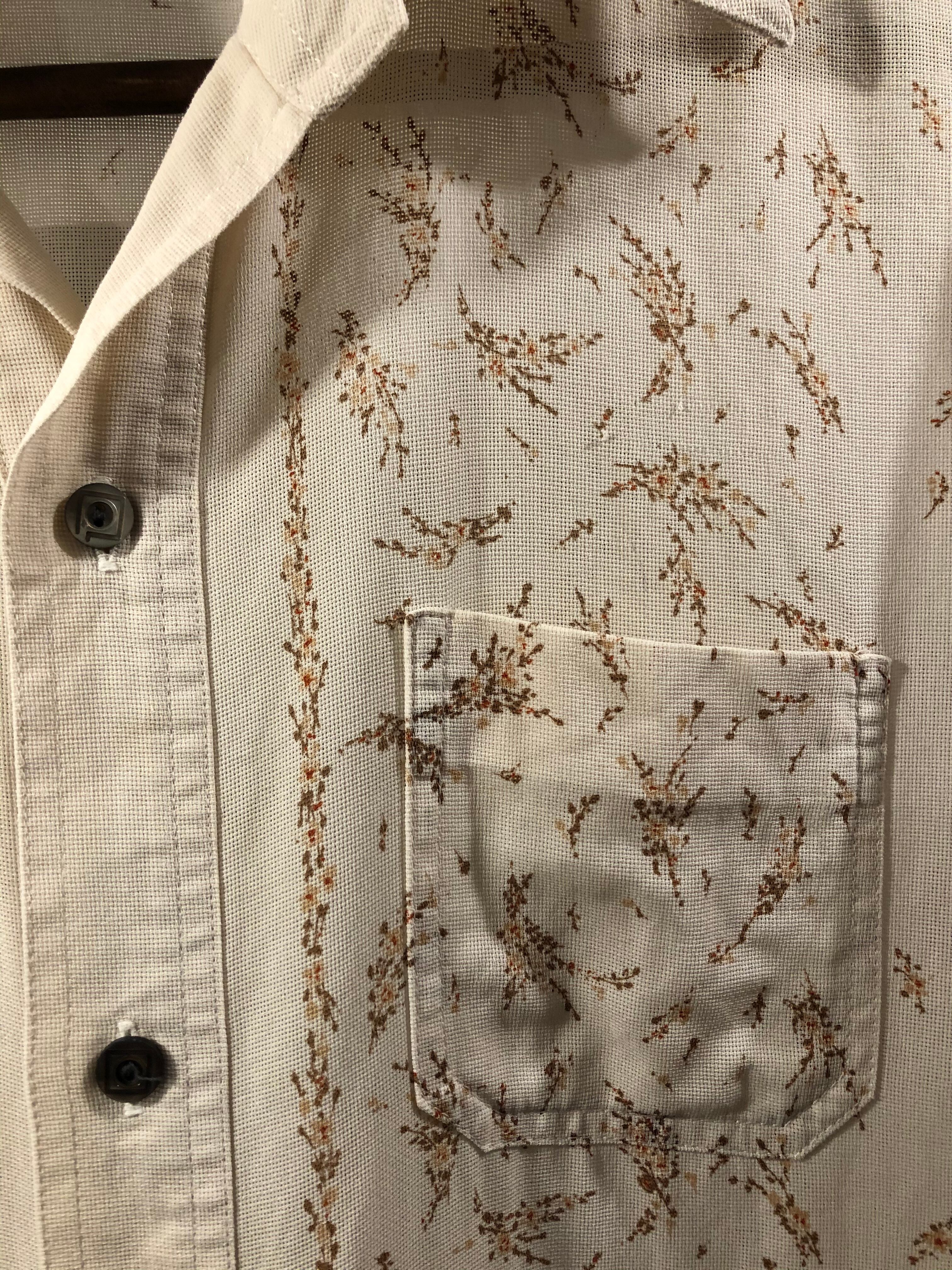 ベージュを主体にしたボディーに、渋めの草木柄。ドライタッチで、粗めに織り込まれた綿100%が通気性が良く快適だと思います。ボタンは、シェルボタンです。